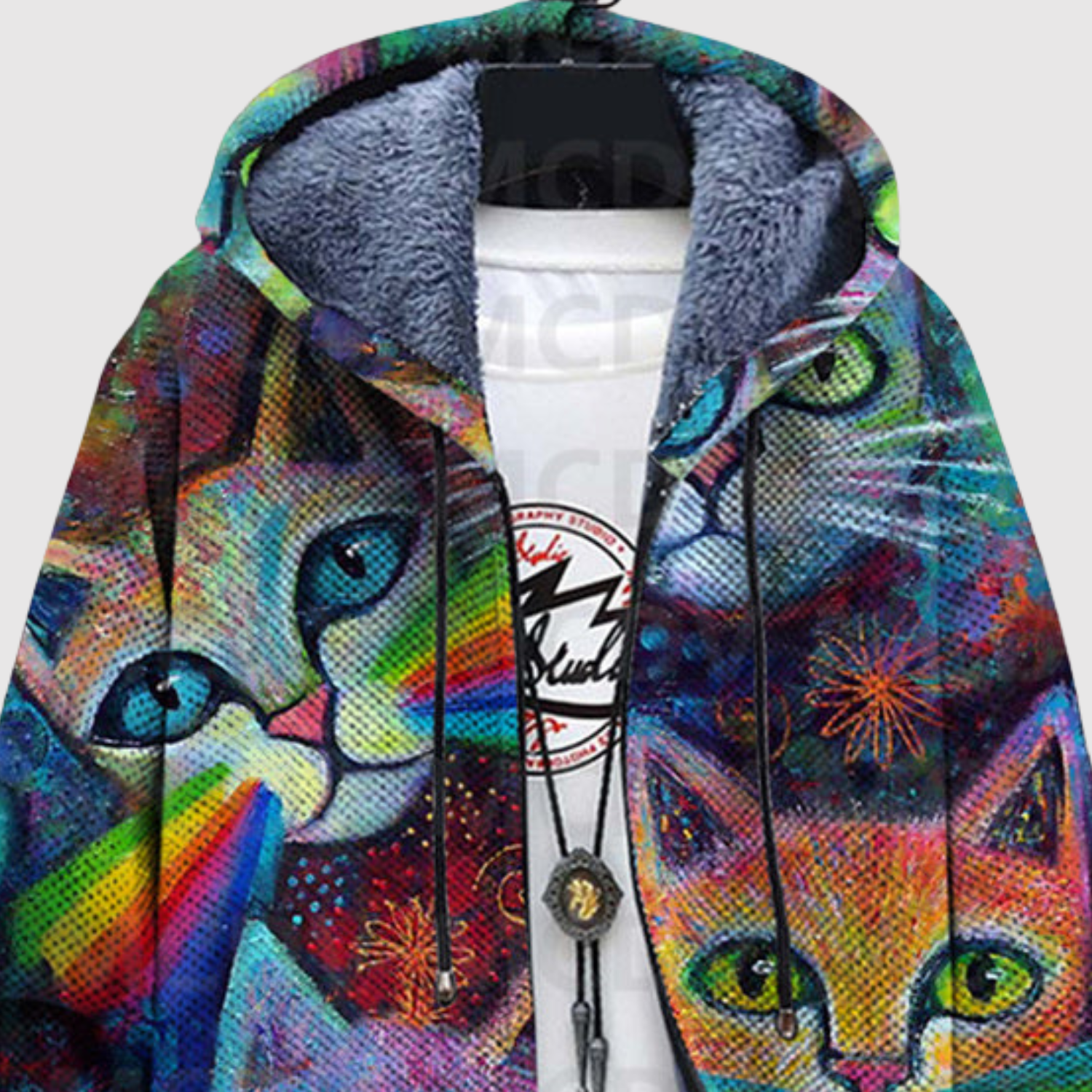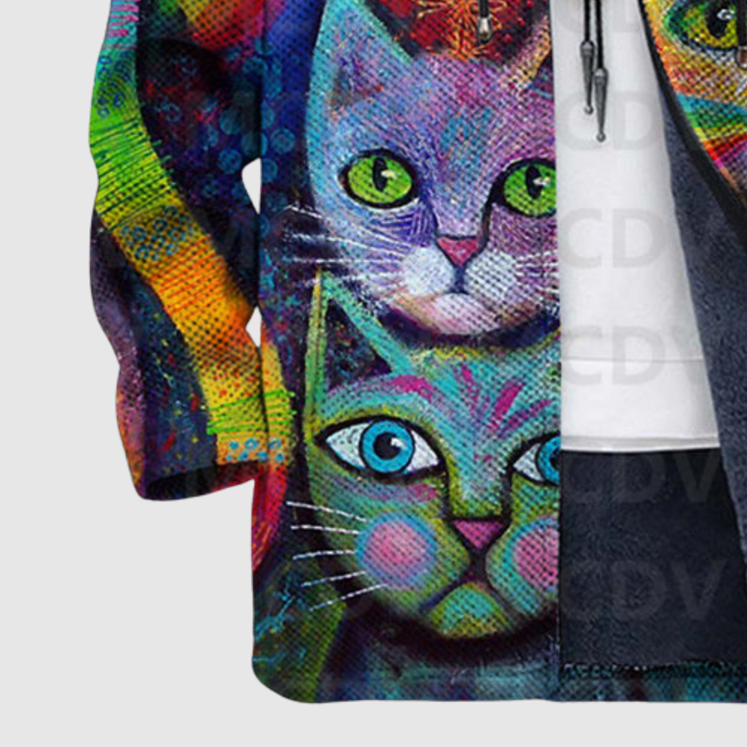 Този суичър комбинира изкуство и игра в уникален дизайн, изпълнен с цветове и котешки мотиви. Меката, топла вътрешност осигурява максимален комфорт, докато живите нюанси го правят привлекателен акцент в гардероба.
