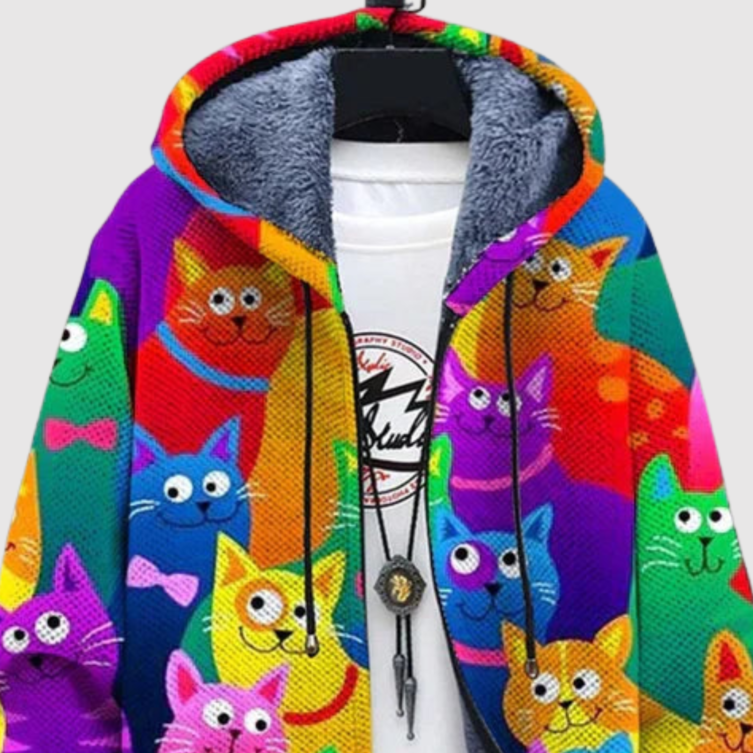 Този суичър внася цвят и хумор в ежедневието с цветния си котешки мотив. Меката, топла подплата осигурява максимален комфорт, докато забавният дизайн придава уникален и весел вид.