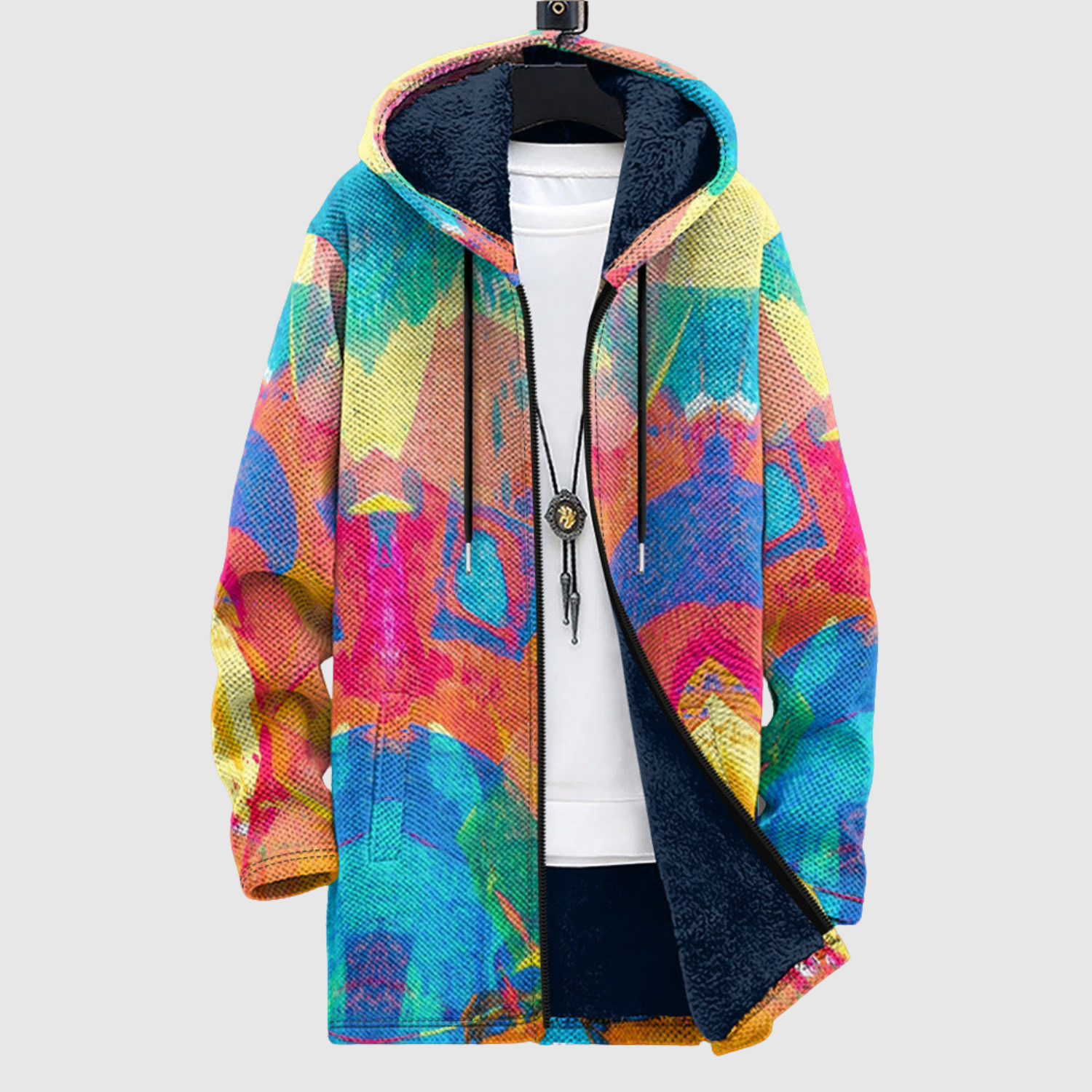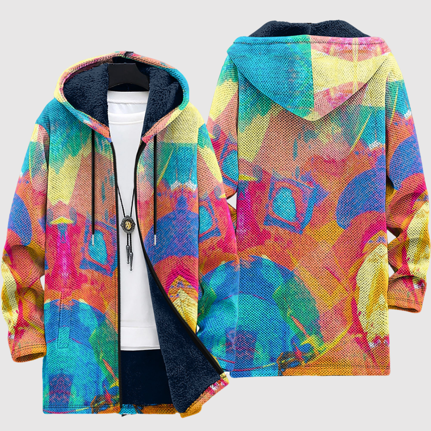 Тази худи съчетава меки преходи и силни цветови тонове в съвременен, абстрактен дизайн. Тя е перфектна за вас, които обичате креативността и комфорта – привлекателна за всеки ден и свободно време.