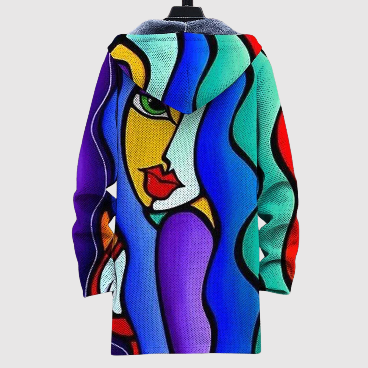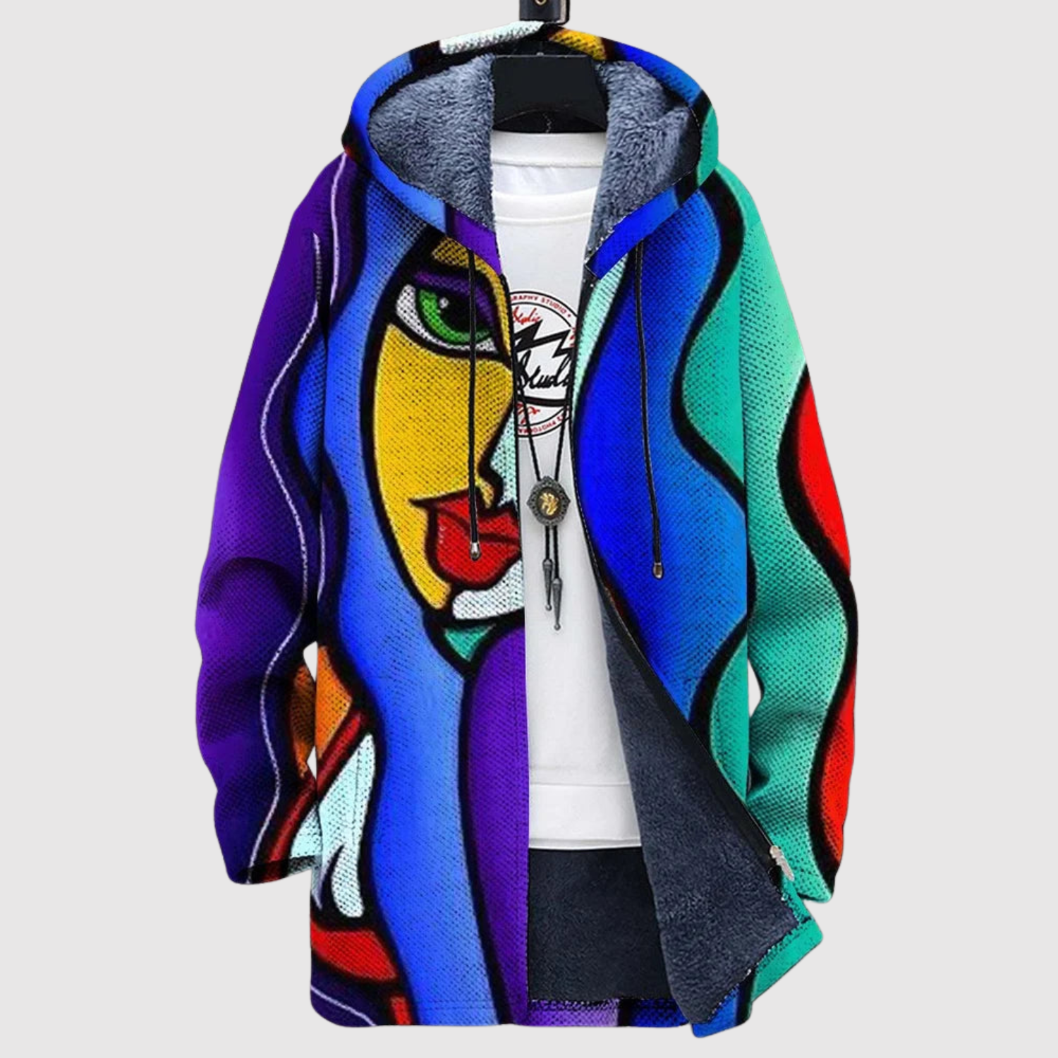 Тази худи комбинира силни цветове и артистични форми в абстрактно лицево изображение, което излъчва личност и свобода. Меката, топла подплата я прави перфектна за ежедневие и спокойни моменти с стил.