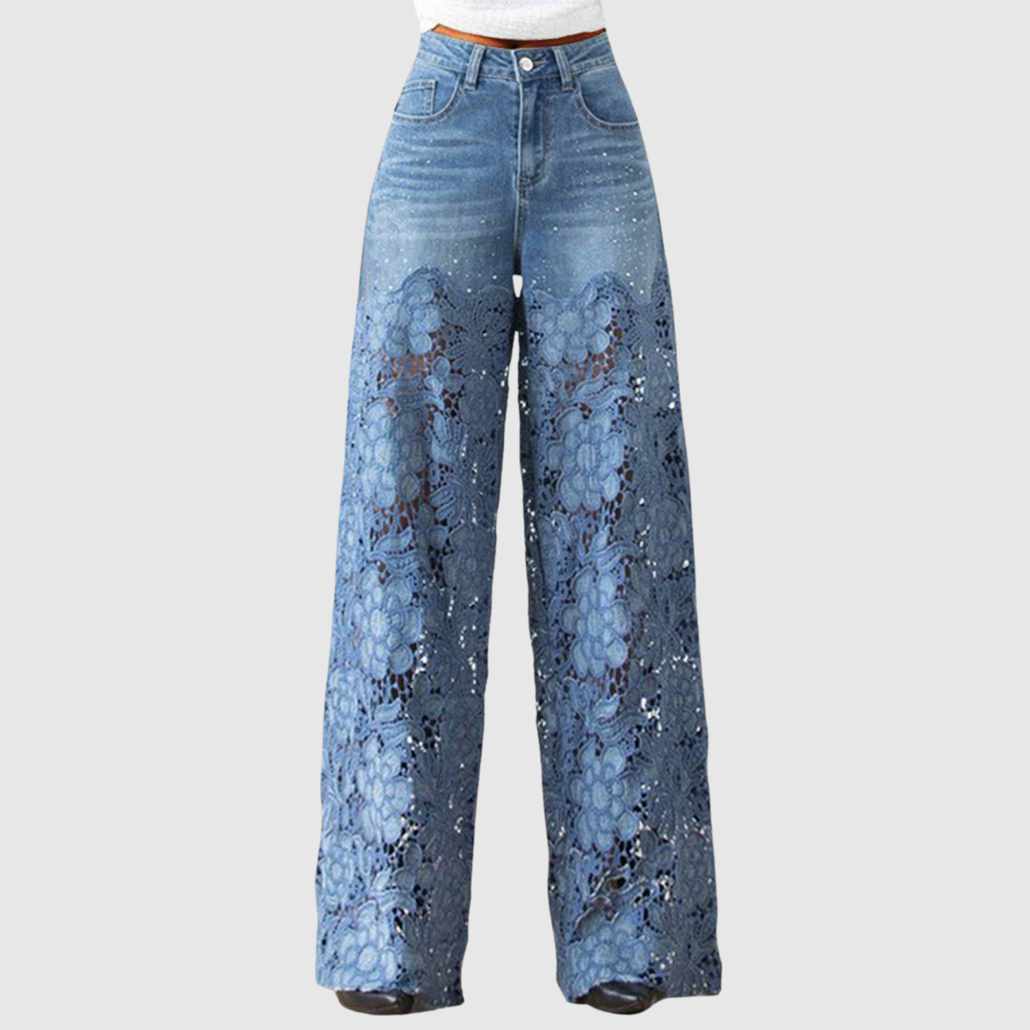 Тези дънки комбинират класически деним с красиви цветни бродерии, които придават женствено и артистично излъчване. Широкият силует осигурява комфорт и свобода на движението, перфектни както за ежедневно носене, така и за специални поводи.