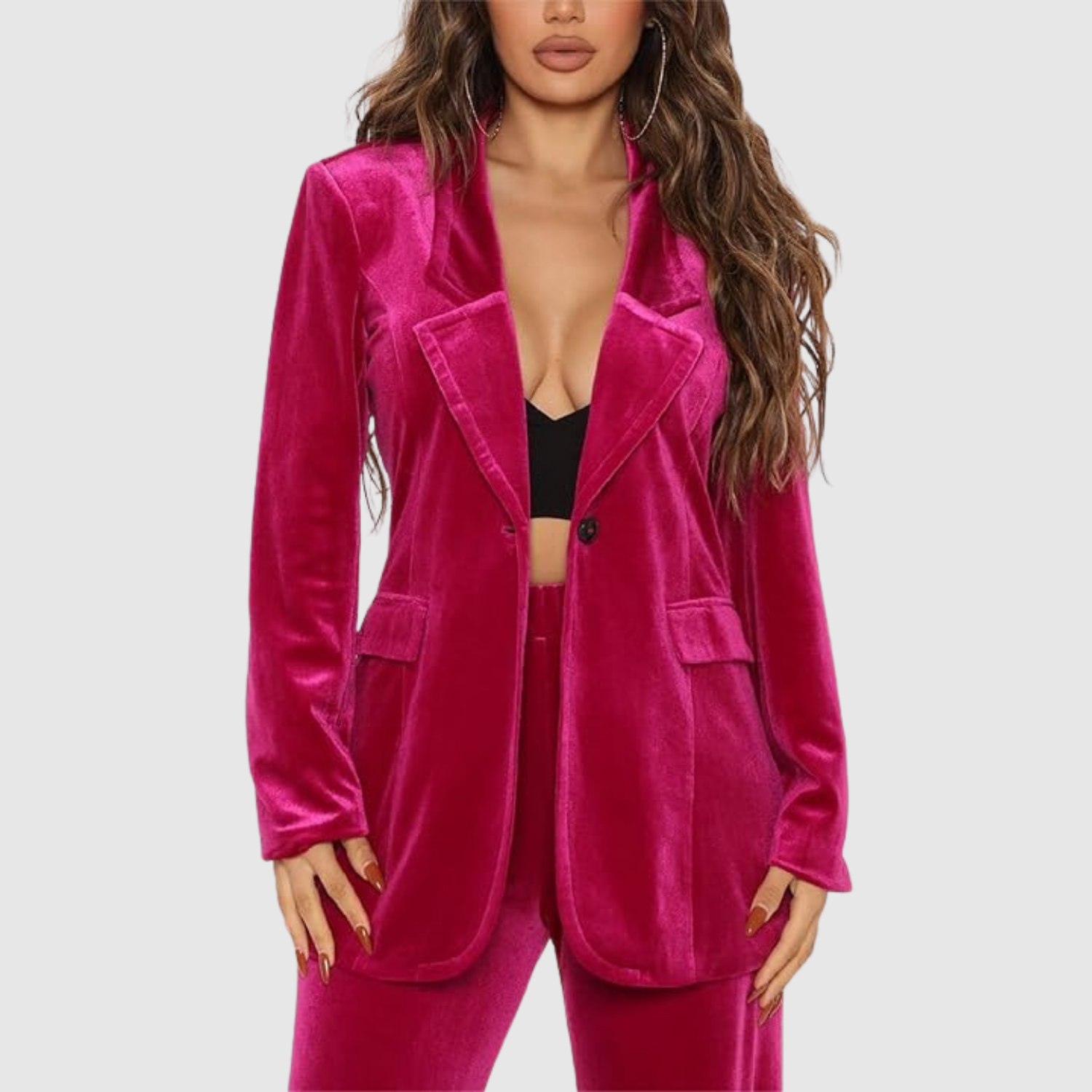 Този блейзър от мек велур съчетава блясък с модерна елегантност. Перфектен за специални поводи или когато искаш да повдигнеш ежедневния си аутфит с луксозен акцент.
