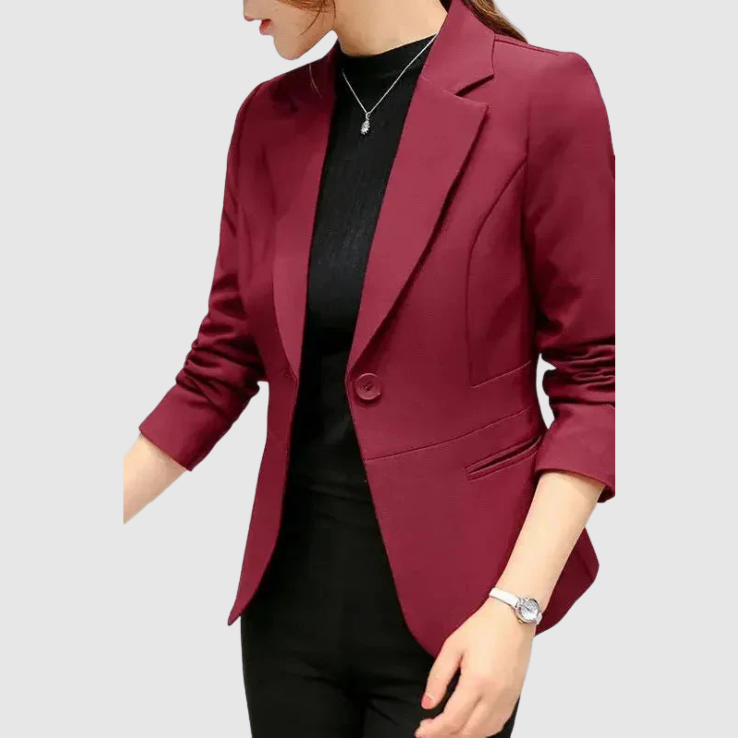 Този блейзър комбинира класическо кроене с модерен силует. Фигуралената силуета придава професионален вид, идеален както за работа, така и за по-официални поводи.