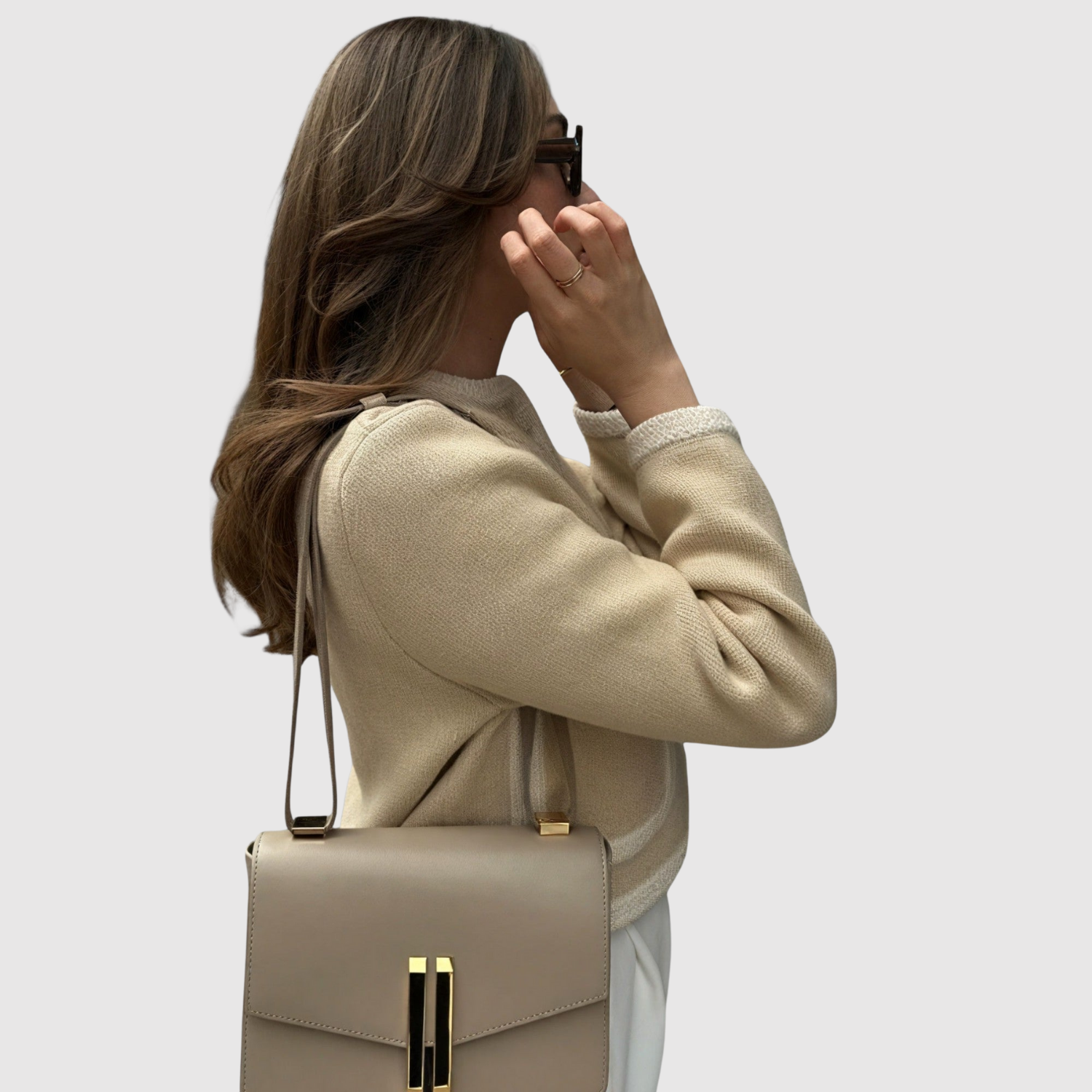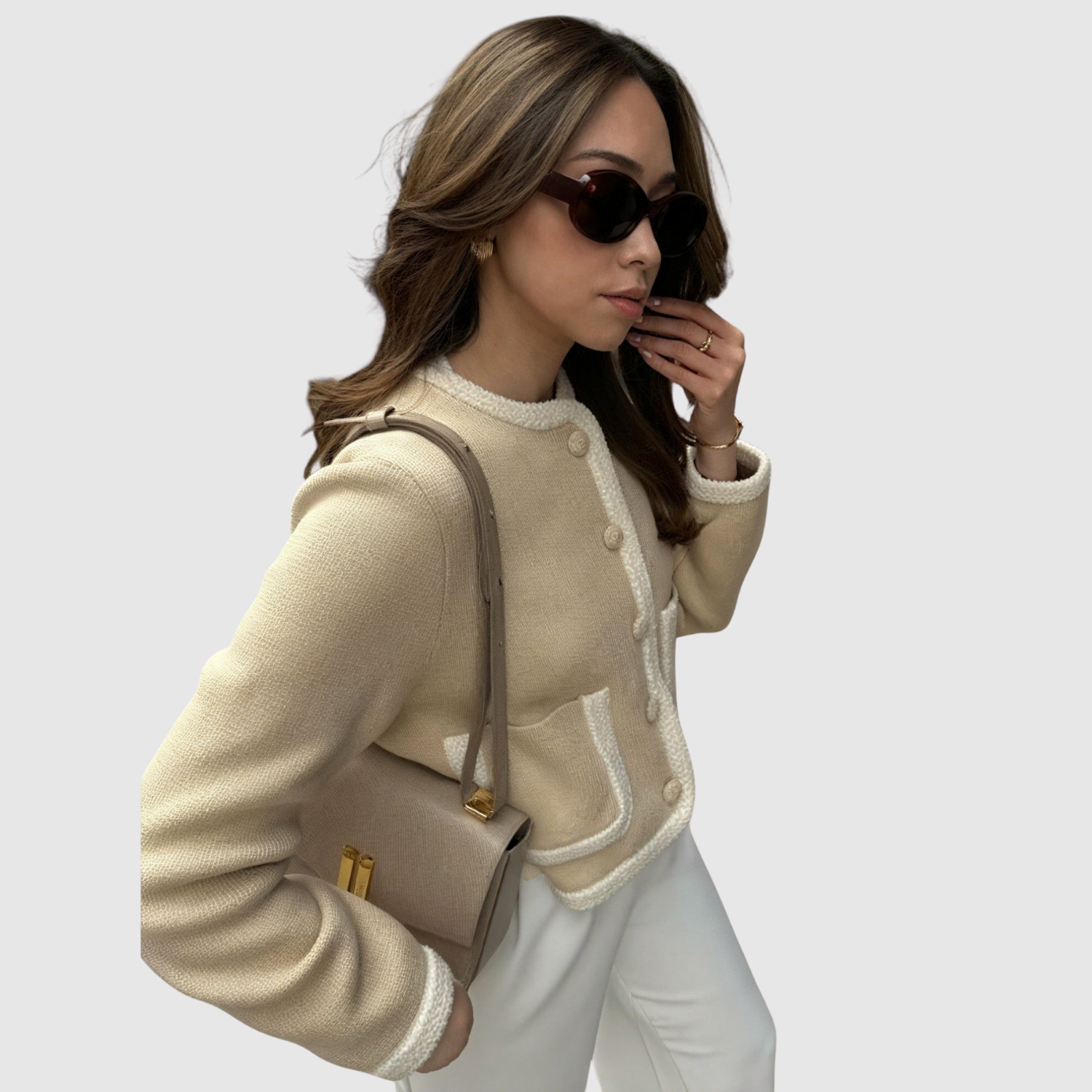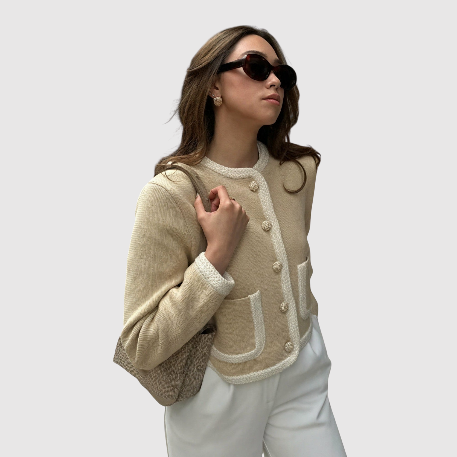 Това късо букле яке комбинира вечна елегантност с модни детайли. Контрастните кантове и декоративните джобове придават изискан и ексклузивен вид, идеален както за ежедневието, така и за специални поводи.
