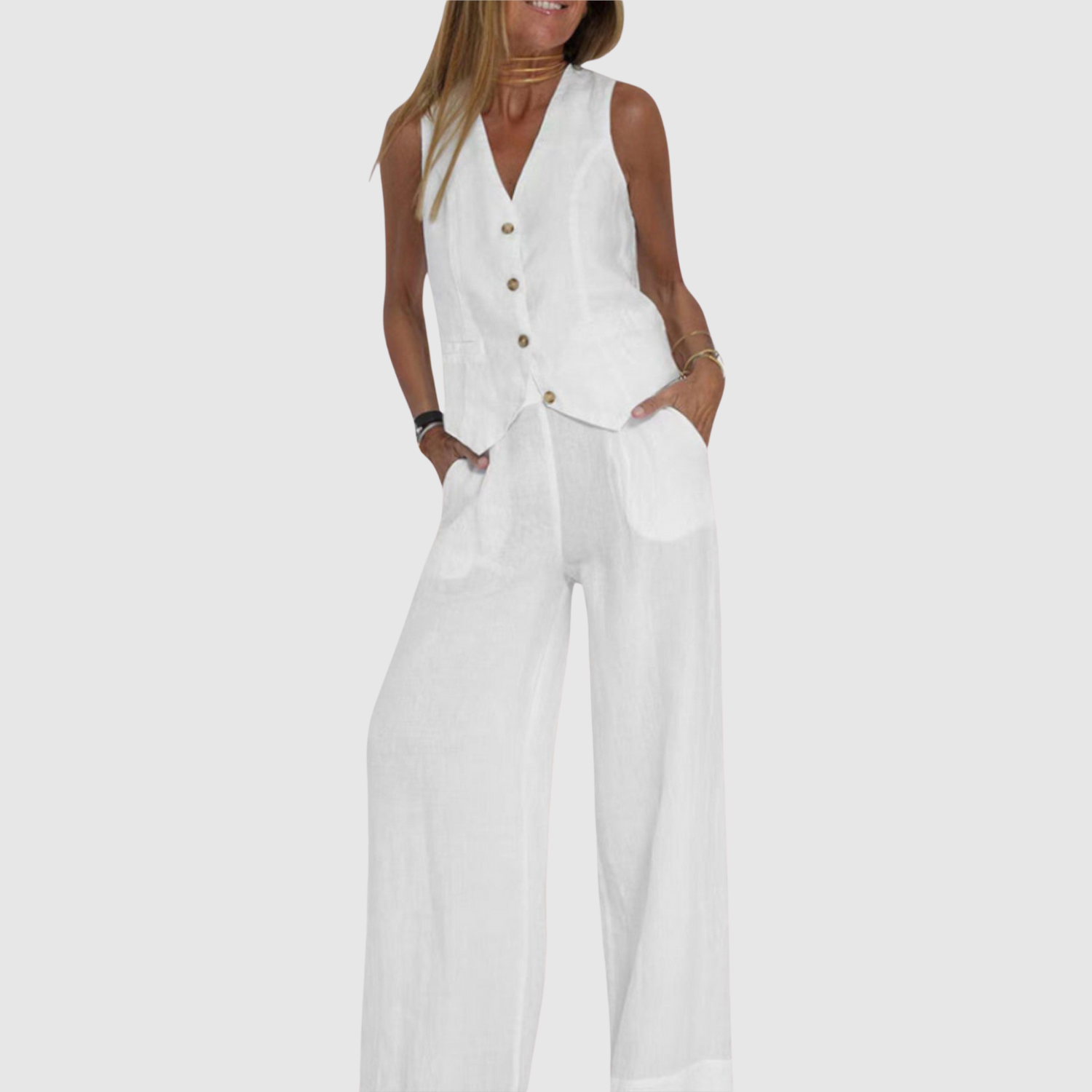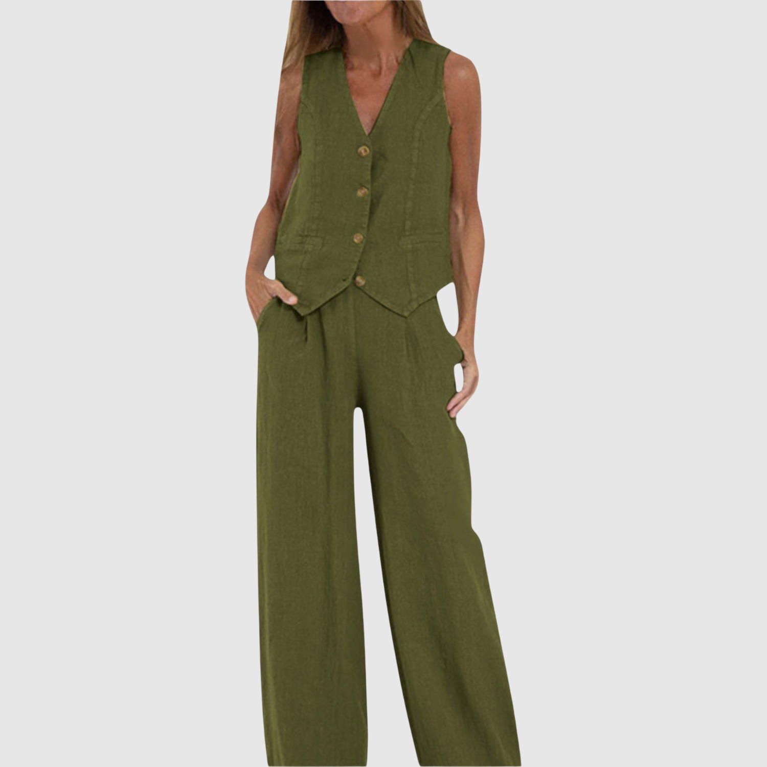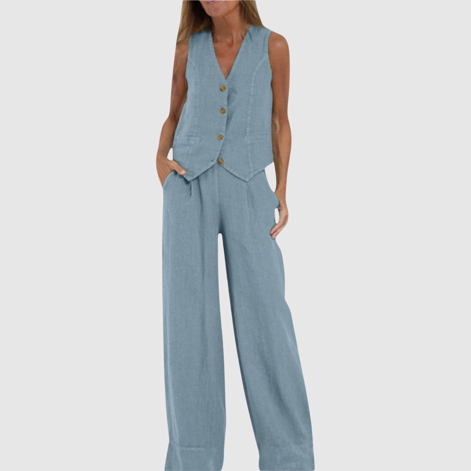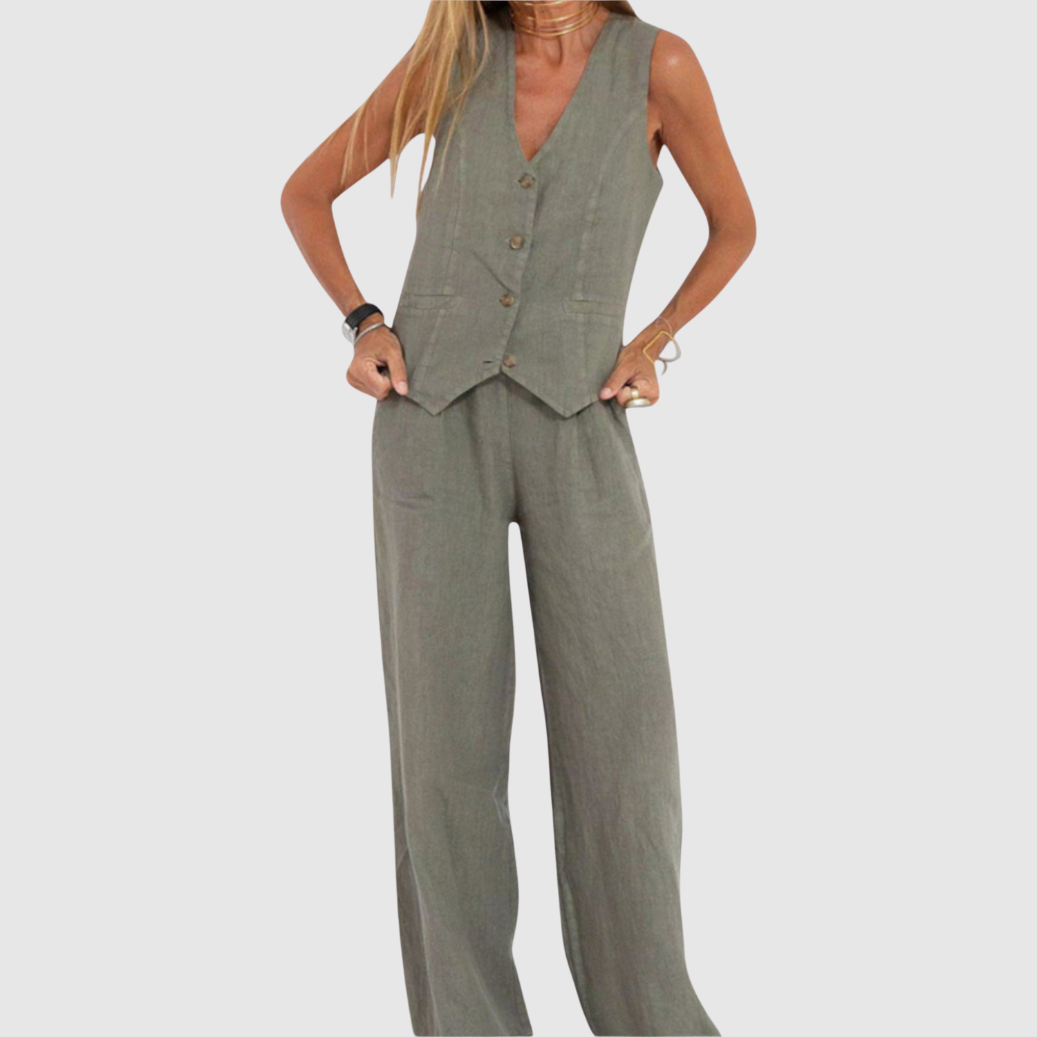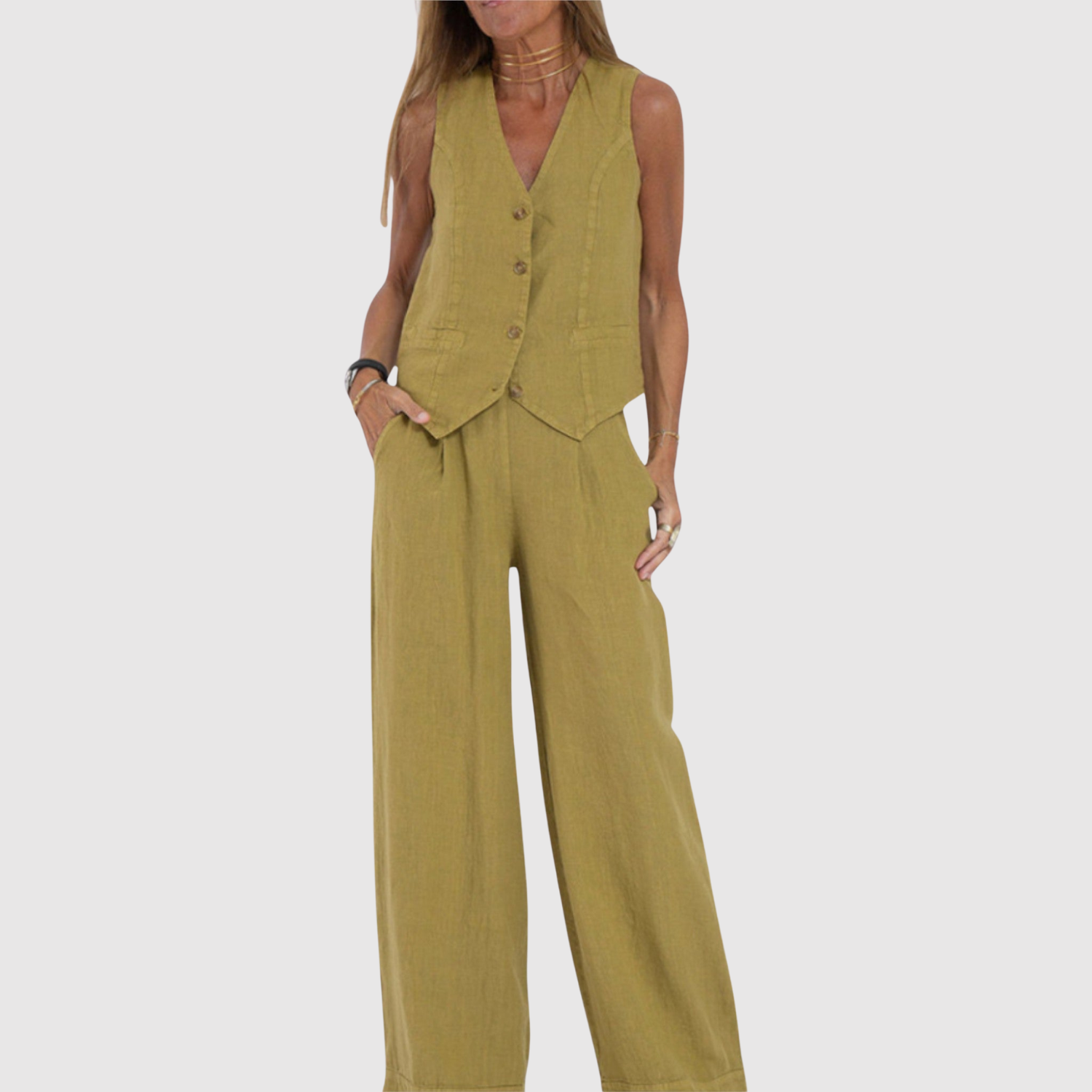 Шикозно комплект с безръкавна жилетка и съответстващи панталони от лек материал. Перфектно за горещи дни, когато комфортът и стилът вървят ръка за ръка. С модерно кроене, то придава изискан, но небрежен вид.