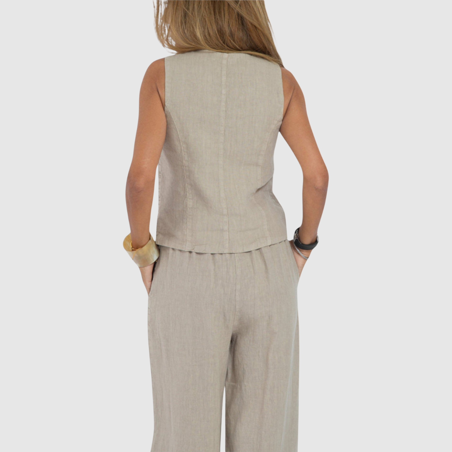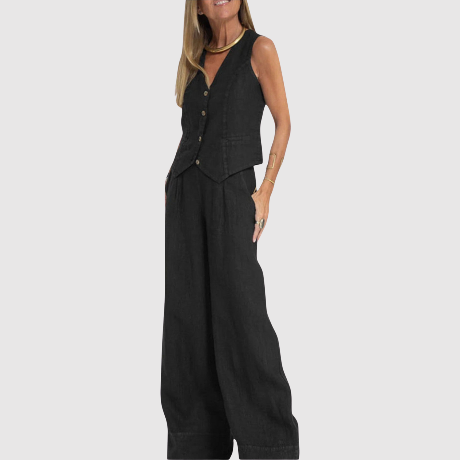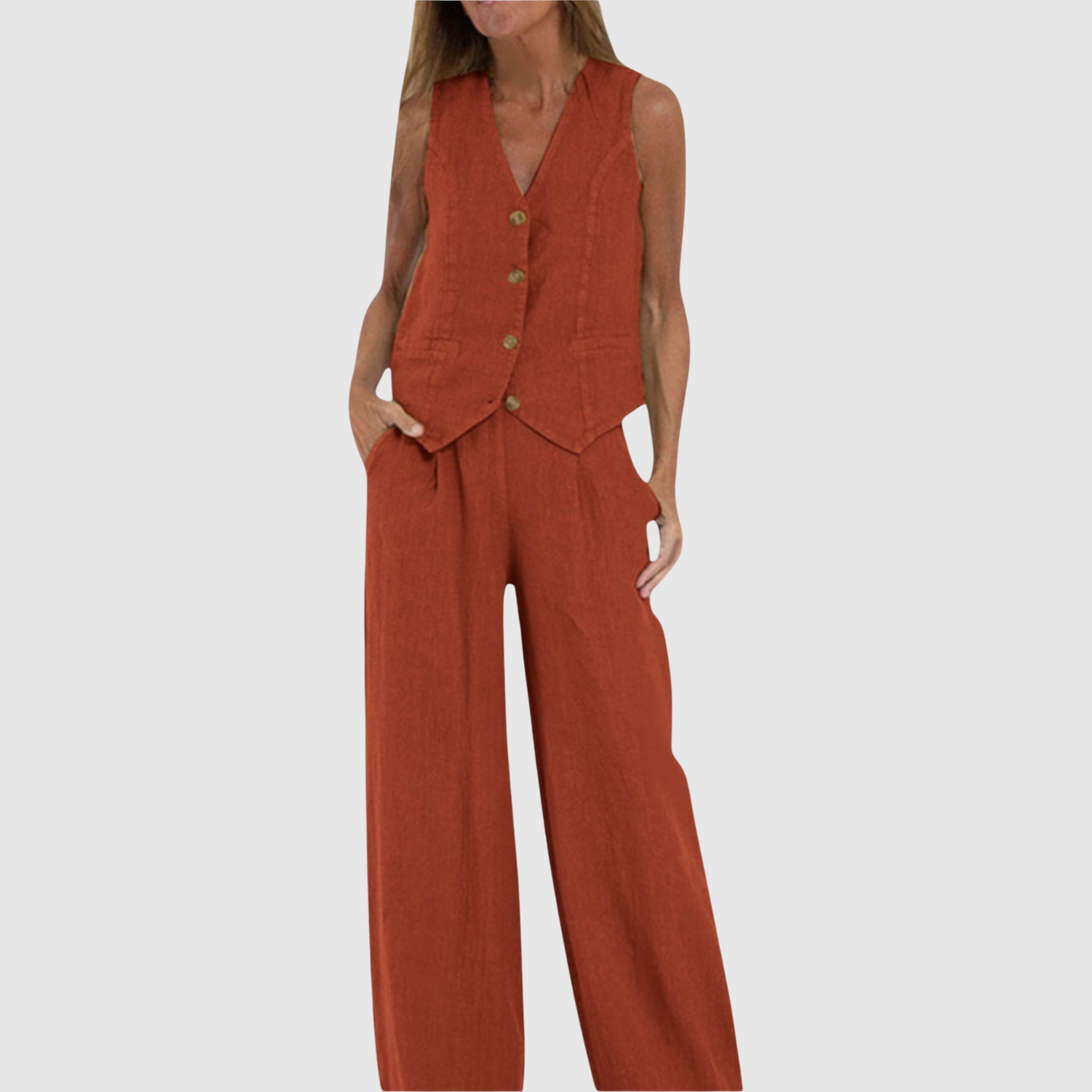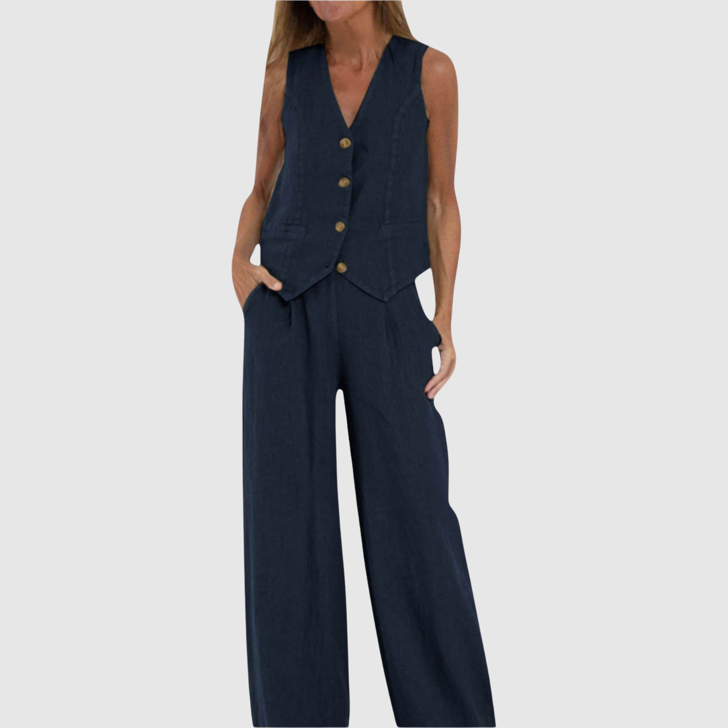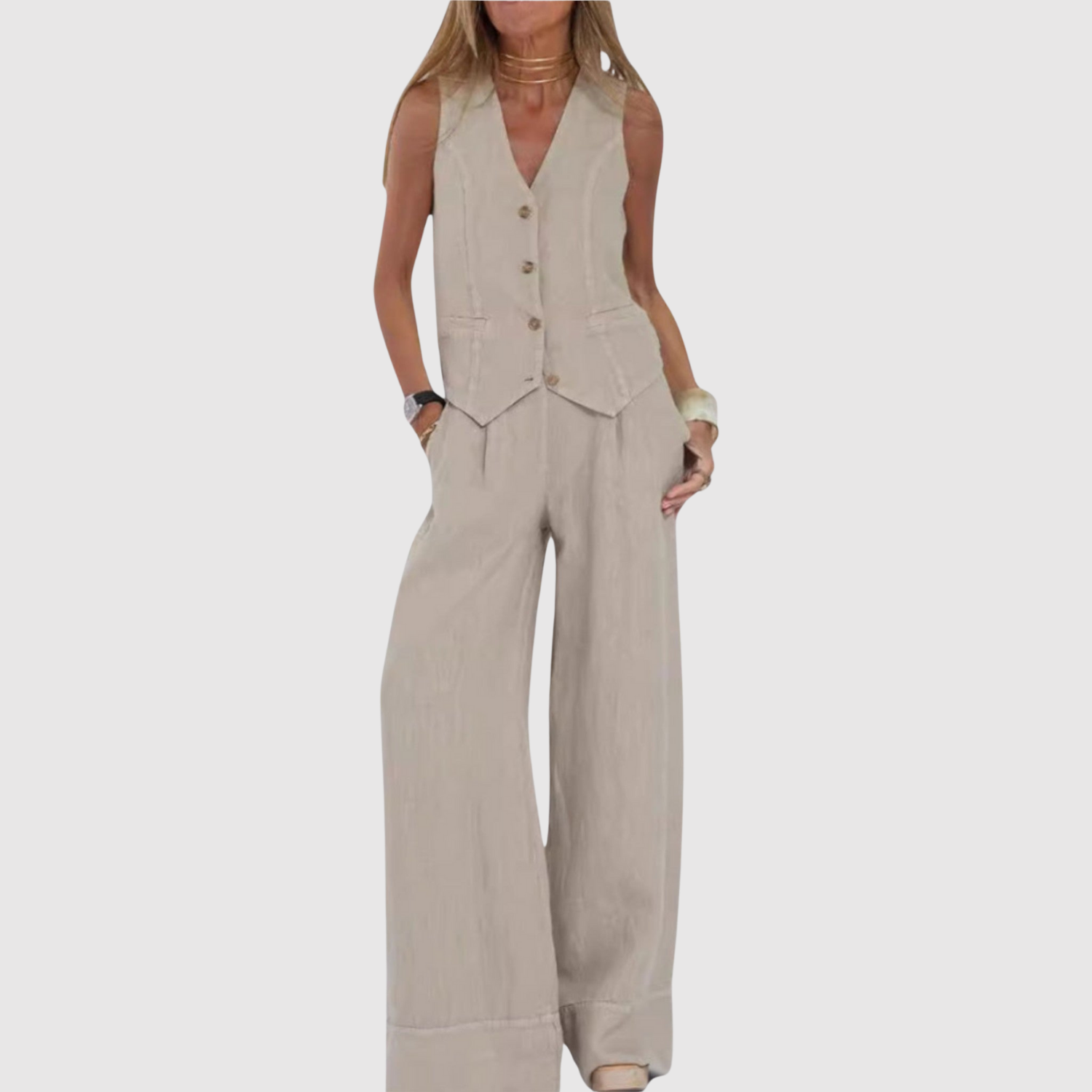 Шикозно комплект с безръкавна жилетка и съответстващи панталони от лек материал. Перфектно за горещи дни, когато комфортът и стилът вървят ръка за ръка. С модерно кроене, то придава изискан, но небрежен вид.