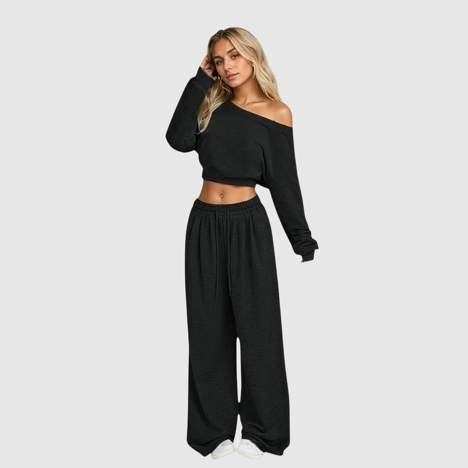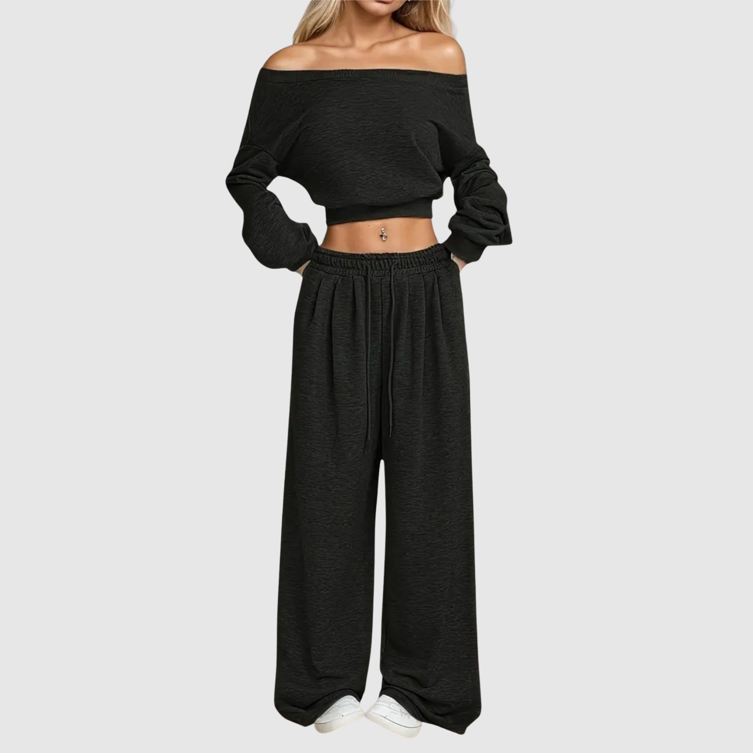 Модерен двусъставен комплект с горна част с открити рамене и широки панталони, създаден да комбинира неформален стил с изискана елегантност. Материята е лека и приятна, което прави комплекта идеален както за ежедневието, така и за вечерни поводи.