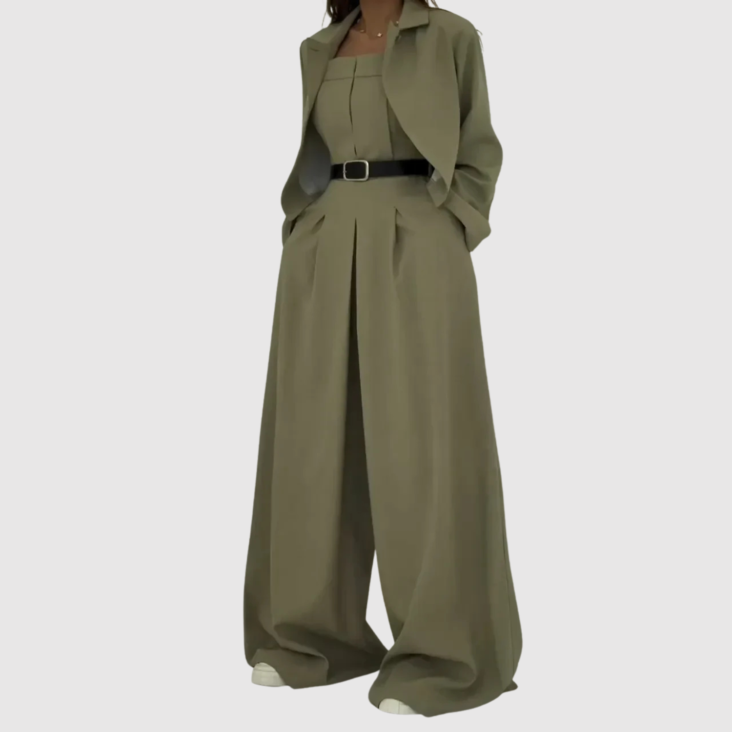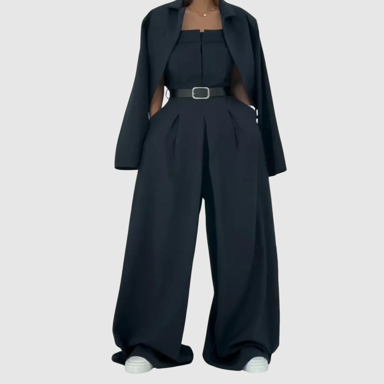 Гащеризонът Анна е перфектен избор както за работа, така и за вечерни събития. Той комбинира фигурално бюстие с къс блейзър, който подчертава силуета по елегантен и уверено начин. Материята има леко разтягане, което осигурява комфорт през целия ден, а детайлът с колан добавя щрих на изискана стил.