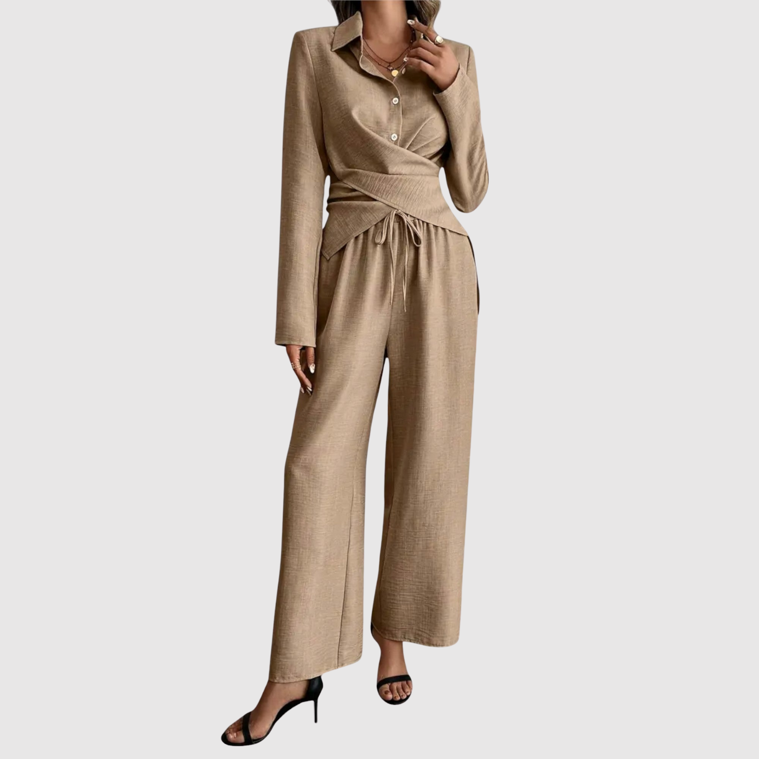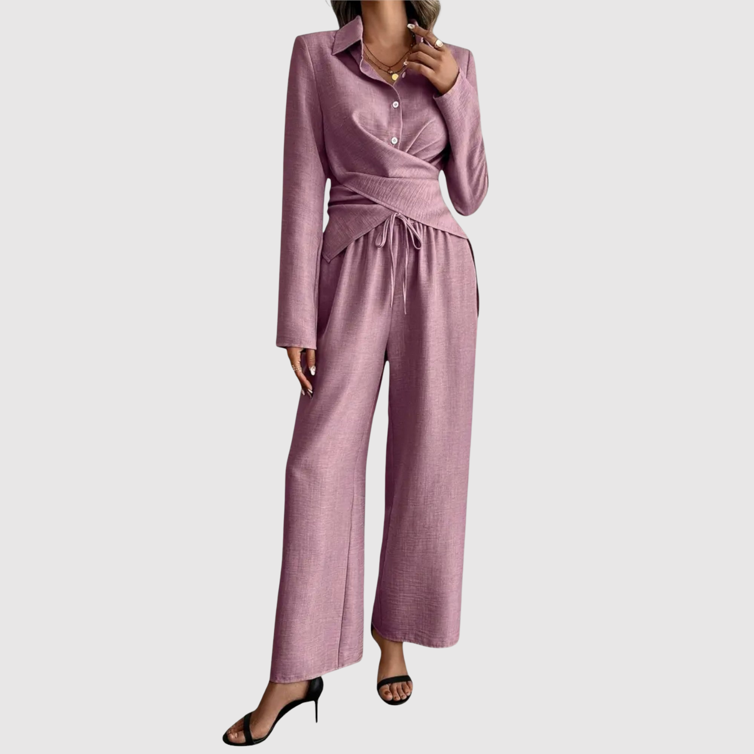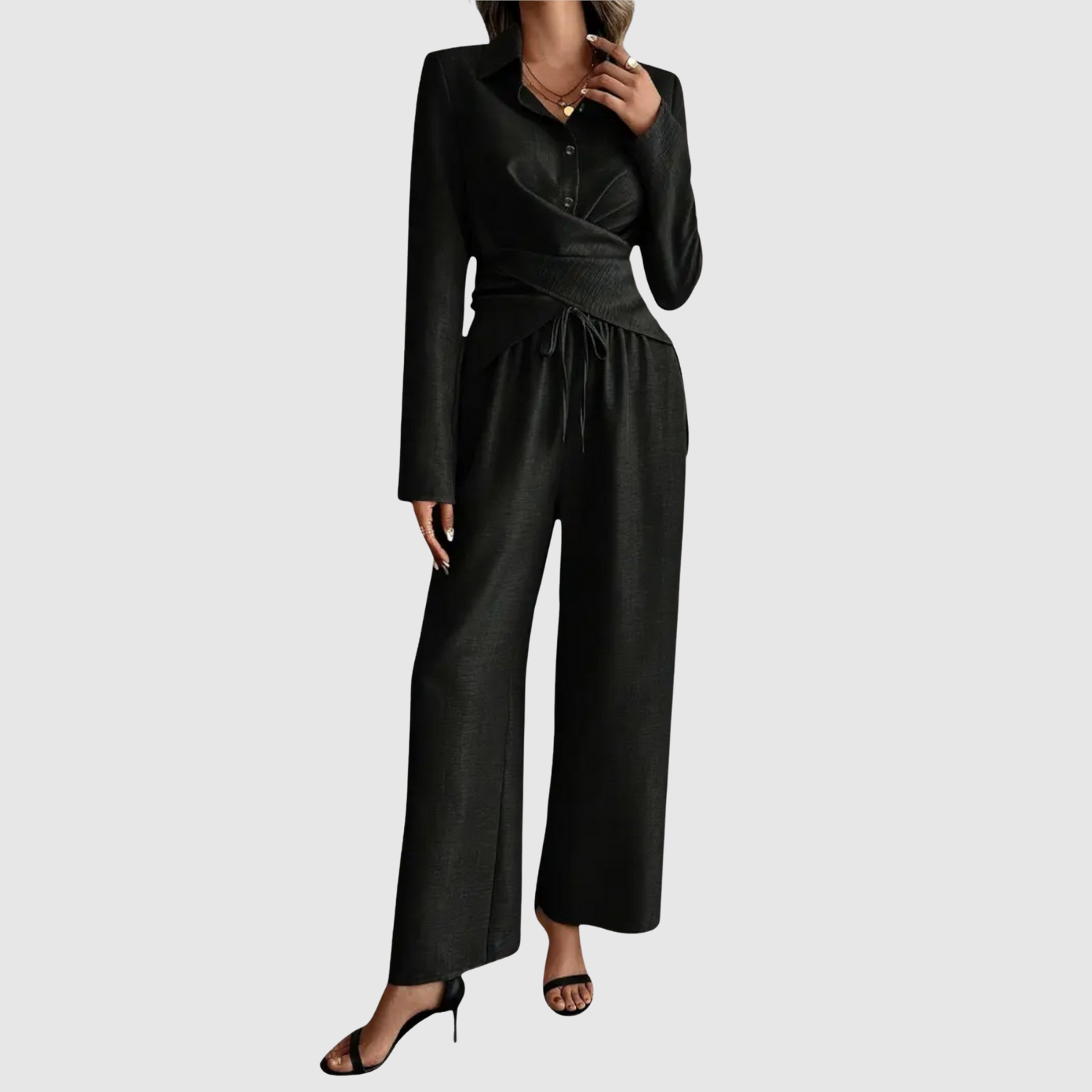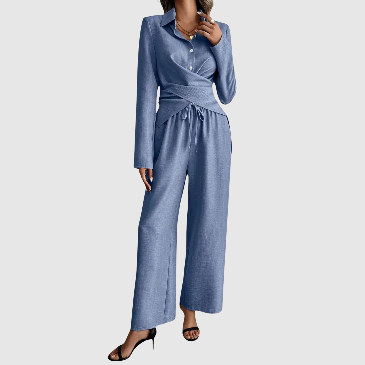 Виктория – Елегантен комплект с завързваща се блуза и панталони