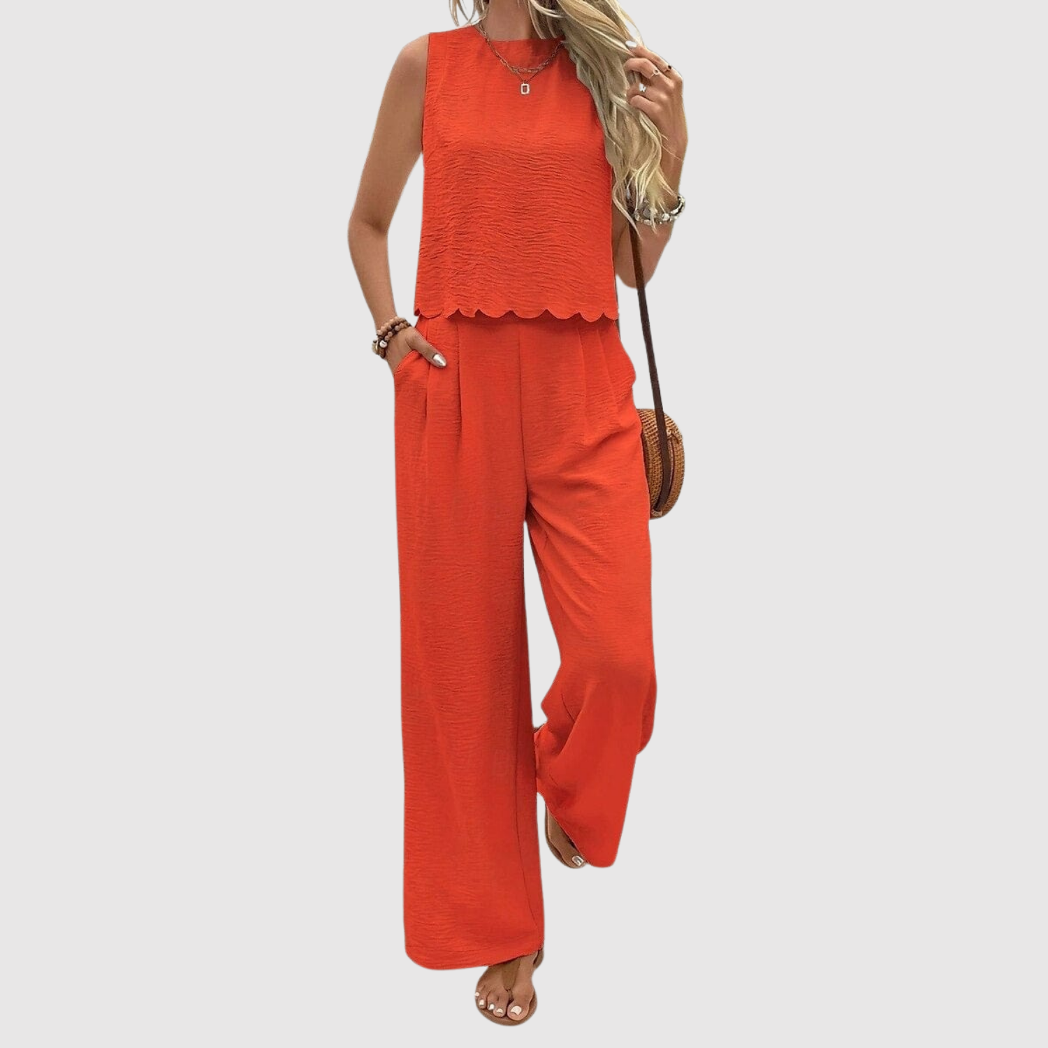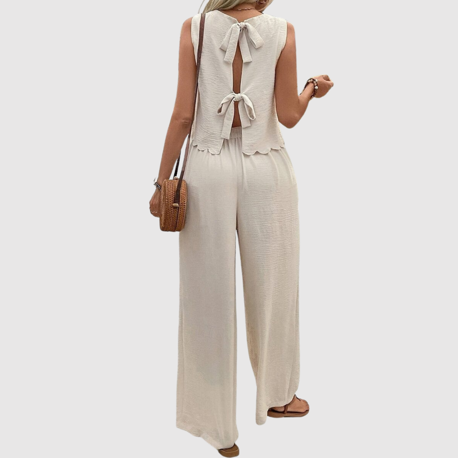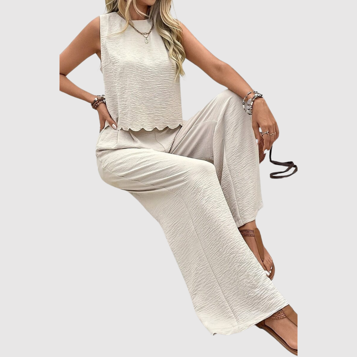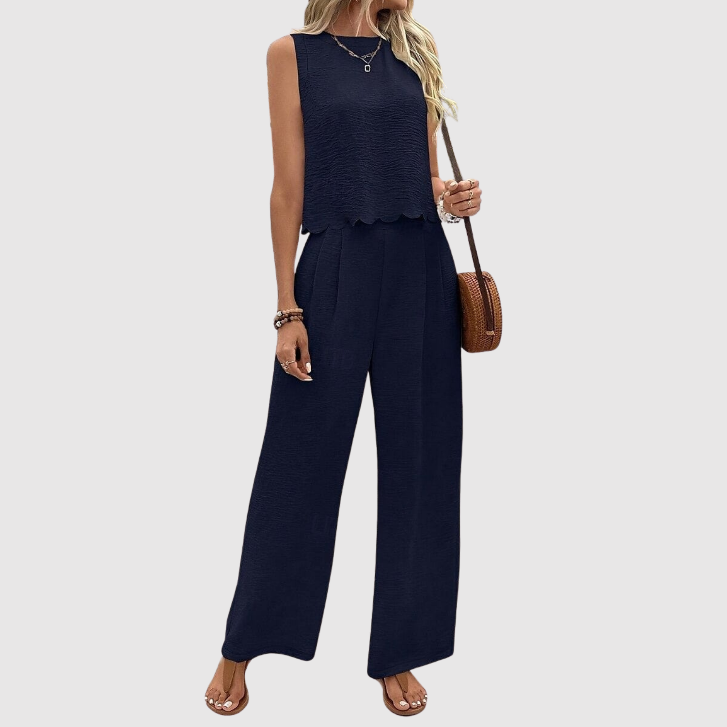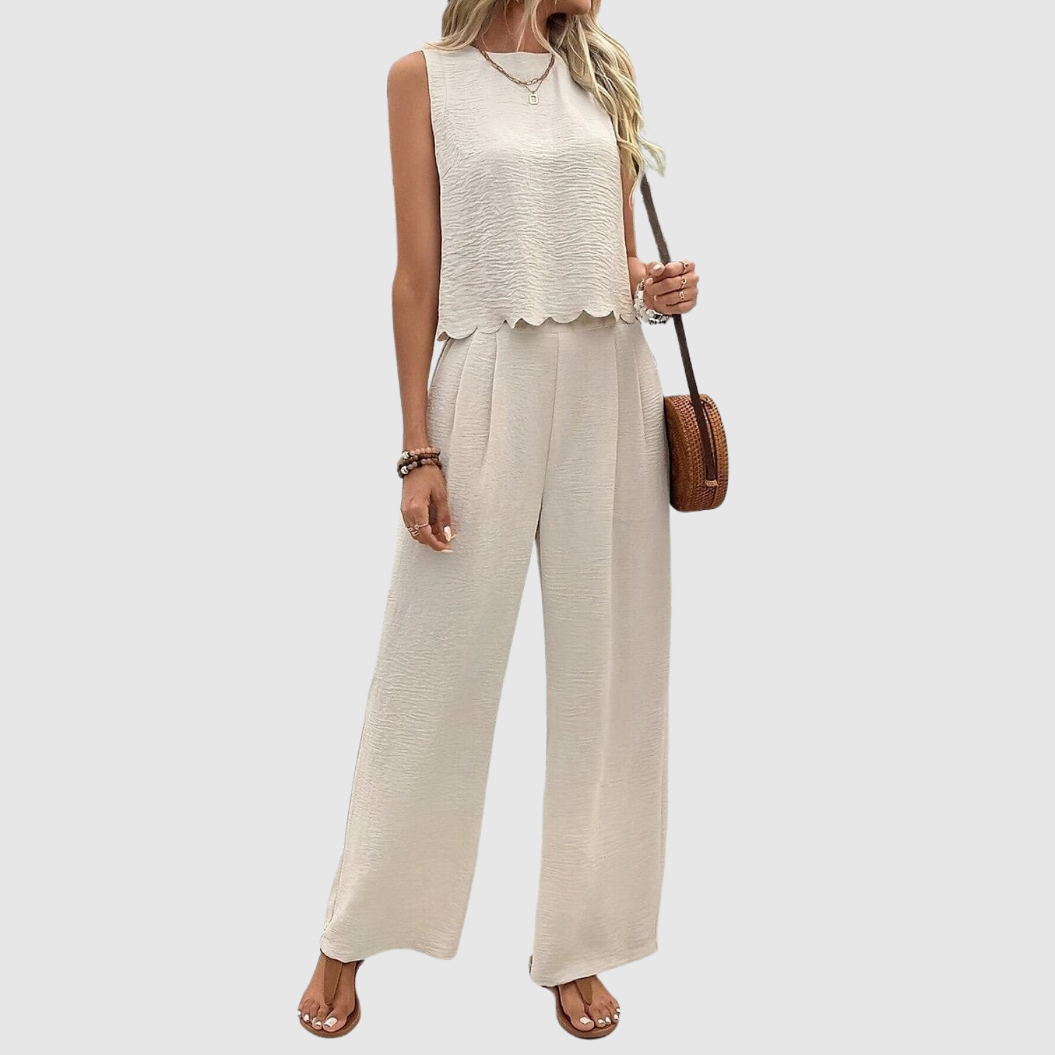 Този комплект съчетава елегантност и комфорт в едно. Лекото и дишащо качество го прави идеален както за ежедневна употреба, така и за по-празнични поводи. С flattering кройка и вечен дизайн, той е задължителен в гардероба на всяка жена.