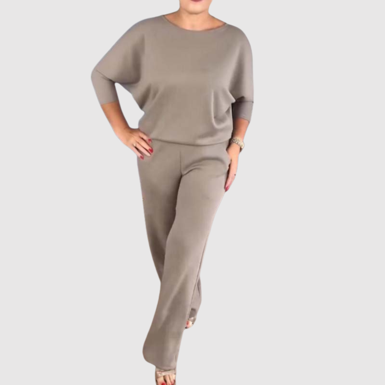 Този елегантен комплект комбинира лека риза с широки панталони за стилен и женствен вид. Перфектен за работа, вечери навън и спокойни дни със стил.