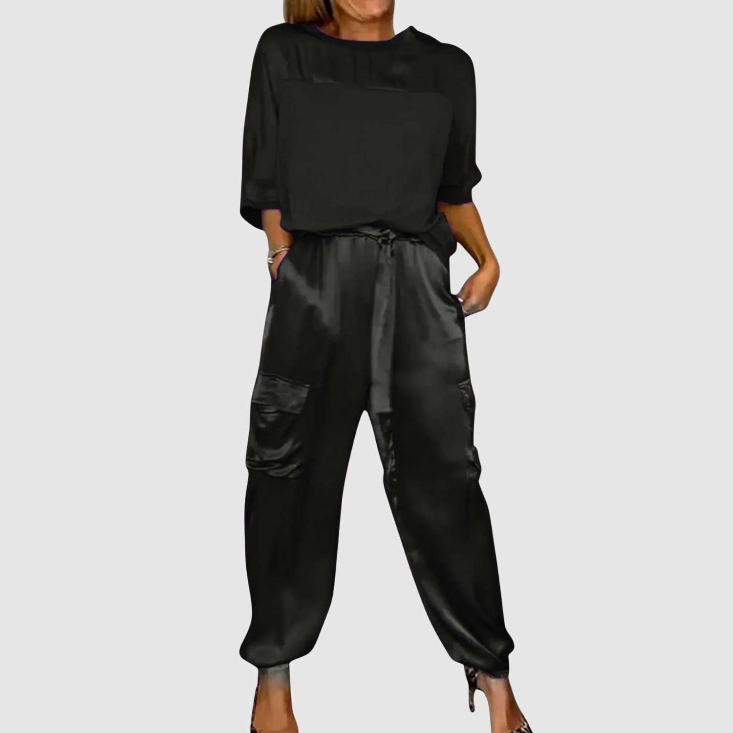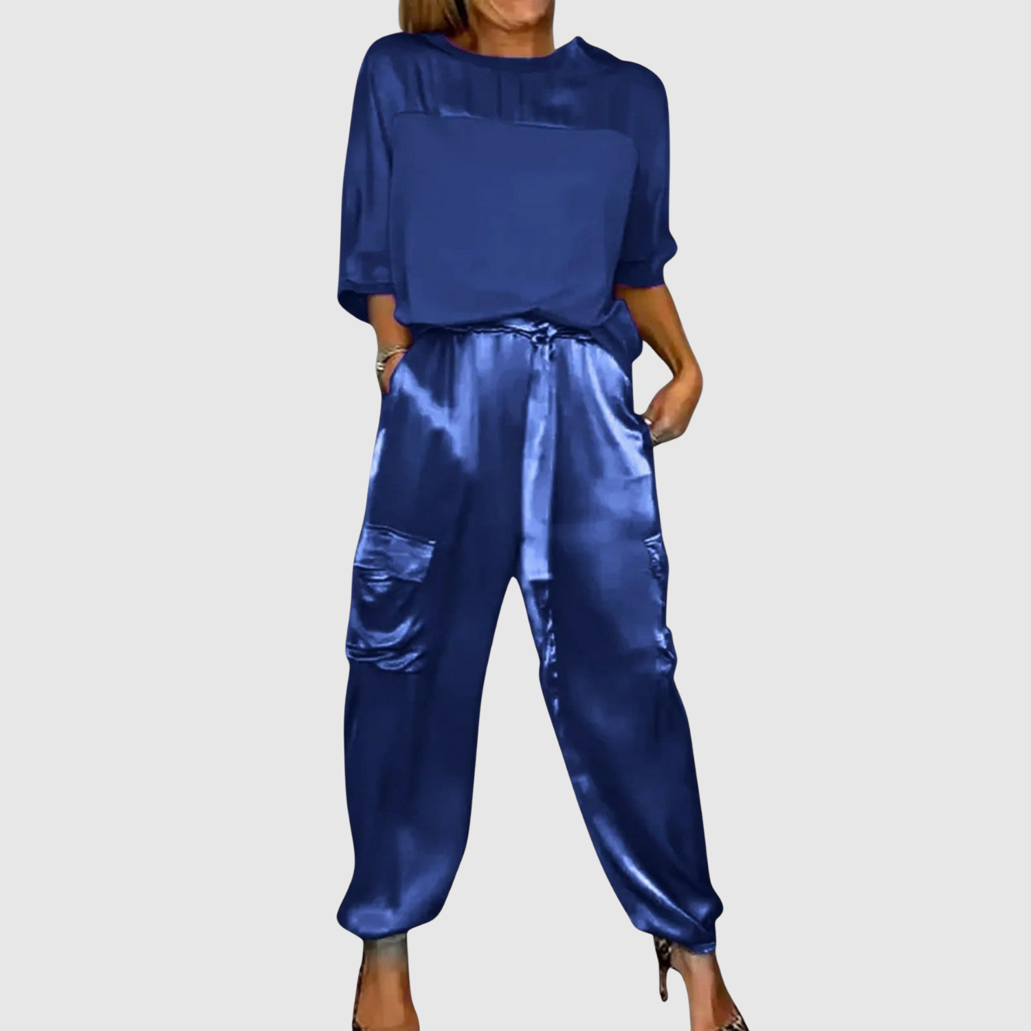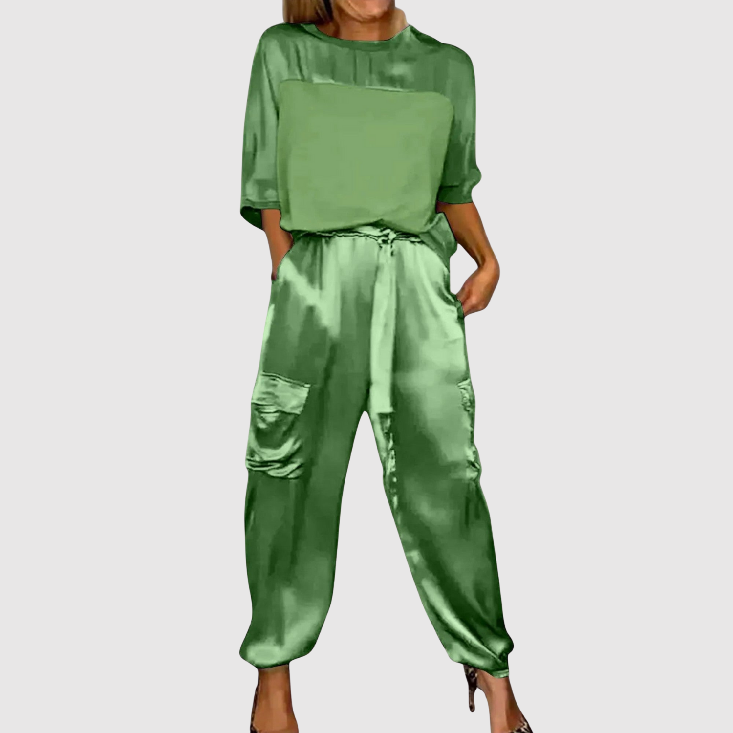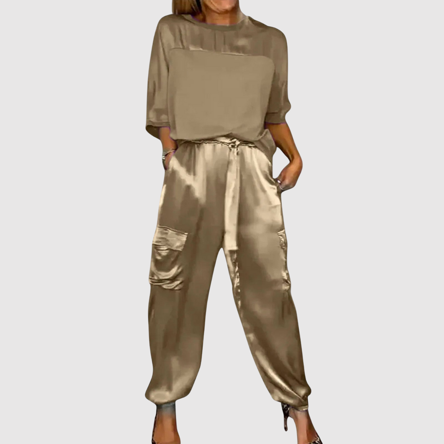 Модерен двучастен комплект от гладък сатен, който съчетава лукс и небрежна елегантност. Леката, блестяща повърхност прави тоалета перфектен както за празнични поводи, така и за ежедневна употреба със стил.