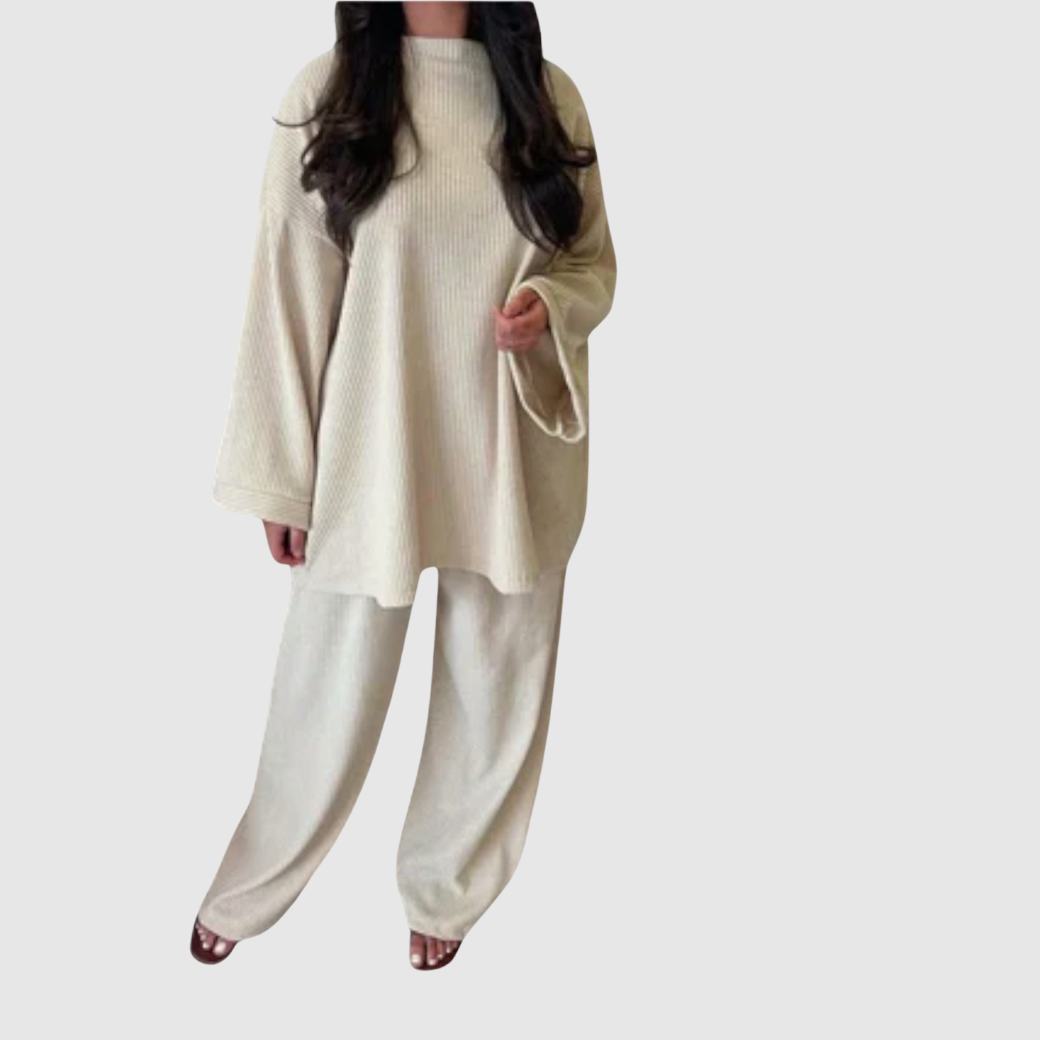 Модерен комплект с свободна кройка, състоящ се от овърсайз блуза и съответстващи панталони. Материалът пада естествено и придава както изискан, така и неформален вид. Идеален за ежедневна употреба, пътувания или уютни вечери.