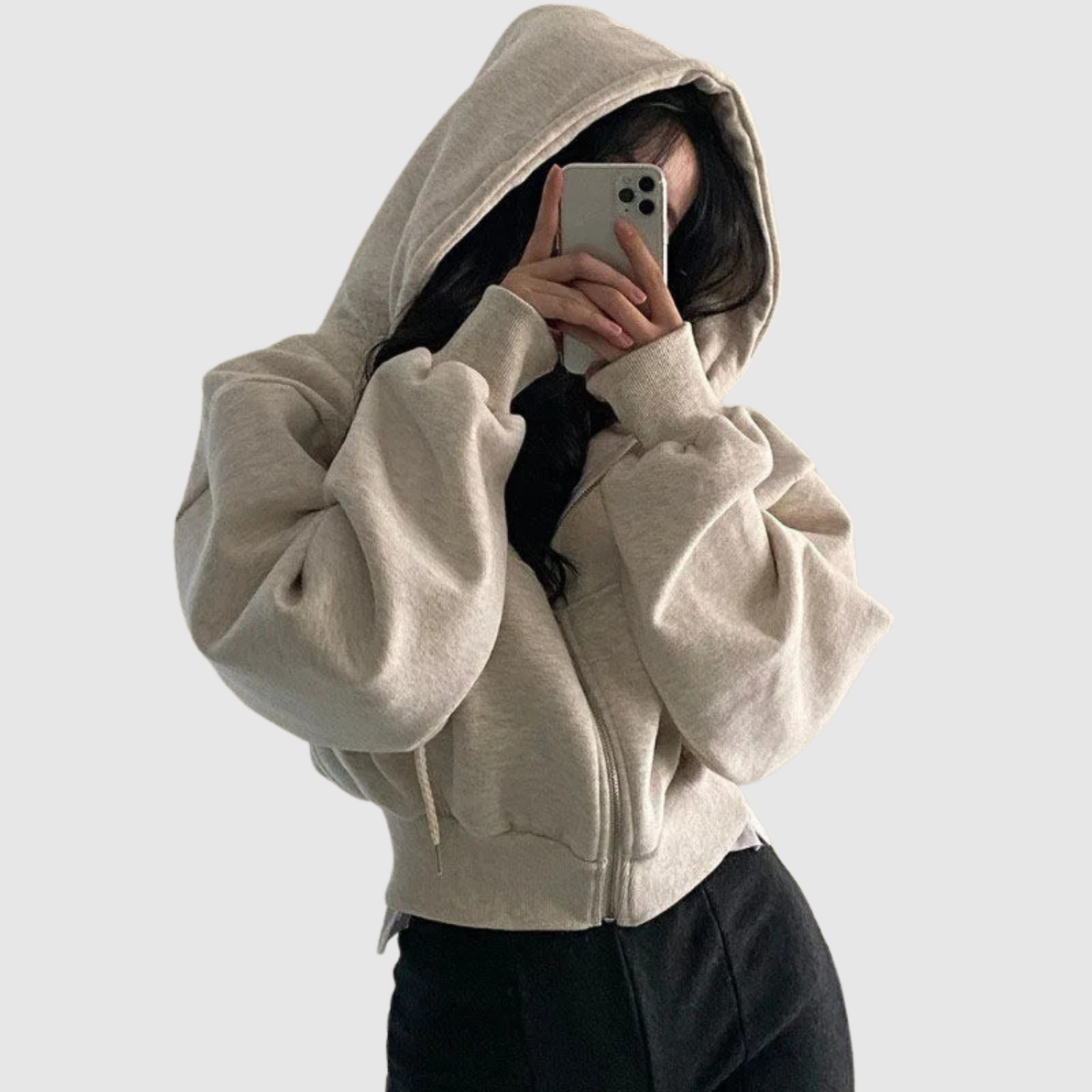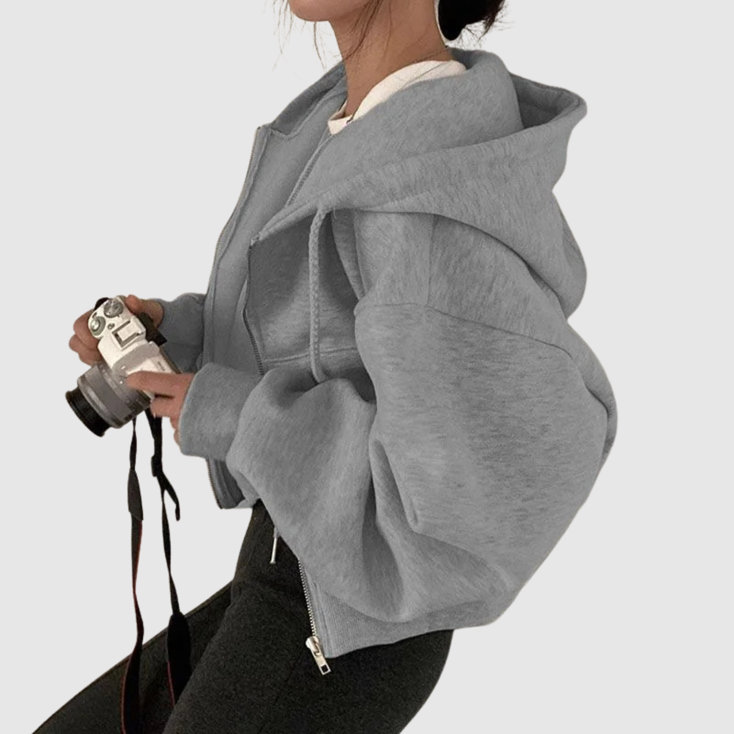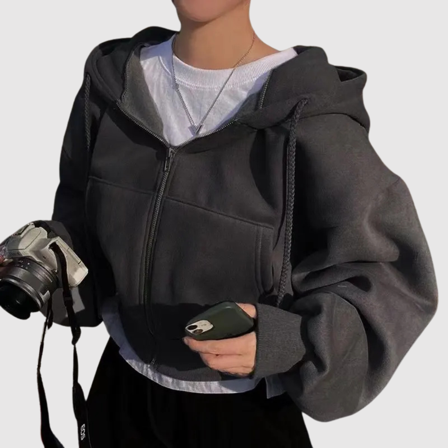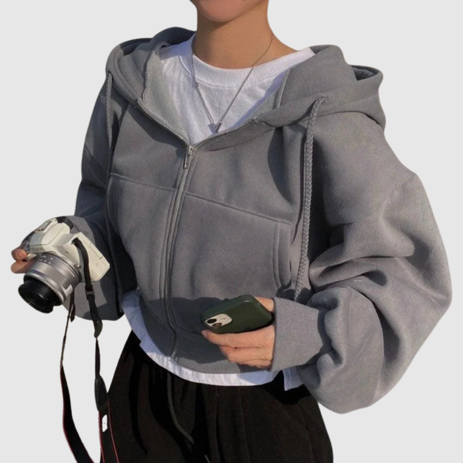 Тази къса худи съчетава отпуснат дизайн с модерен стил. Перфектна за слоести аутфити или като неформален акцент в ежедневието.