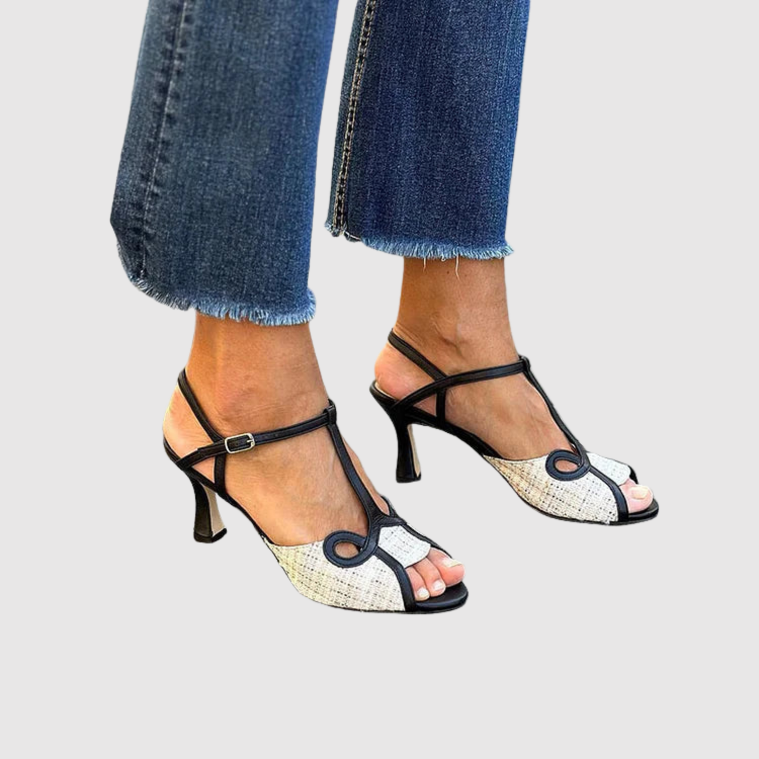 Тези сандали комбинират бяло-бежова горна част с черни детайли за забележителен, но изискан вид. Тънката лента около глезена осигурява стабилност, докато отворената предна част и средният ток придават женственост и комфорт.