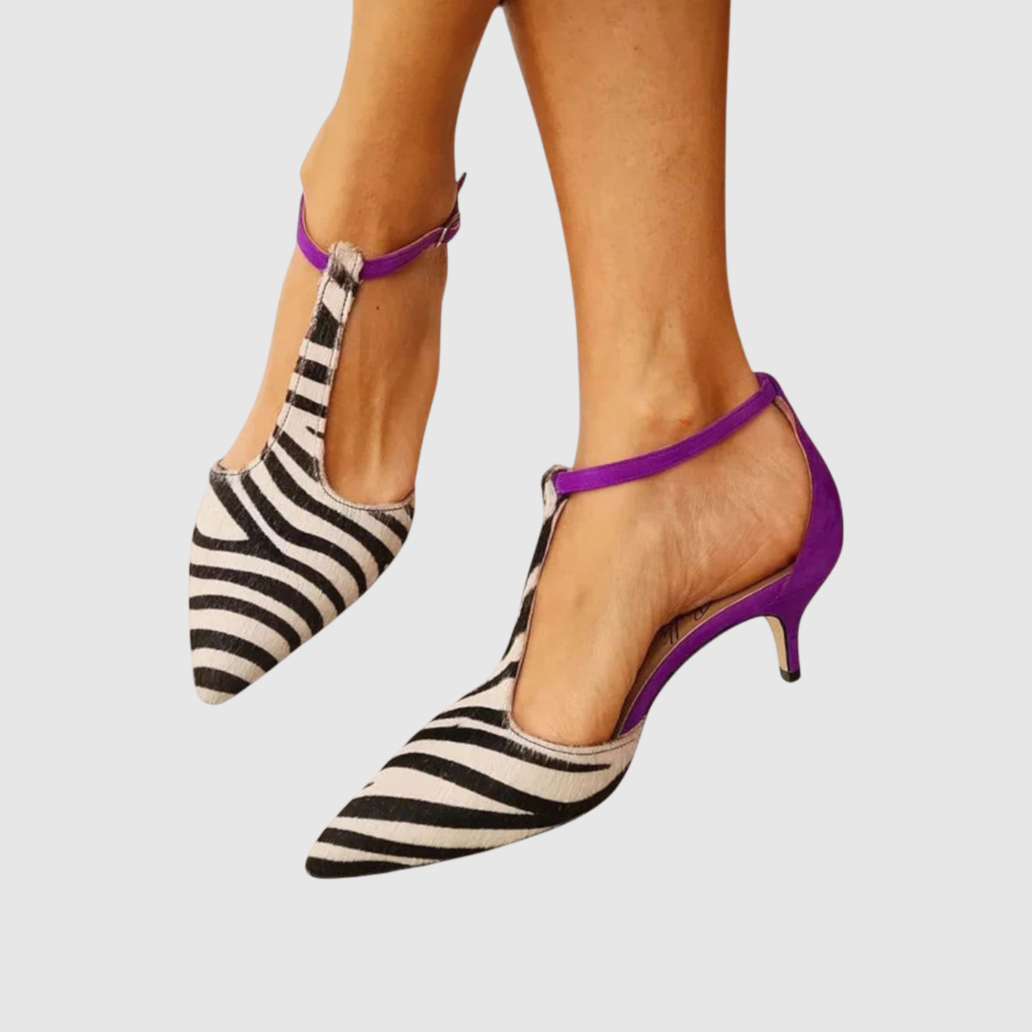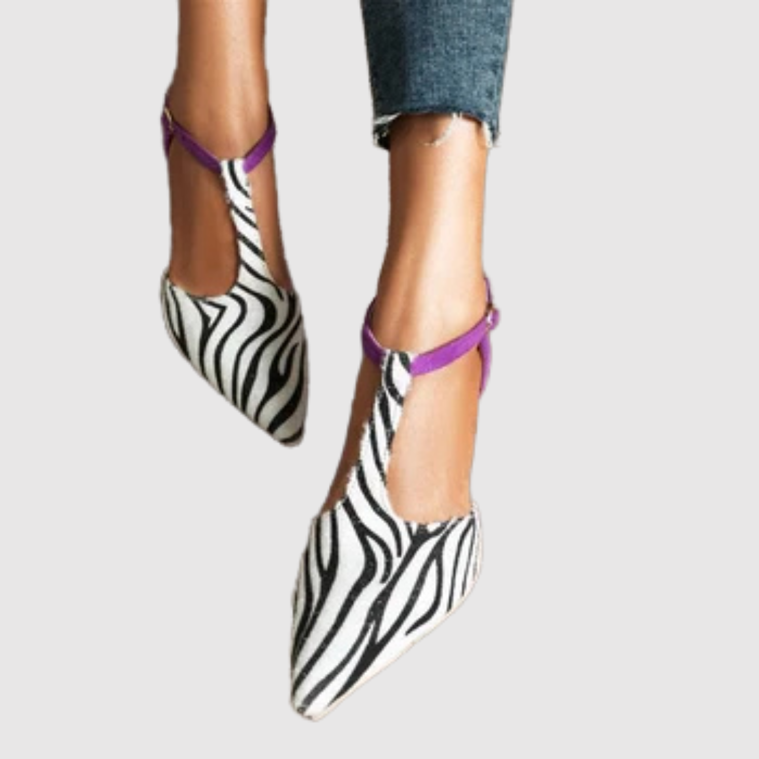 Тези сандали с отворена пета, вдъхновени от саваната, комбинират забележителен зебров принт с елегантен лилав ток. Отворената пета и заостреният нос придават женствен и лек вид – перфектни за летни дни и вечерни визии с характер.