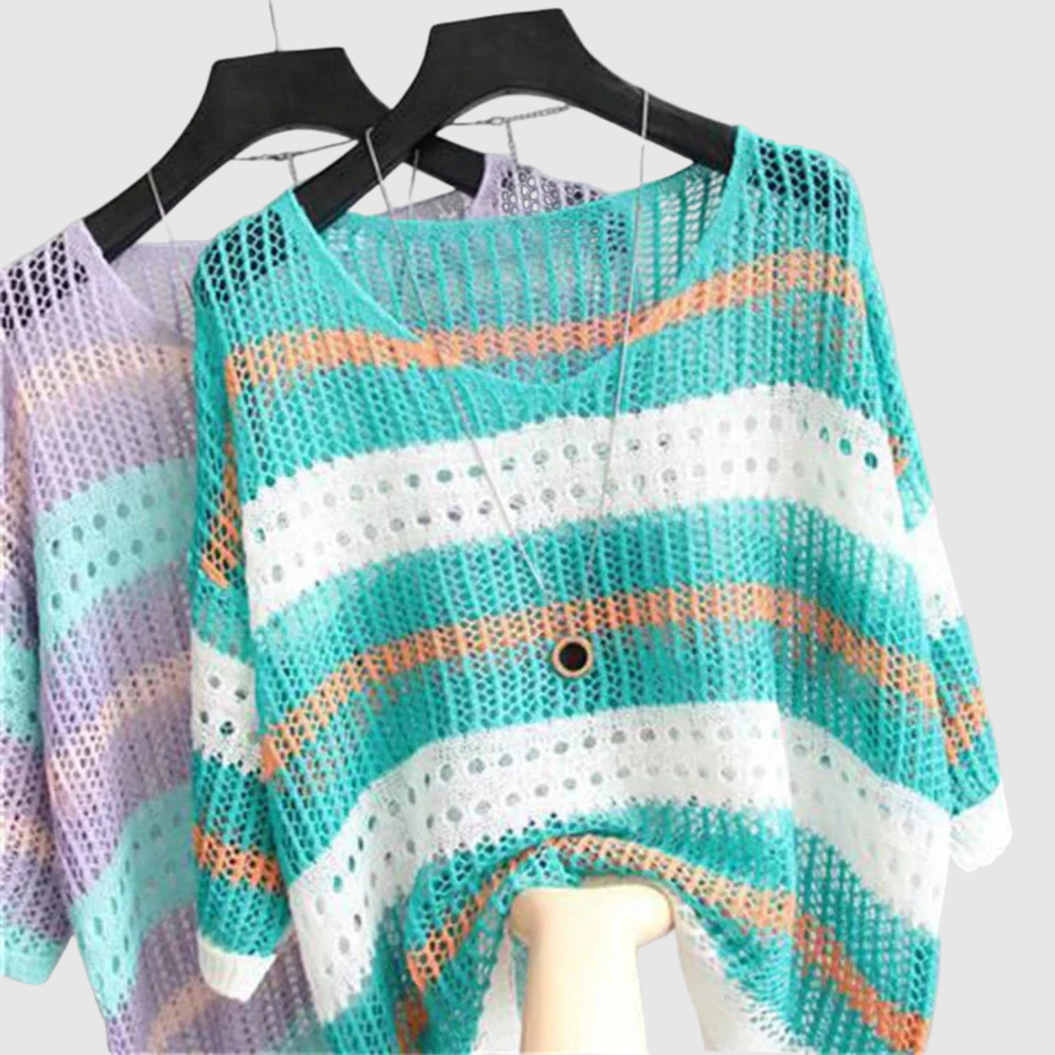 Този лек пуловер предлага широки пастелни ивици и свободна кройка. Отвореният трикотажен модел и меката текстура го правят идеален за слоеви облекла през преходните сезони.