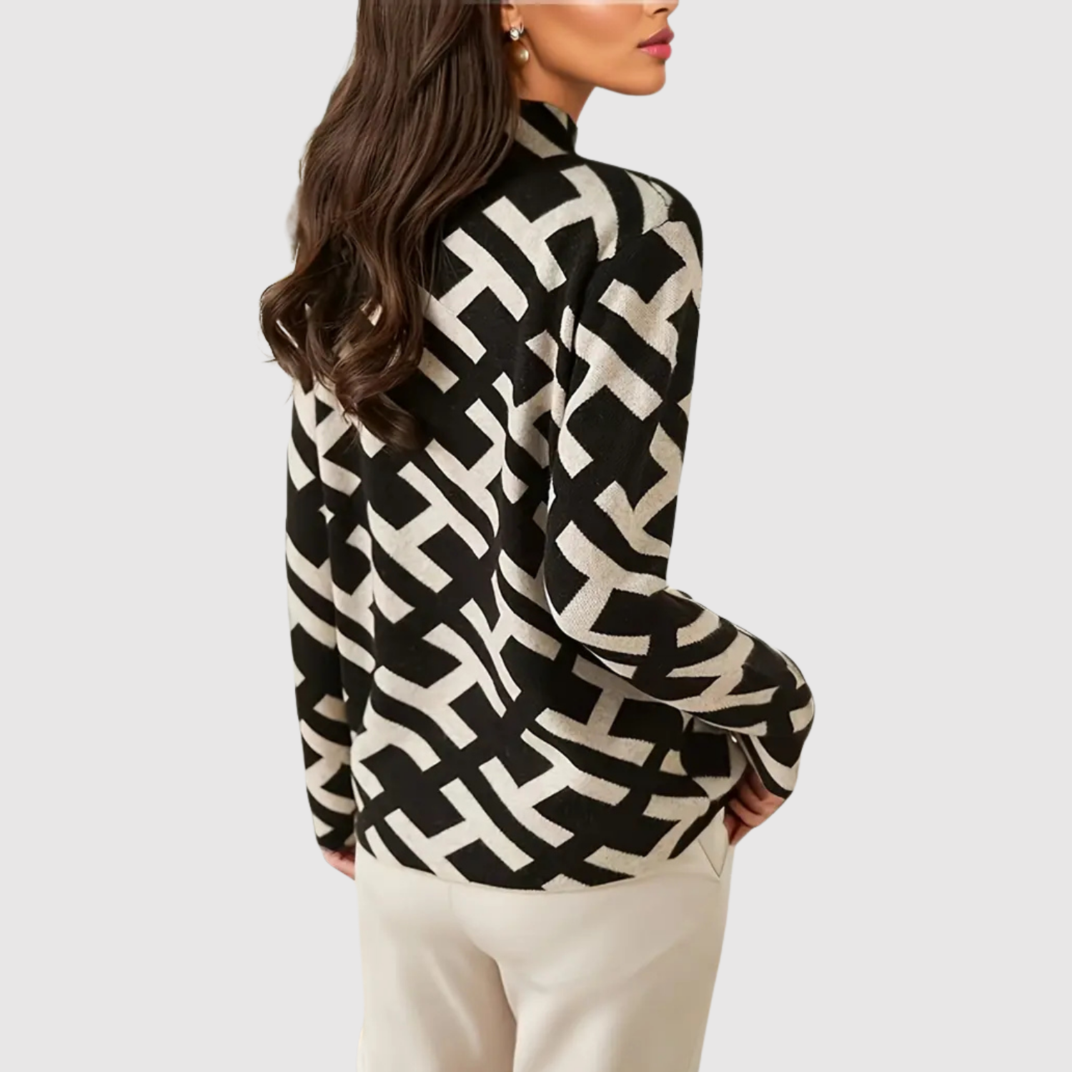Този пуловер се откроява с яркия си черно-бял модел. Мекото материало осигурява високо удобство, докато графичният дизайн придава модерен и изискан вид. Перфектен както за ежедневна употреба, така и за по-модерни поводи.