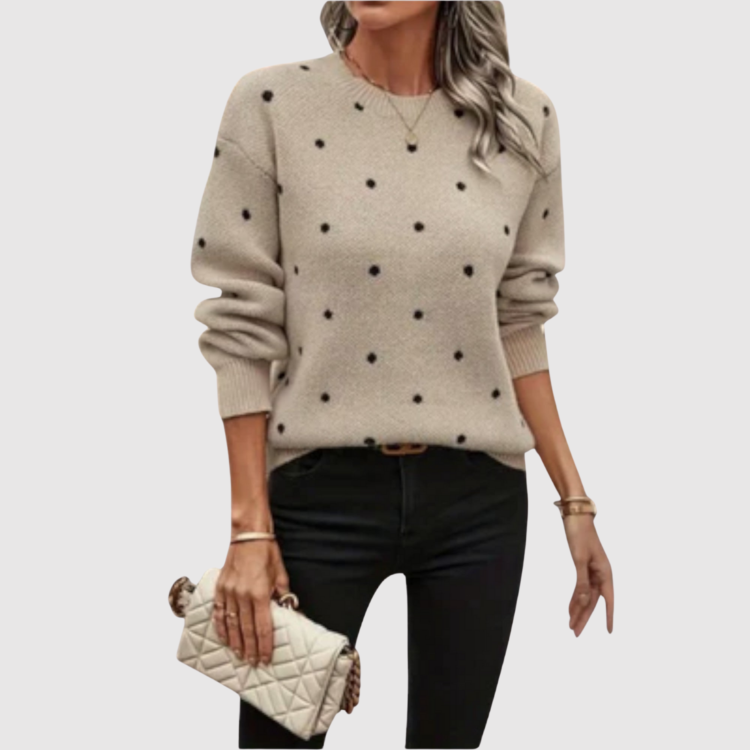 Този пуловер комбинира прост силует с игриво точково мотив. Мекото качество го прави удобен за носене през целия ден, докато дизайнът придава модерен и женствен вид. Перфектен за ежедневието и неформални поводи.