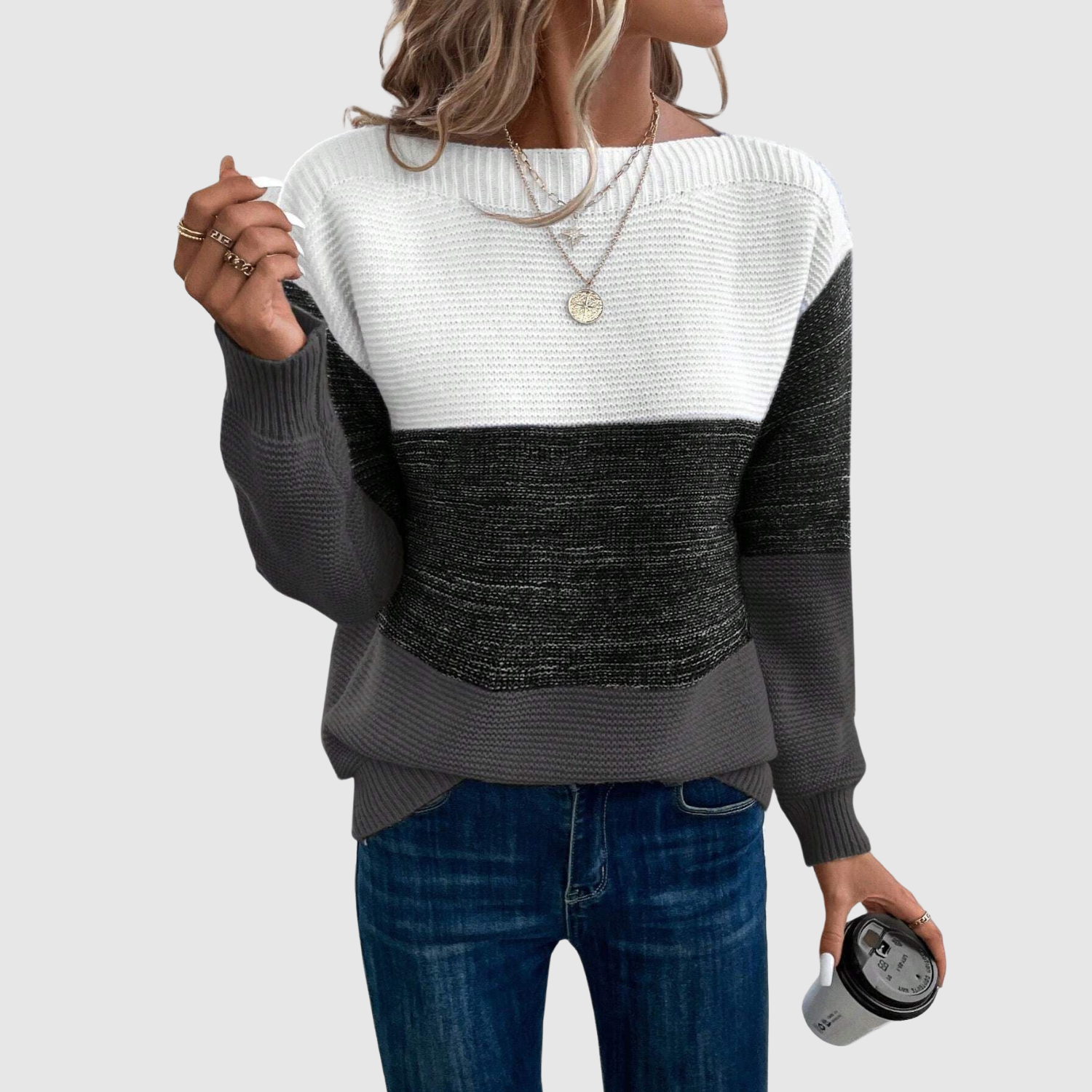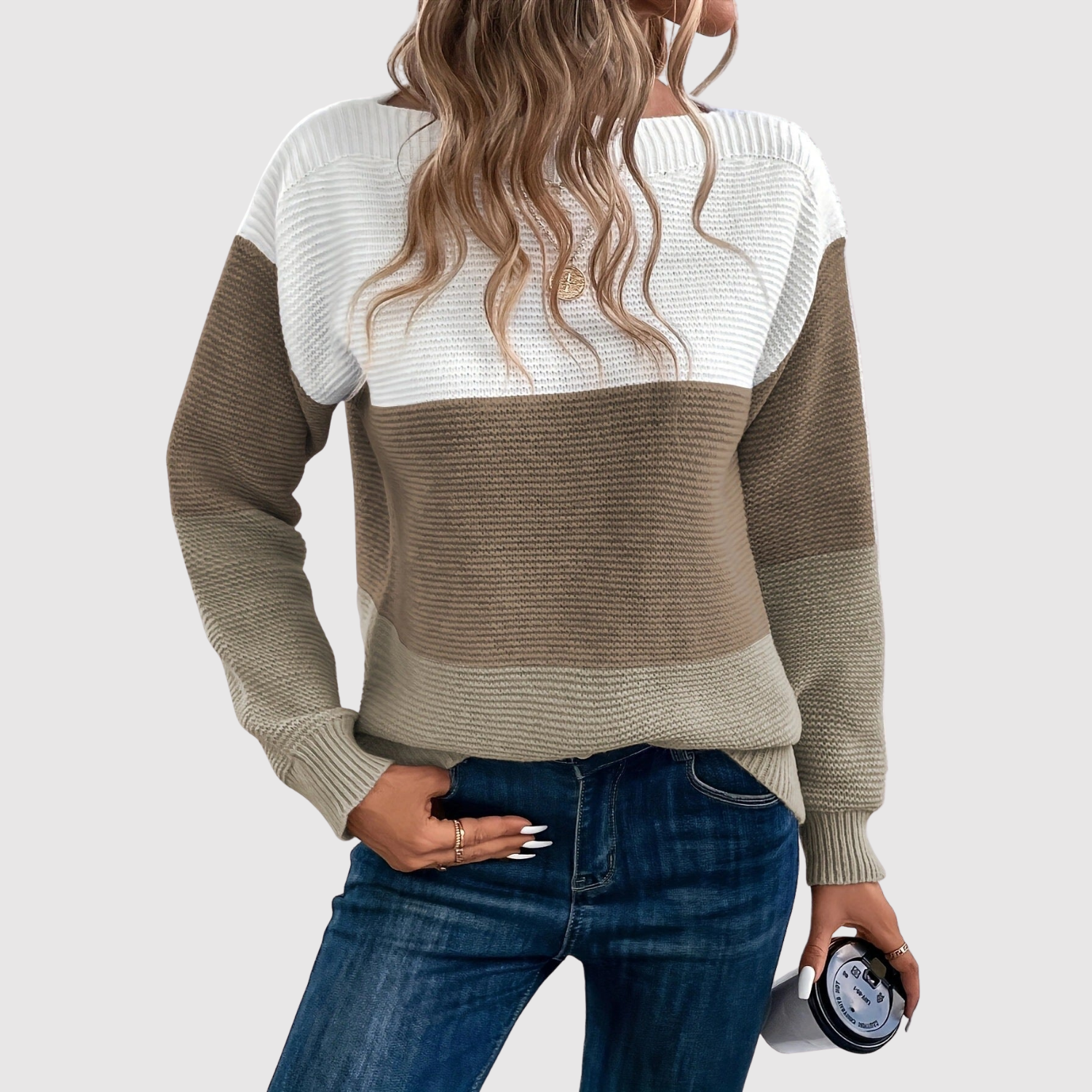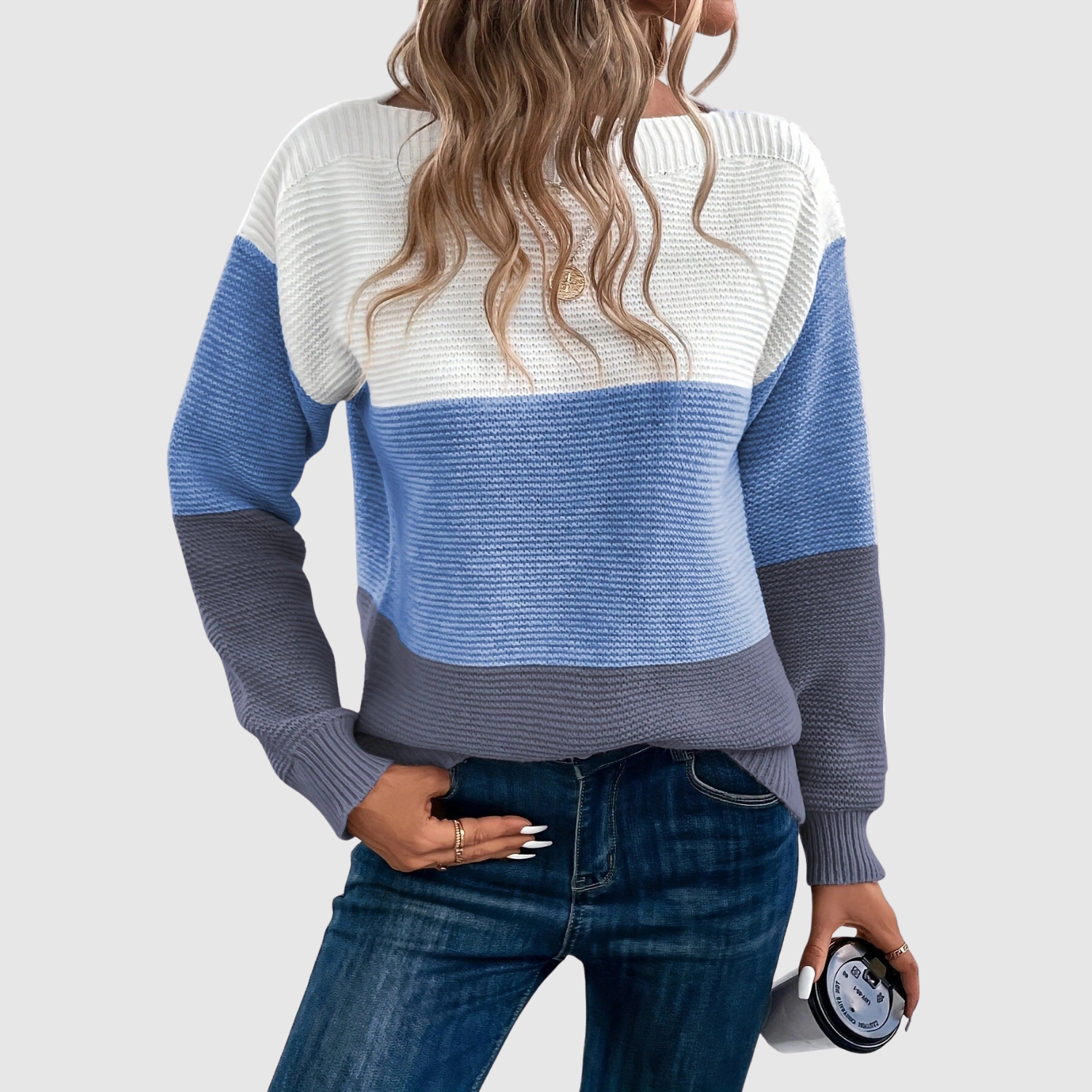 Този пуловер е проектиран с широки цветни блокове, които създават стилен и свеж вид. Мекото качество осигурява високо ниво на комфорт, докато свободната кройка го прави идеален както за ежедневието, така и за уютни моменти.