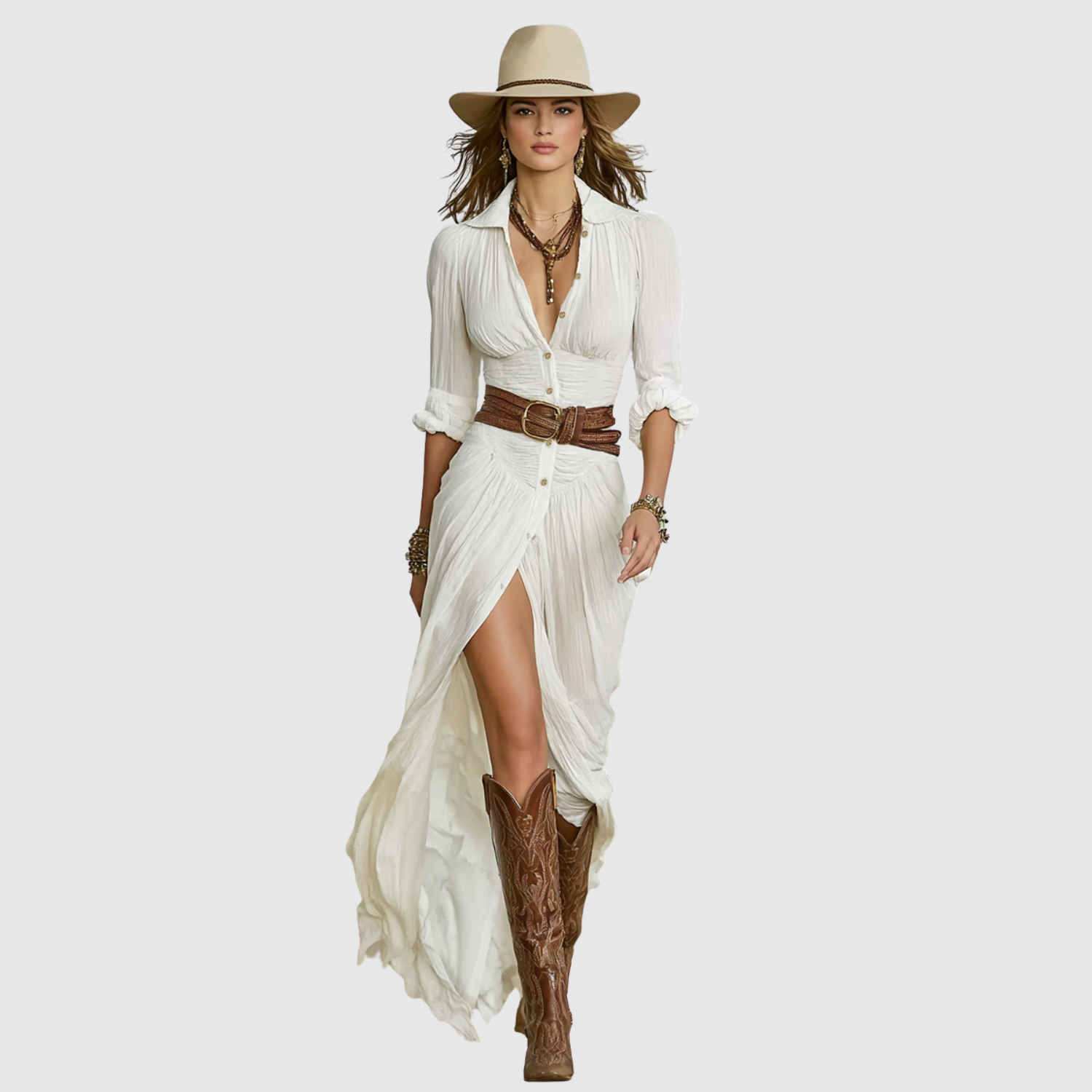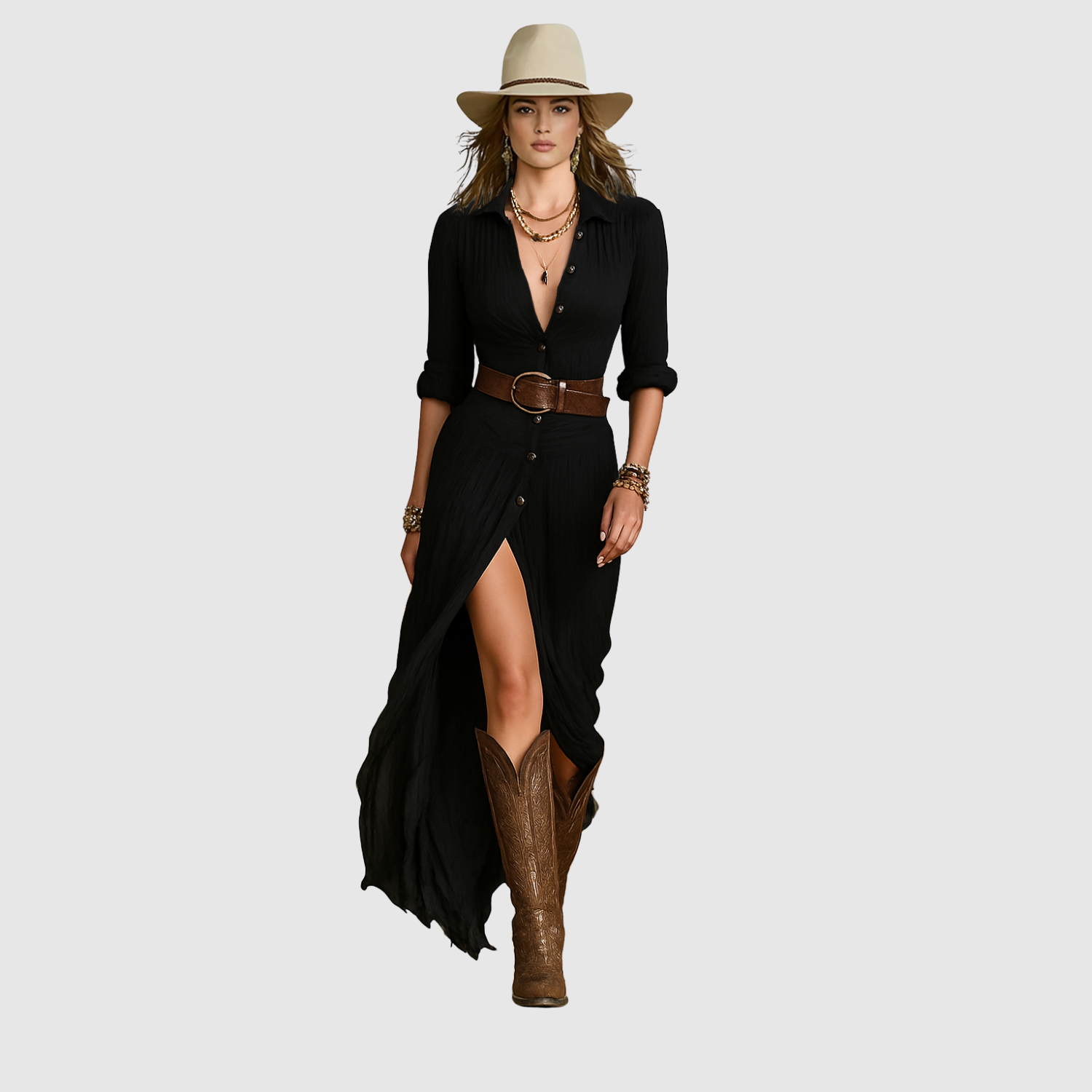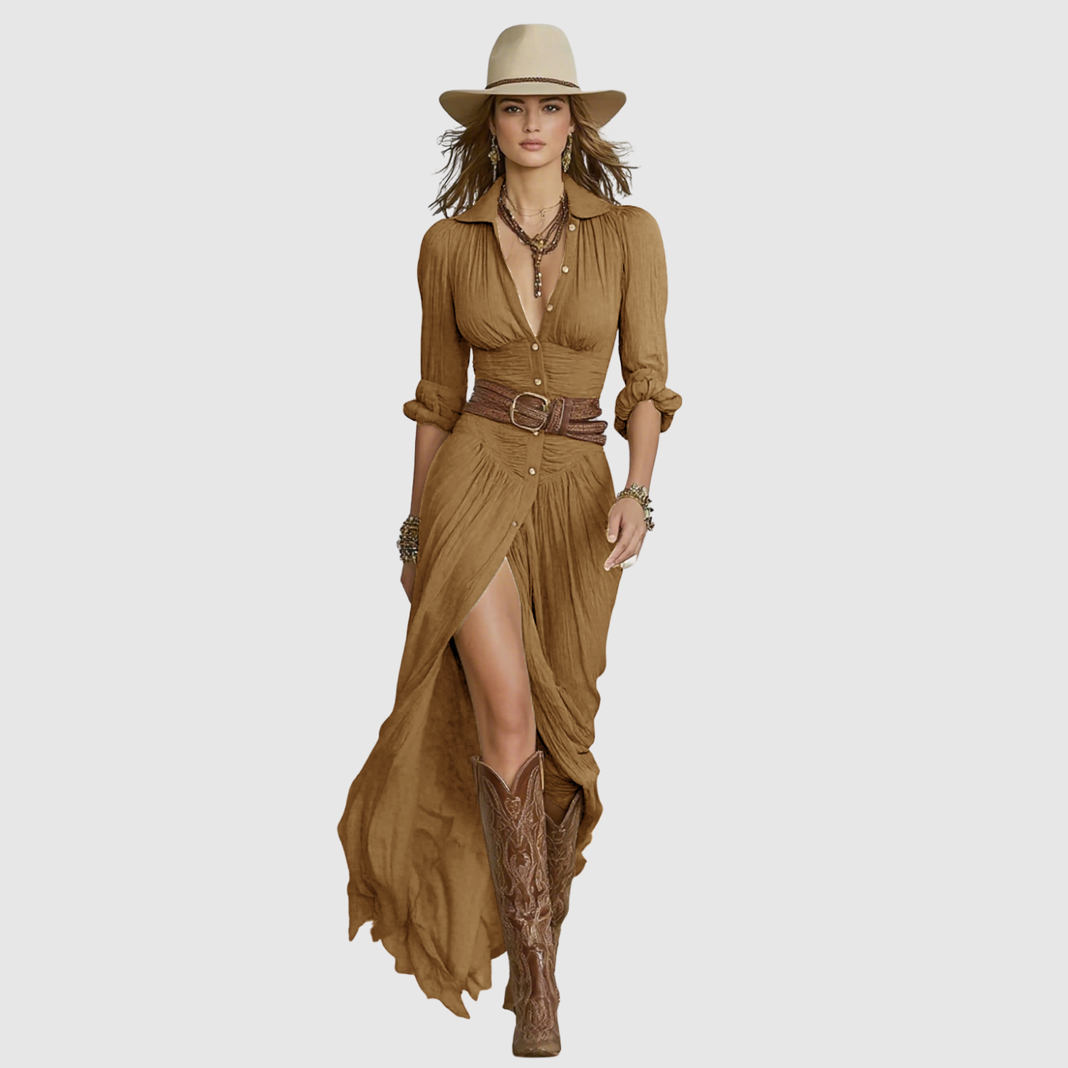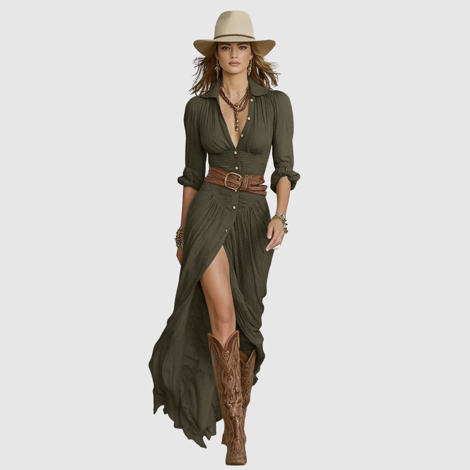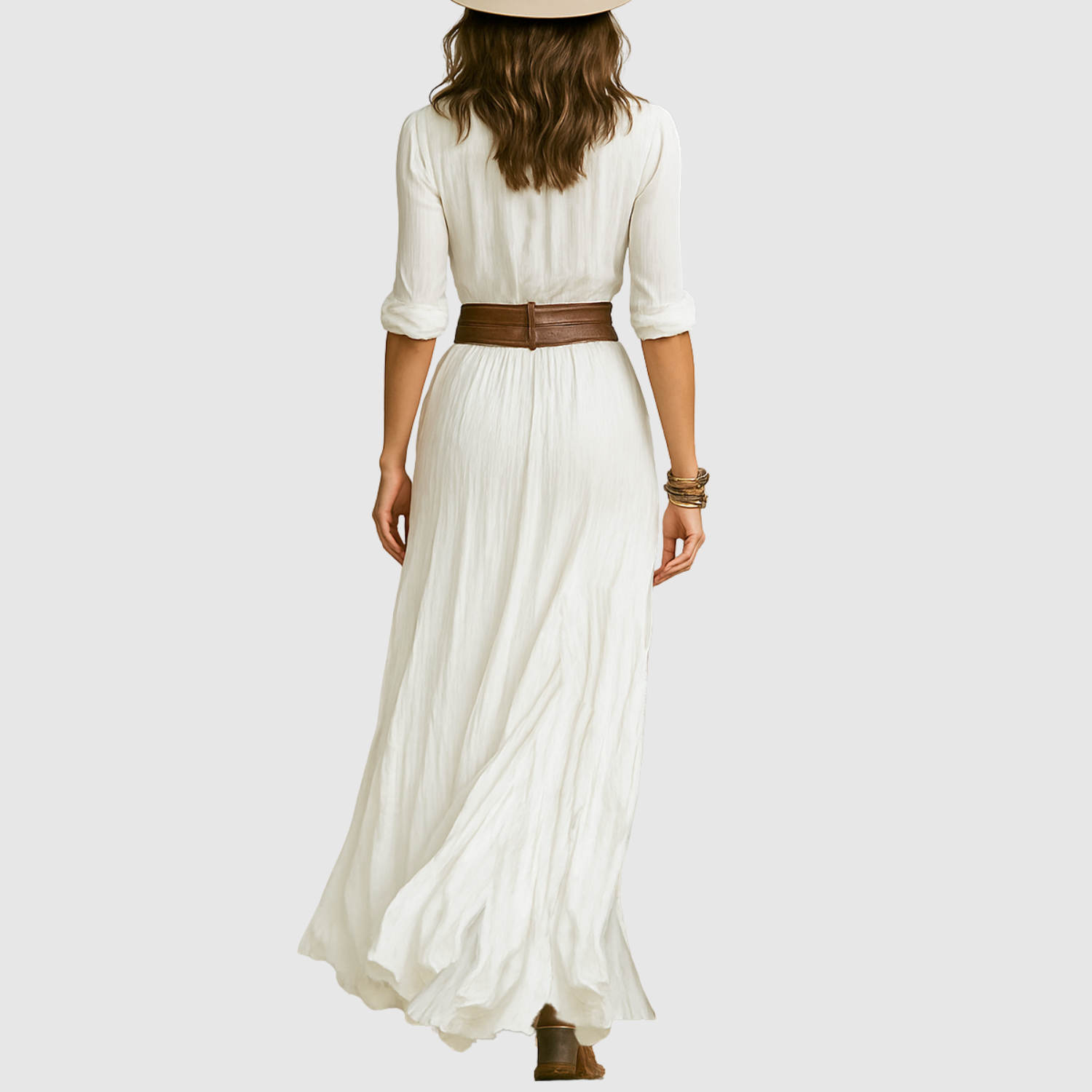 Тази въздушна макси рокля комбинира бохемски вдъхновен кройка с вечна женственост. Лекото платно пада красиво около тялото, докато коланът в талията подчертава фигурата по ласкателен начин. Перфектна за летни дни или небрежни вечери.