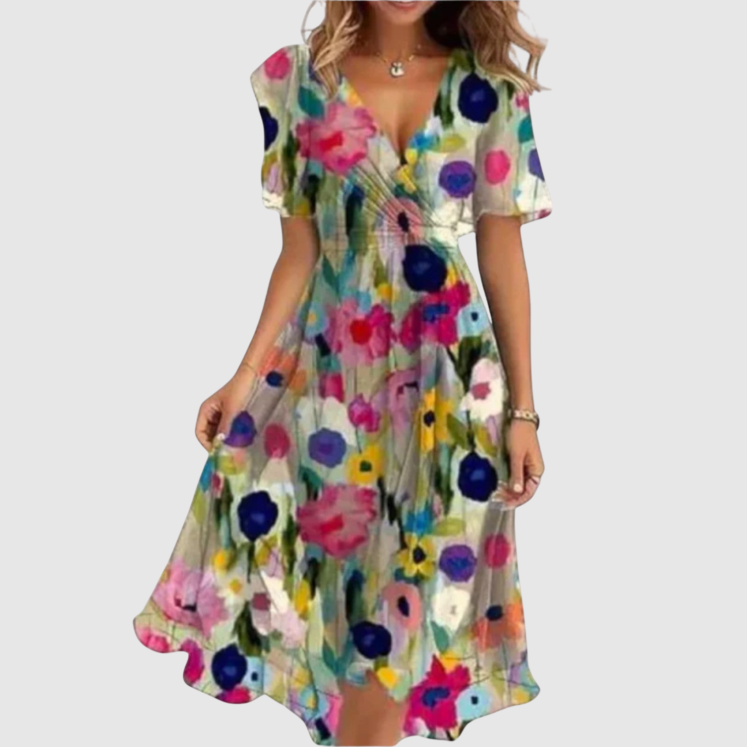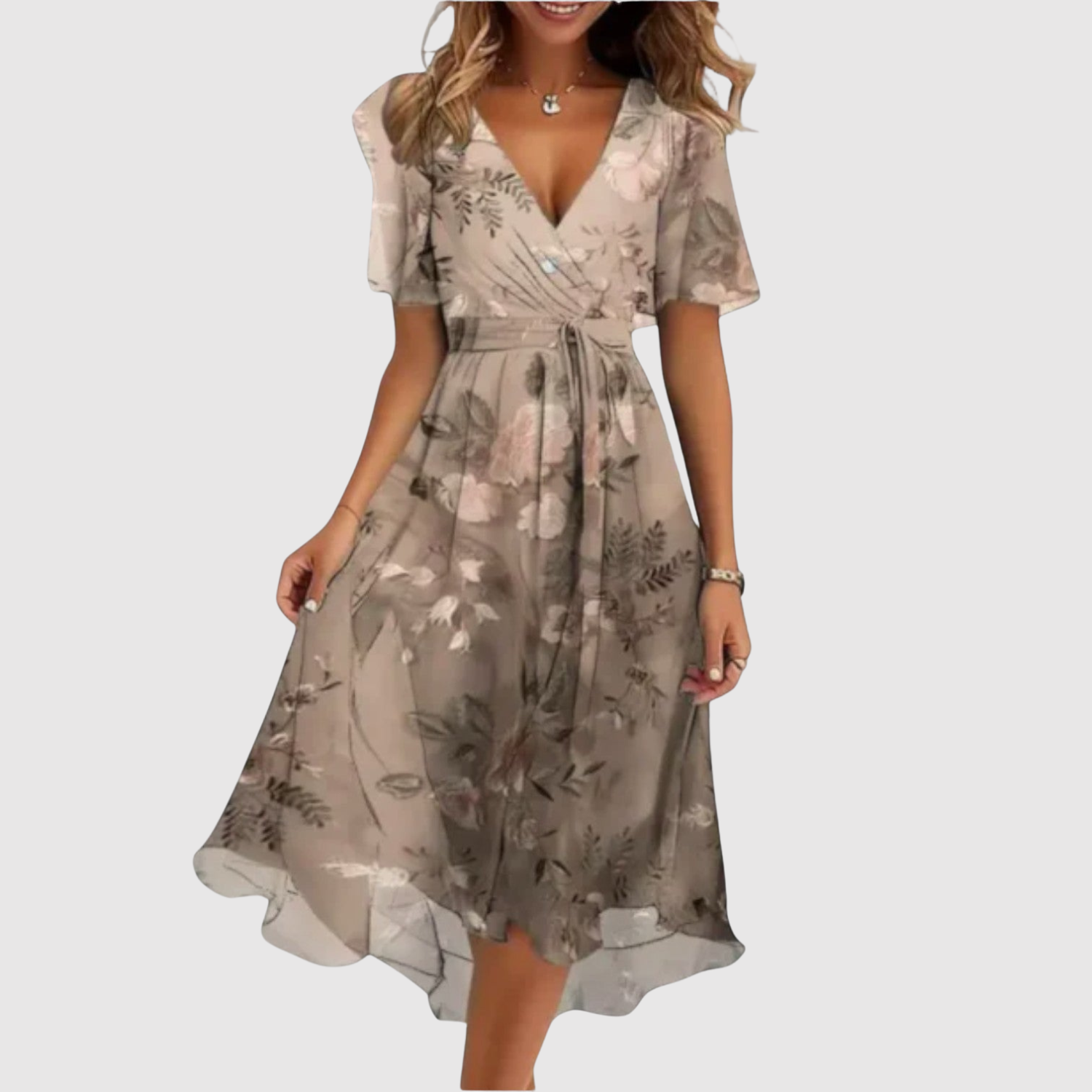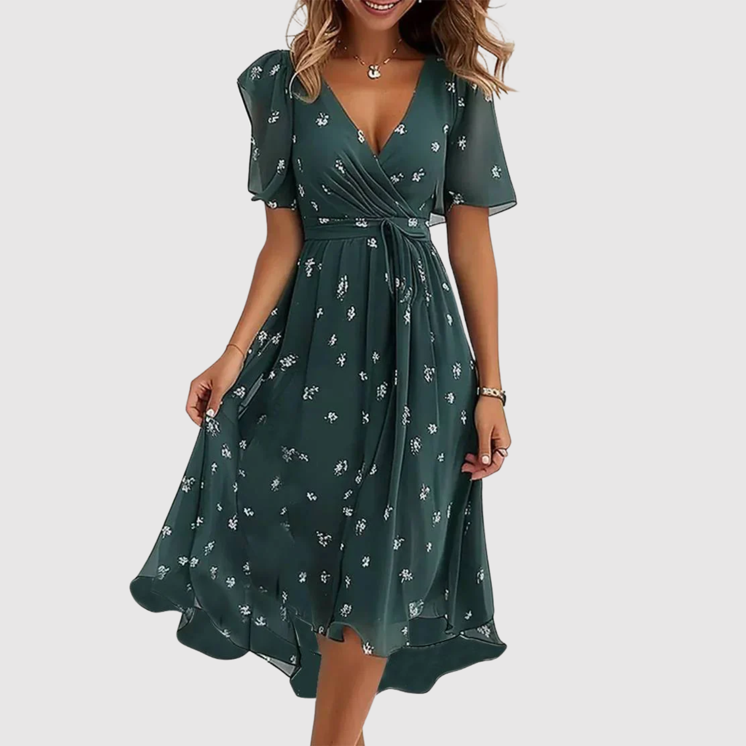 Тази дамска рокля с V-образно деколте комбинира женственост, свежест и вечен дизайн, който подчертава фигурата и осигурява пълна свобода на движение. Лекото падане и кръстосаното кроене я правят задължителна за тези, които търсят без усилие стил.