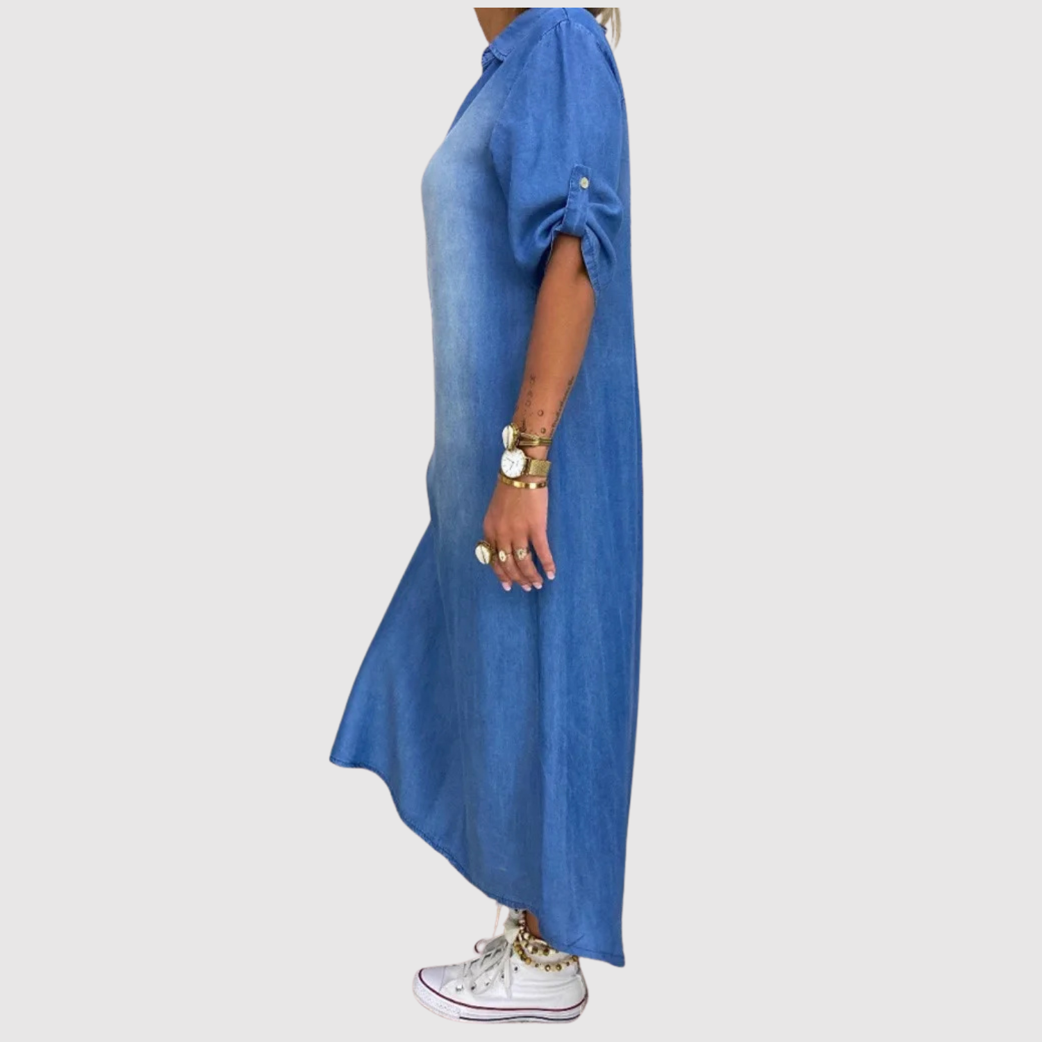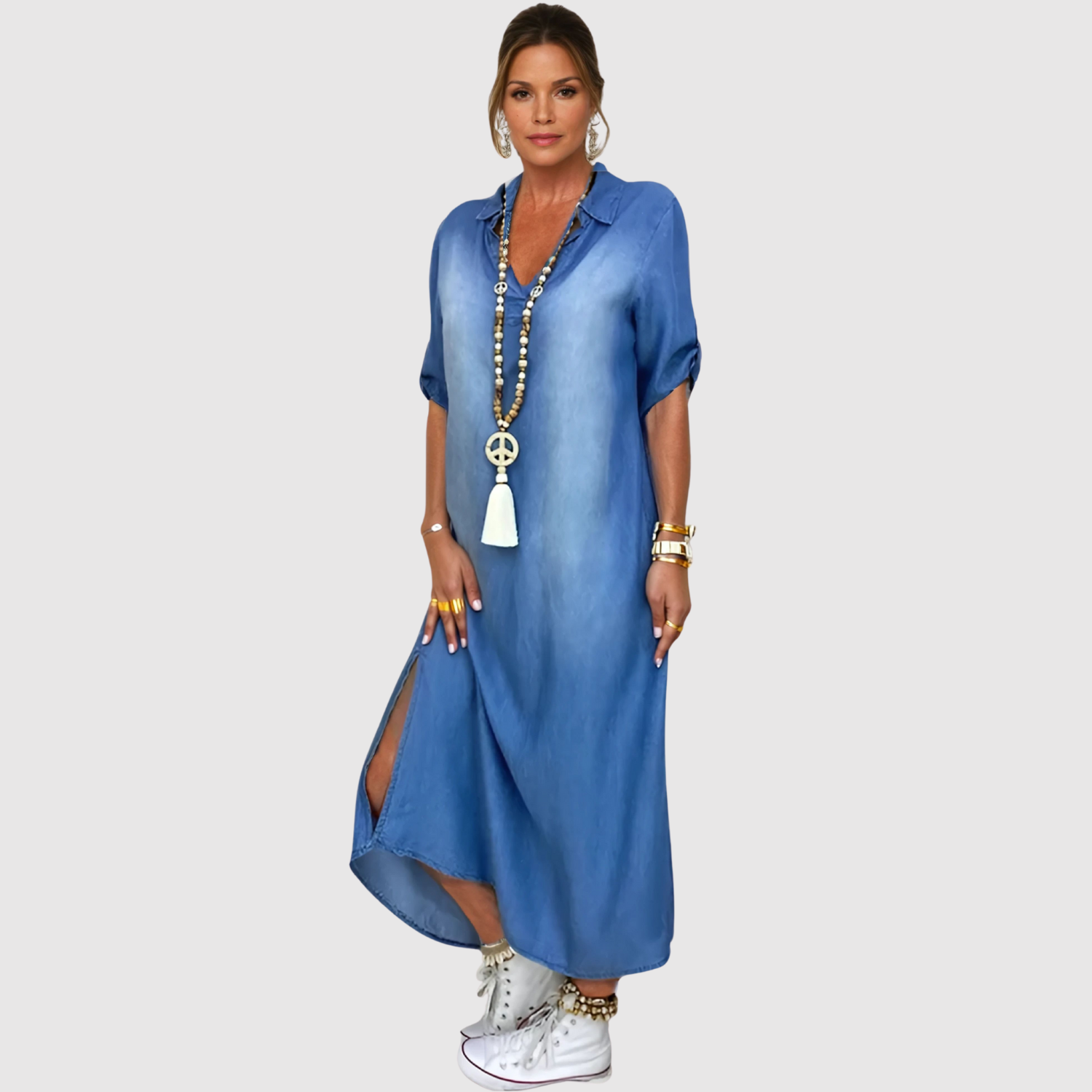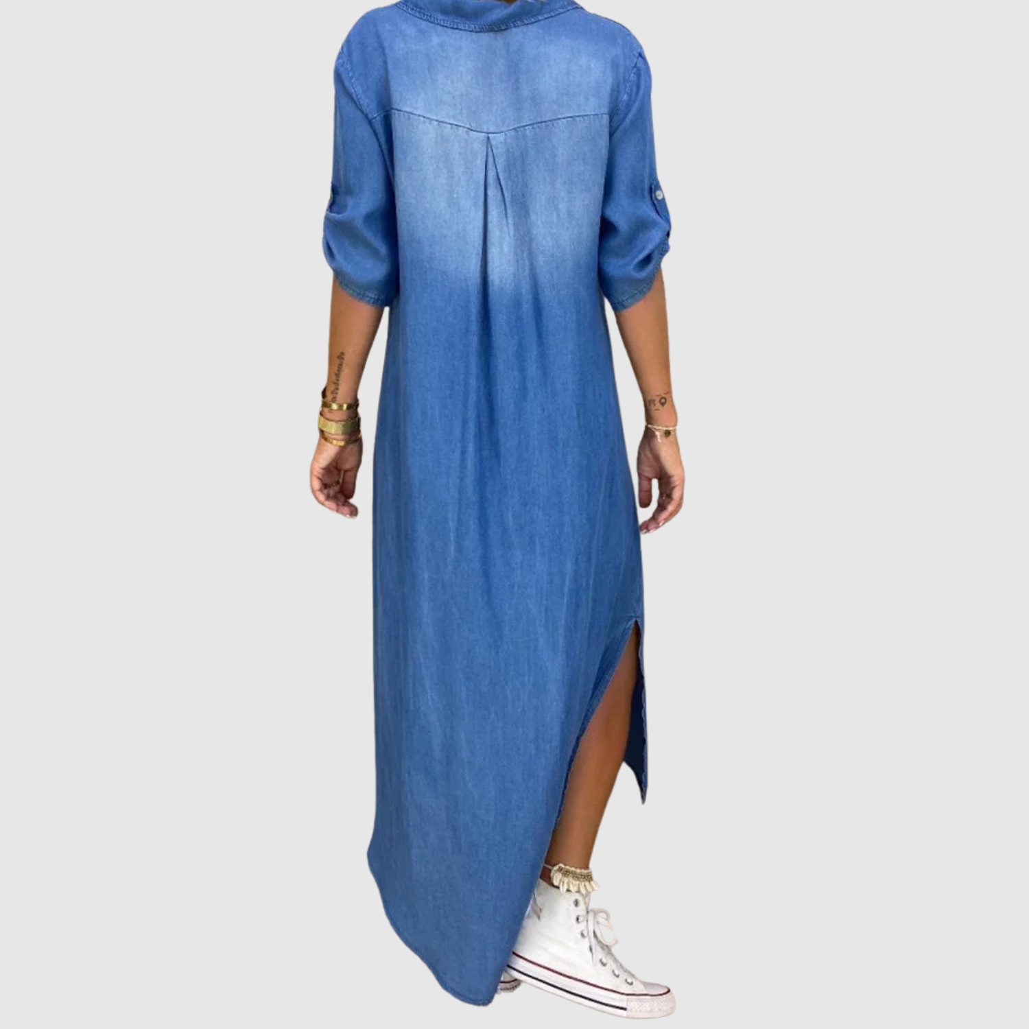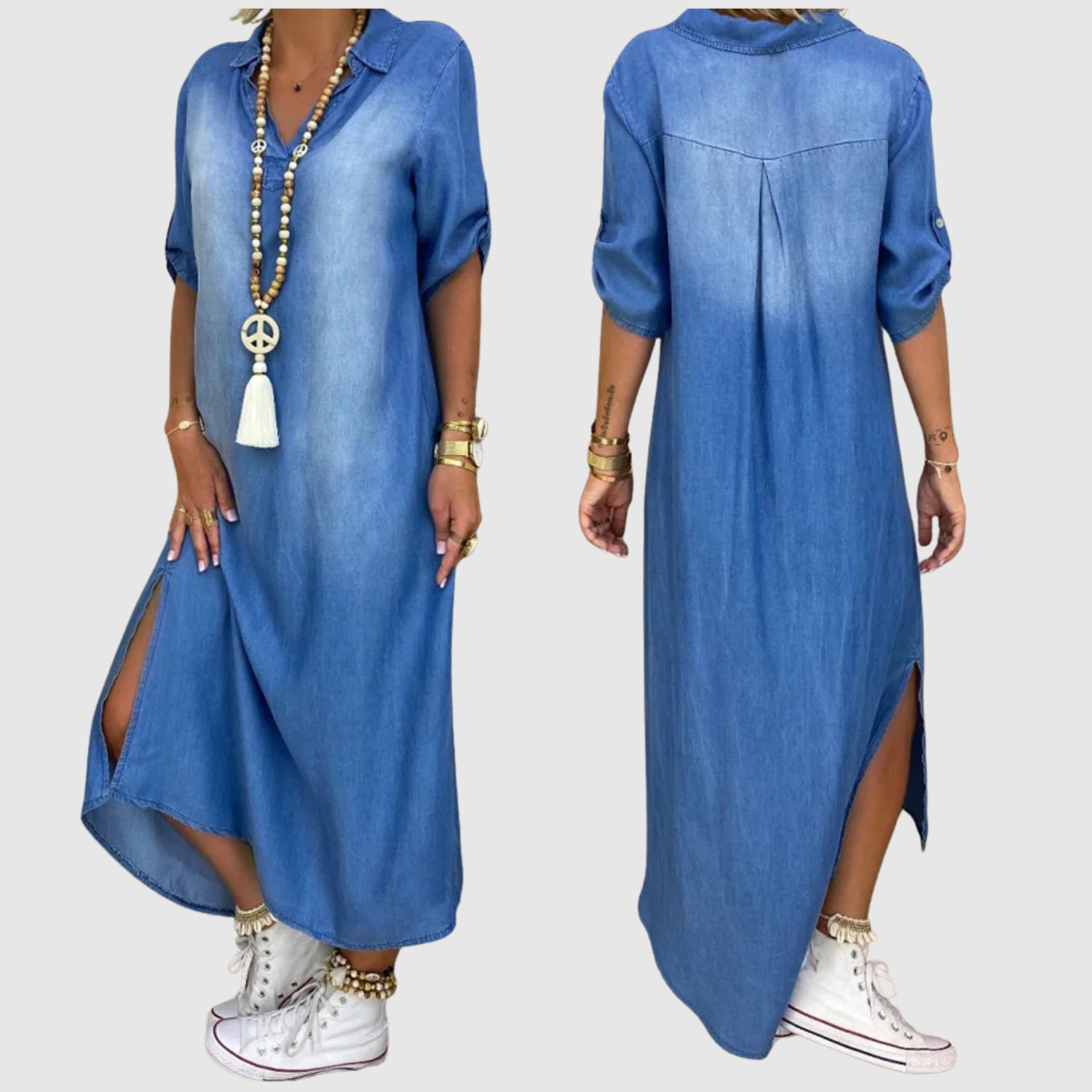 Лилия - Дълга дънкова рокля с цепка отстрани