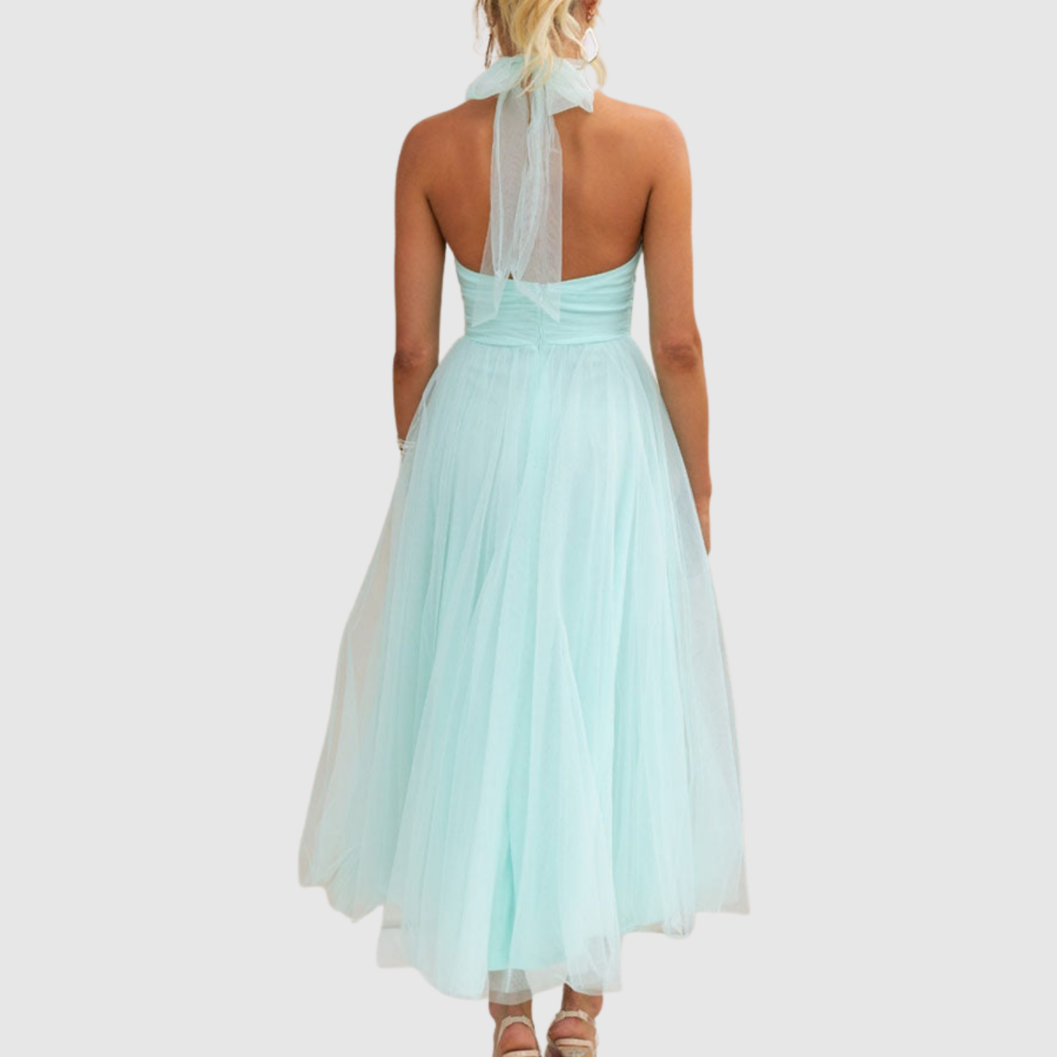 Очарователна рокля в слоеве от лек тюл, която пада красиво при всяко движение. Високата яка придава изискан вид, докато елегантният кройка подчертава женствената силует. Перфектна за сватби, партита и специални поводи.