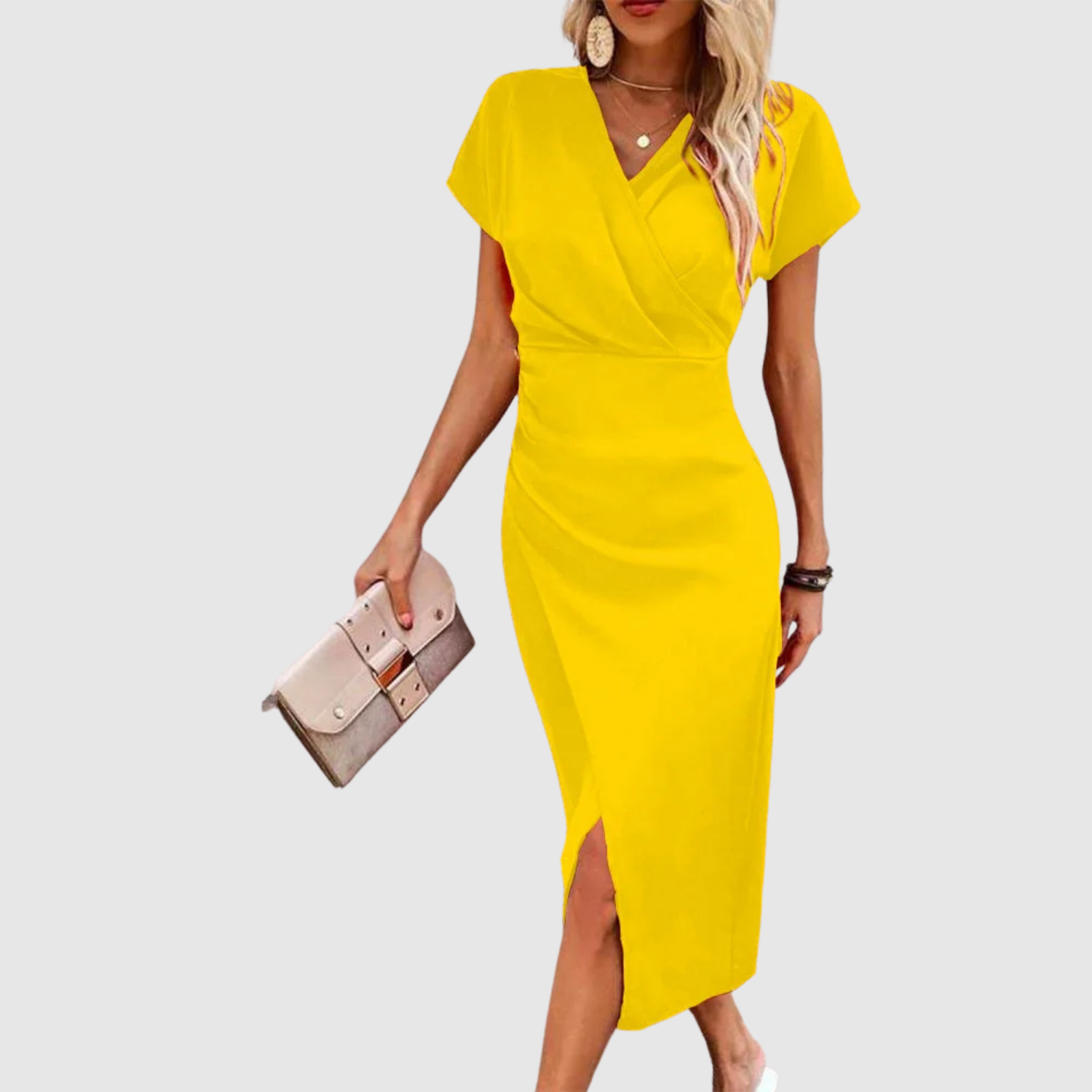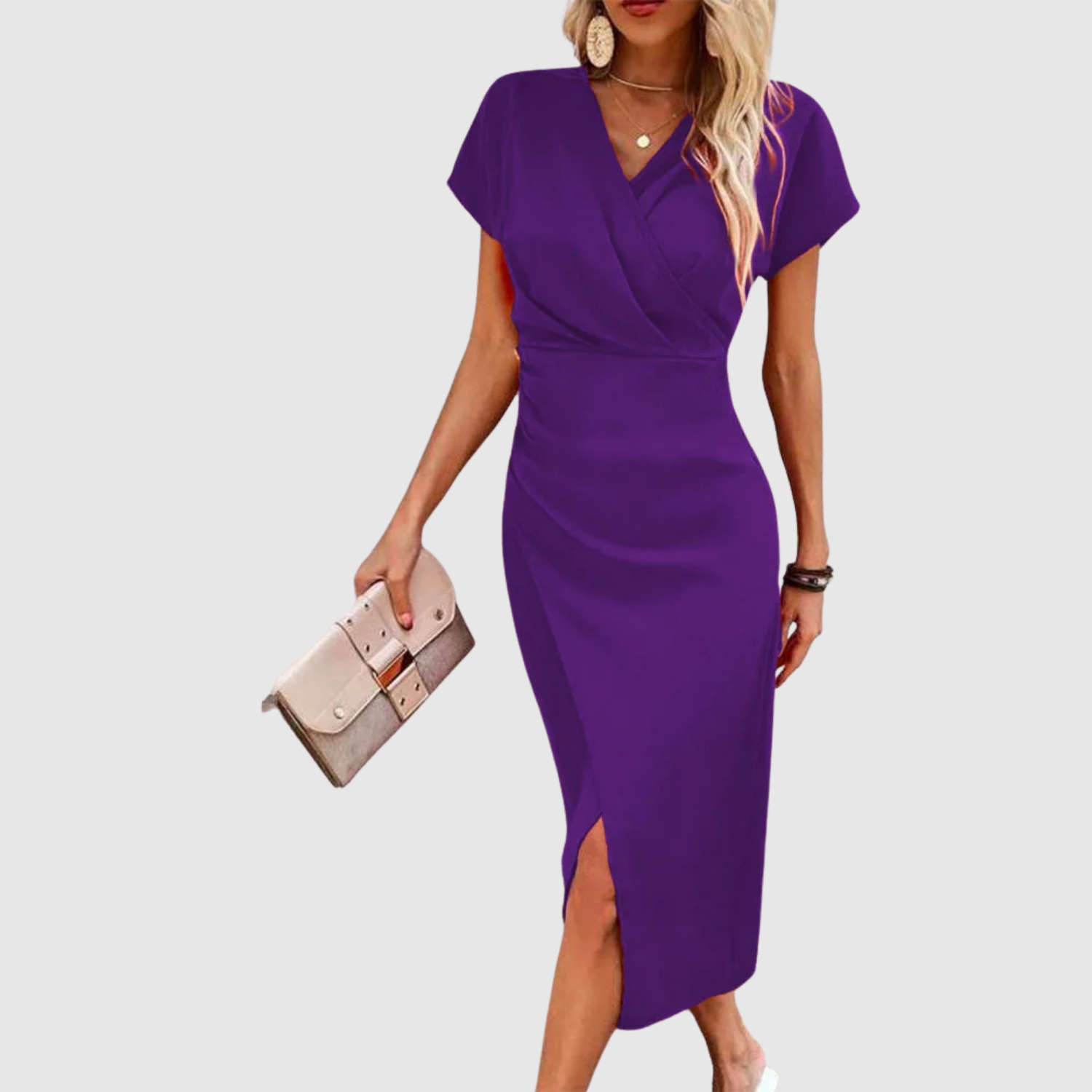 Вечна рокля с фигурална кройка, която подчертава силуета по най-красивия начин. V-образното деколте и елегантният силует я правят идеална както за ежедневна употреба, така и за празнични поводи. Материята е гъвкава и удобна, така че да можеш да се движиш свободно през целия ден.