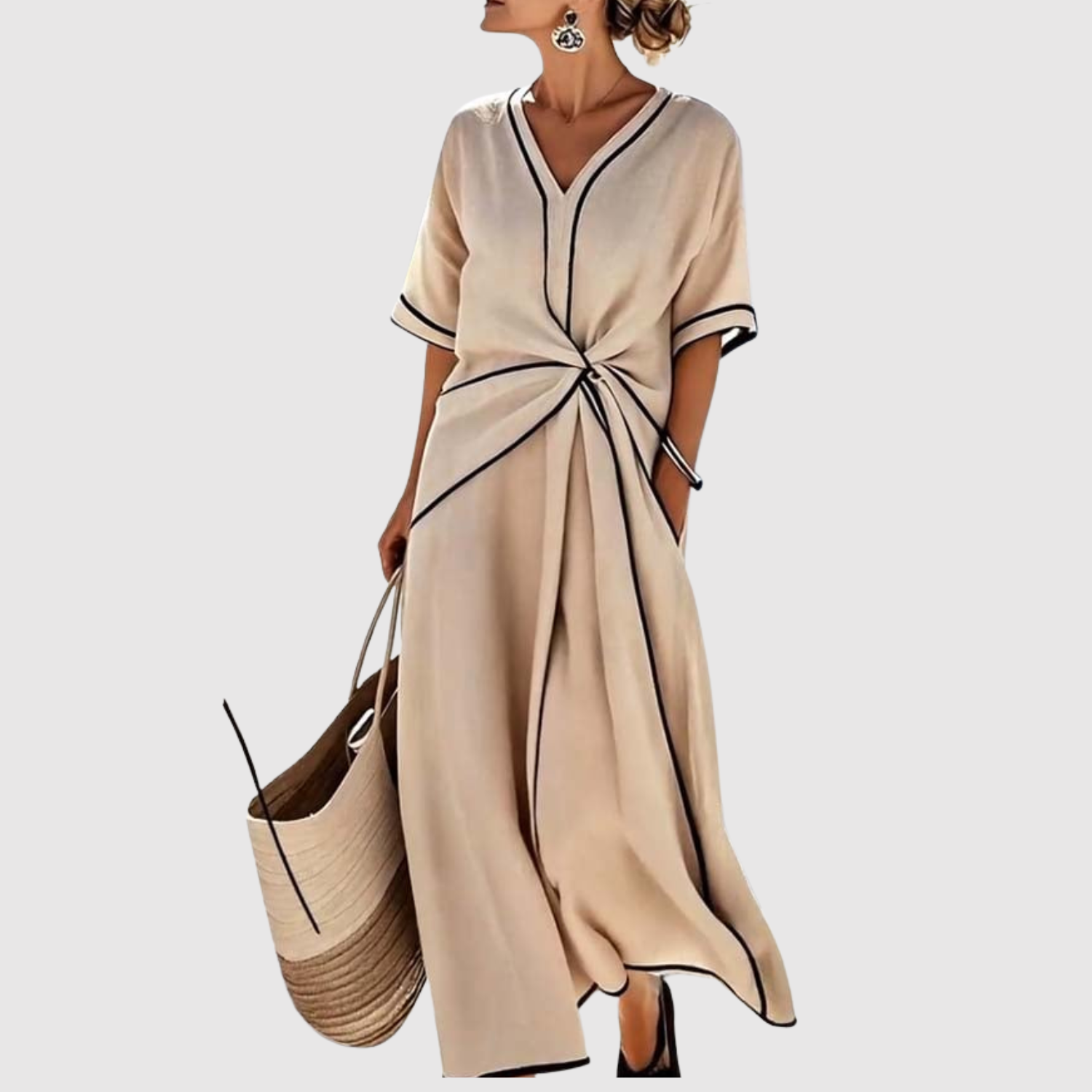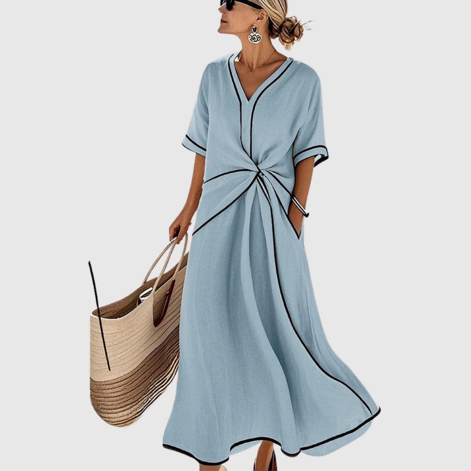 Тази рокля е олицетворение на свежест и летен стил. С лек и плавен силует, който осигурява пълна свобода на движение, тя се откроява с елегантната си странична панделка, която подчертава силуета, както и с контрастни ръбове, които придават модерен вид. Перфектна за разходки, ваканции или неформални събирания – универсална рокля, която комбинира комфорт и изтънченост в едно дизайнерско решение.