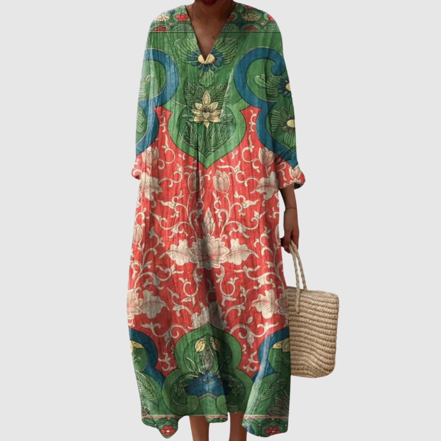 Тази макси рокля е идеалният избор за тези, които търсят комфорт, без да правят компромис със стила. С просторен и плавен кройка, която се адаптира към всяка силует, винтидж цветният принт в ярки нюанси придава бохемски и оригинален вид. Перфектна за летни разходки, плажни излети или за да се откроите с небрежен вид с артистичен акцент.