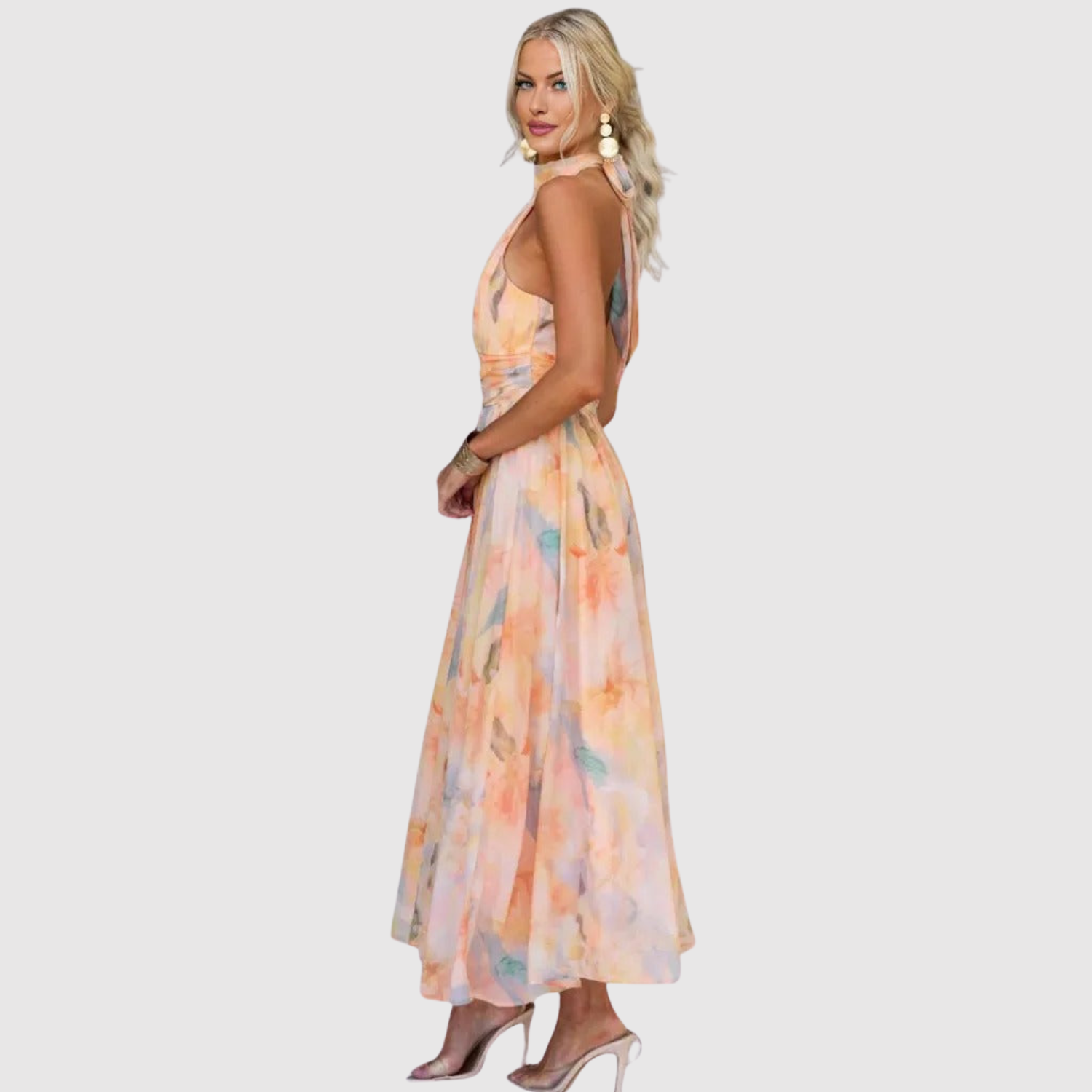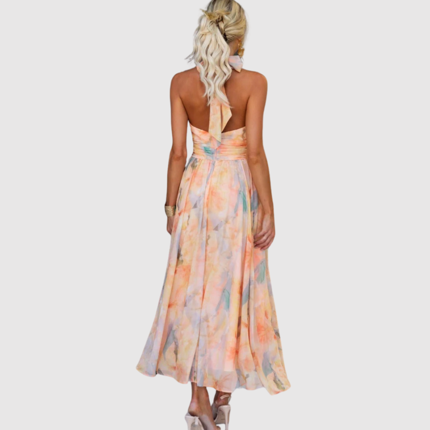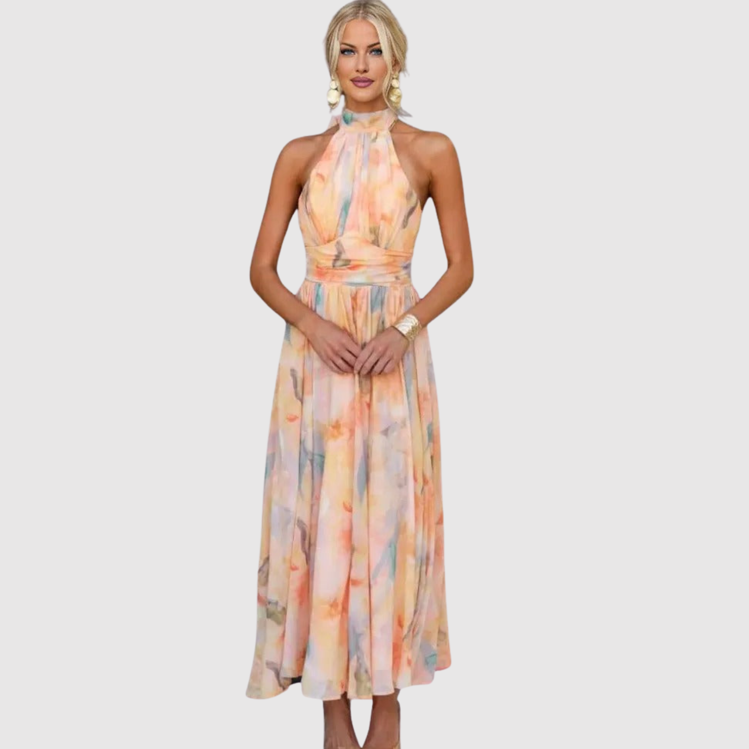 Роклята Блосом е идеалният избор за специални поводи или летни дни, когато искате да се откроите със стил. Миди-дългият кройка и елегантният халтер подчертават фигурата, докато мекото принт в пастелни цветове придава романтичен и изискан вид. Изработена от леко и течащо платно, което гарантира комфорт и свежест през целия ден.