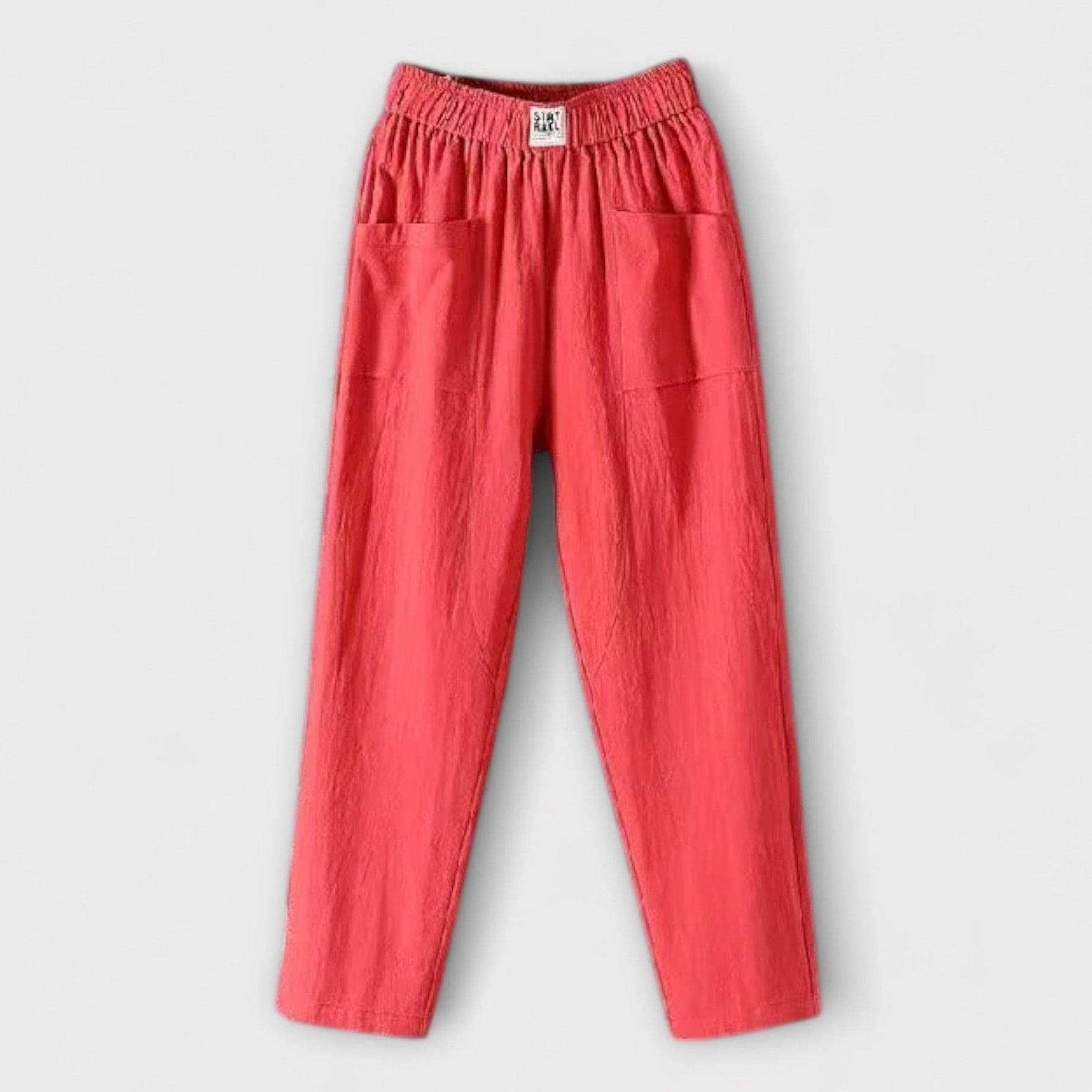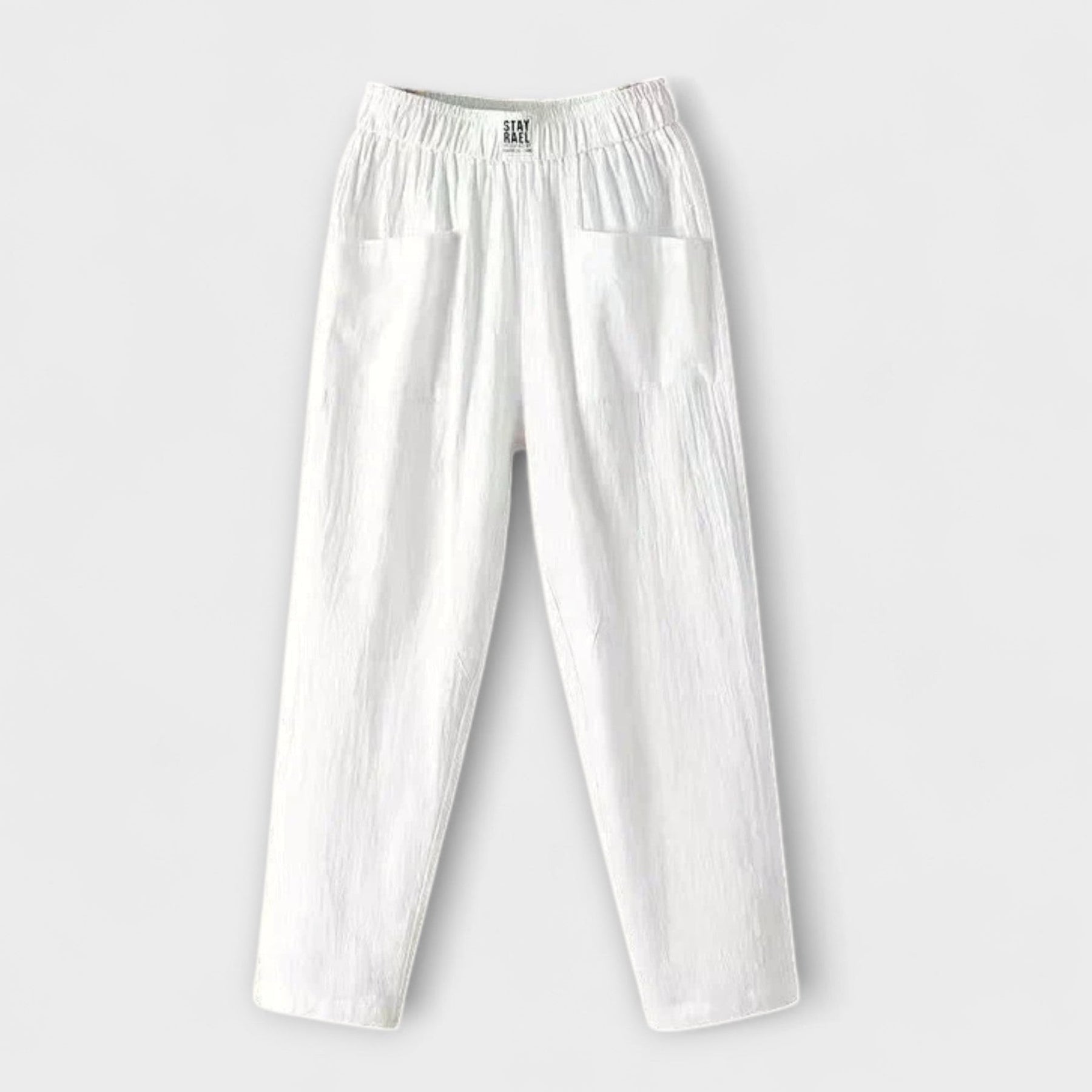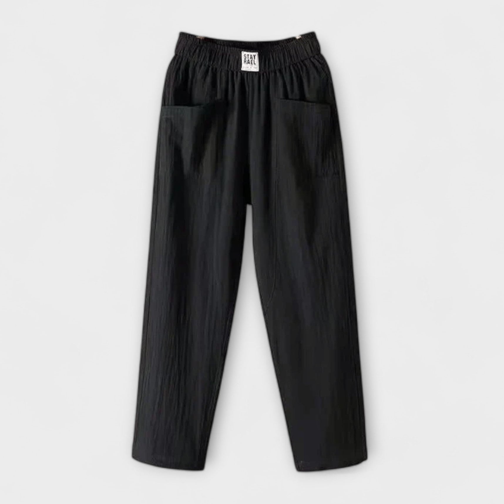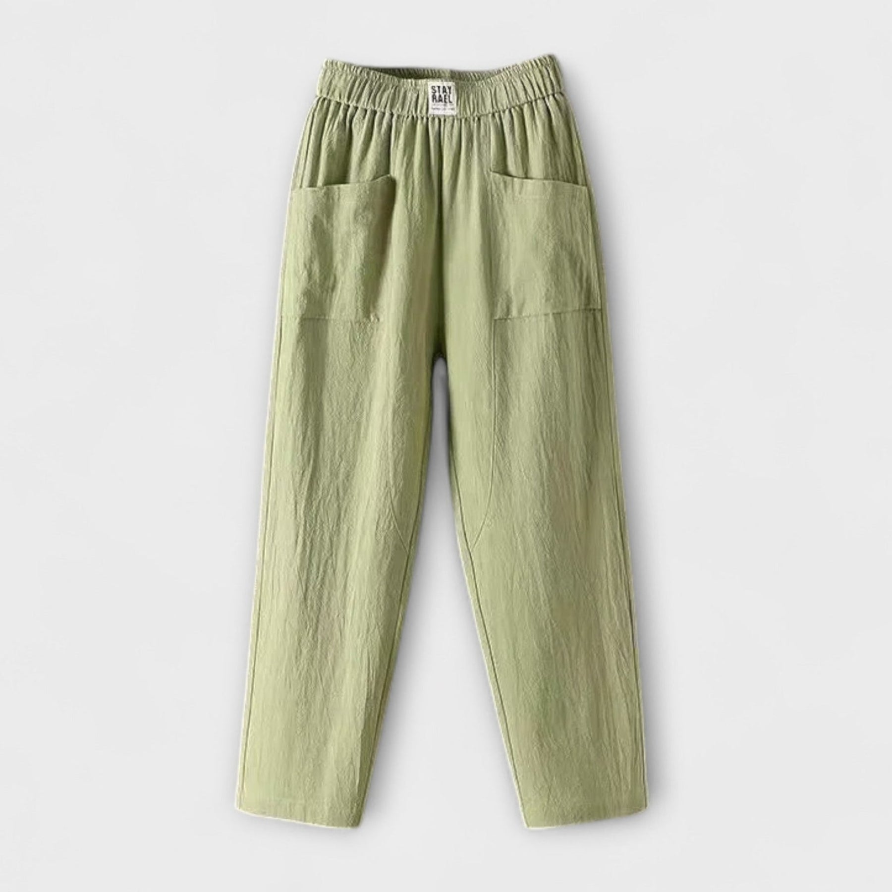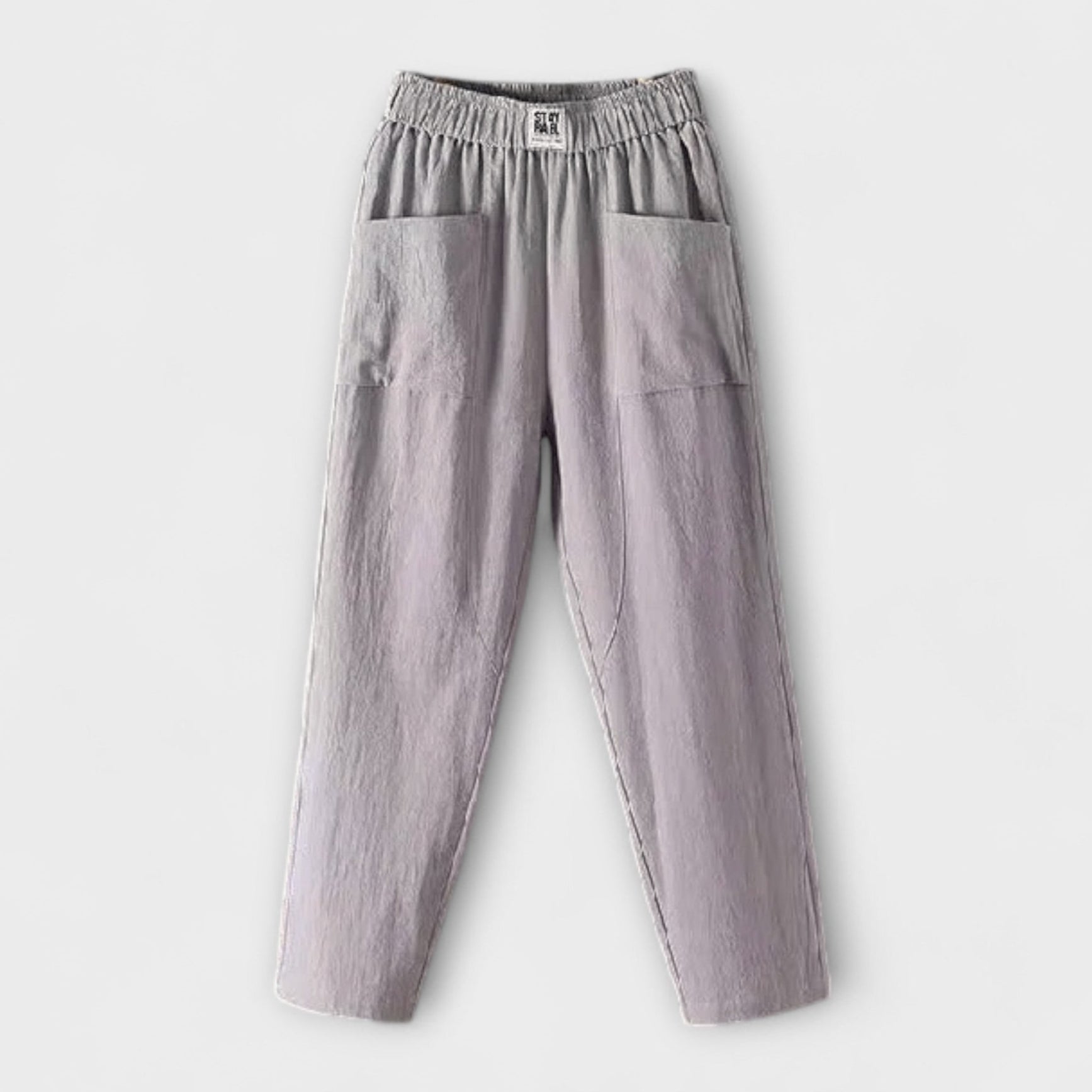 Насладете се на перфектния баланс между свежест и стил с тези ленени панталони. Нехвърлящият им кройка и еластичният талия осигуряват свобода на движение и перфектно прилягане за всякакъв повод.