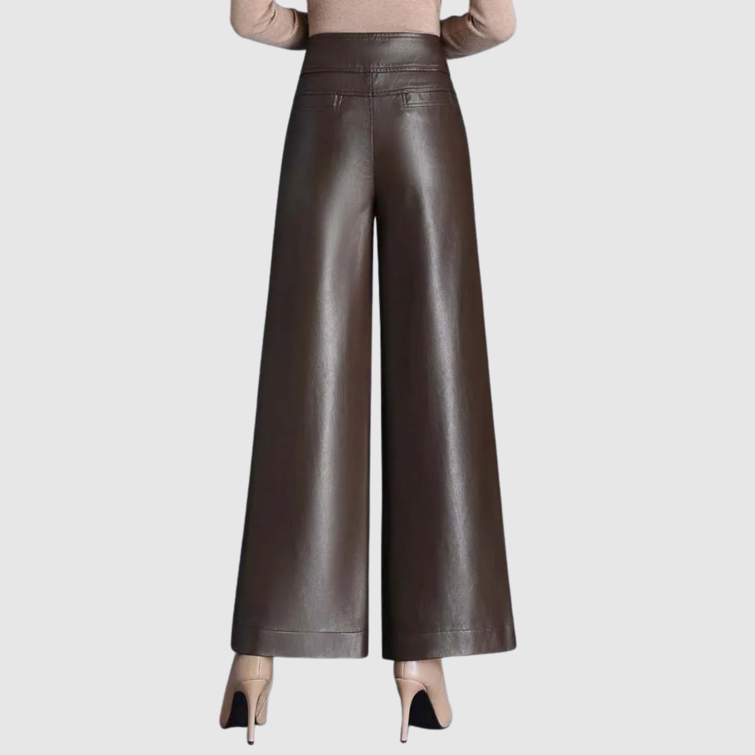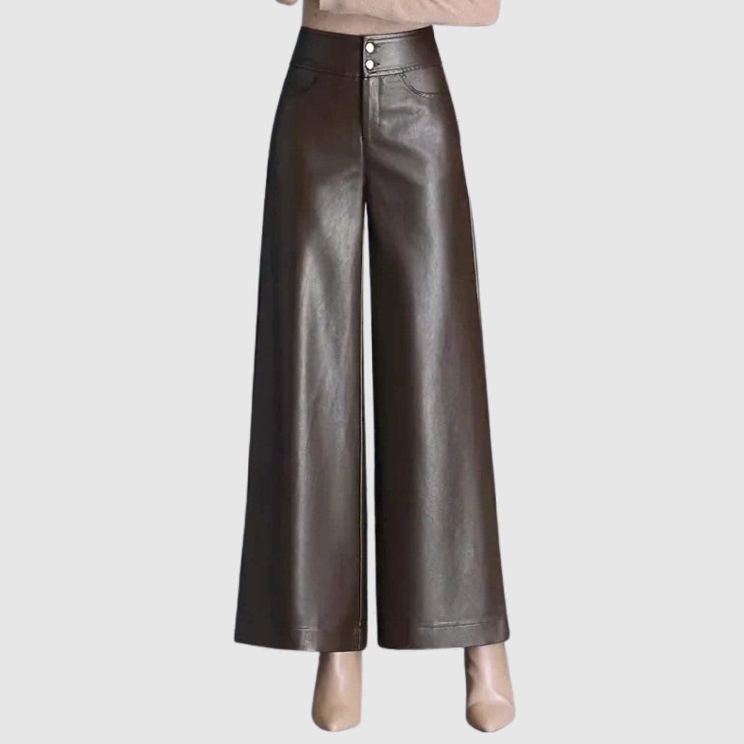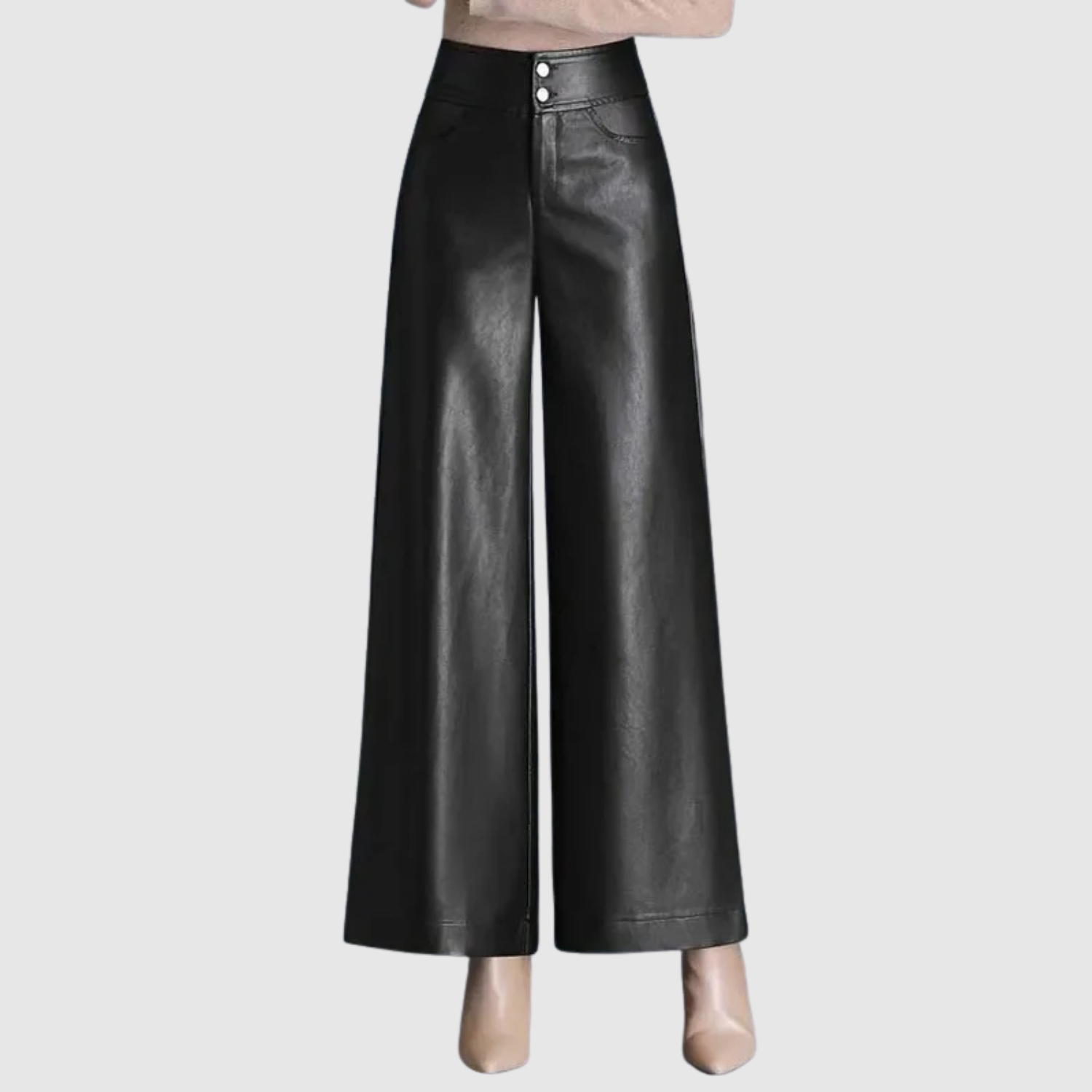 Тези панталони с кожен вид предлагат силен и модерен израз. С широка кройка и елегантно завършване, те са перфектни за повдигане на всяко облекло.