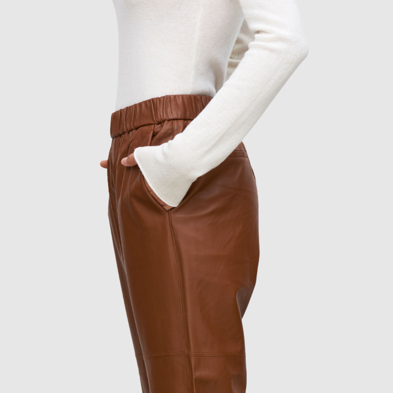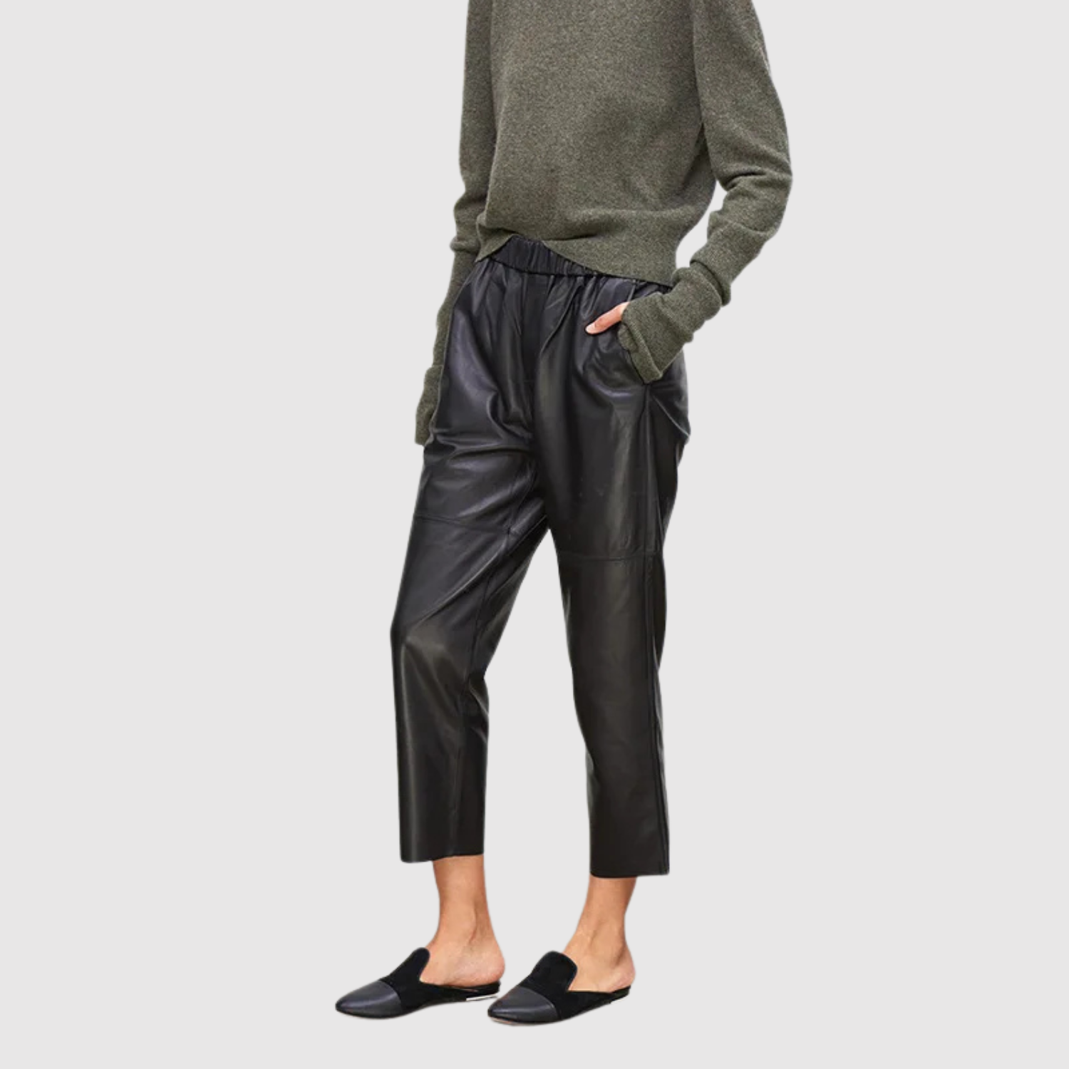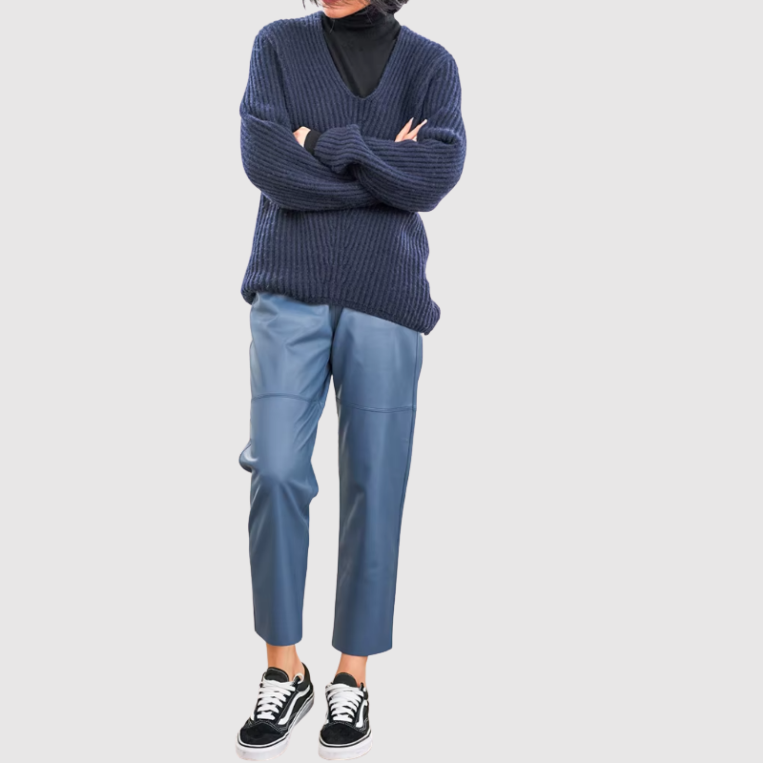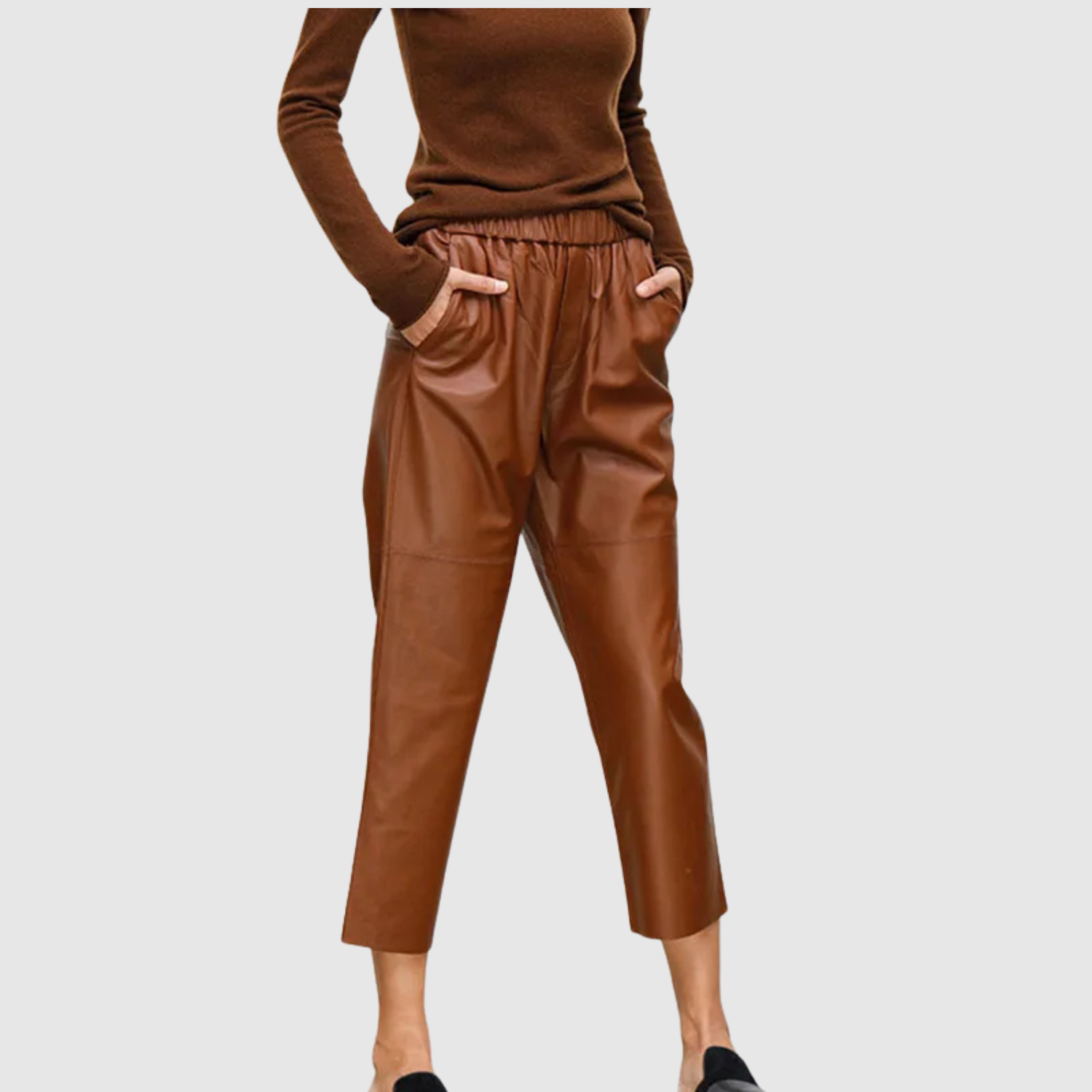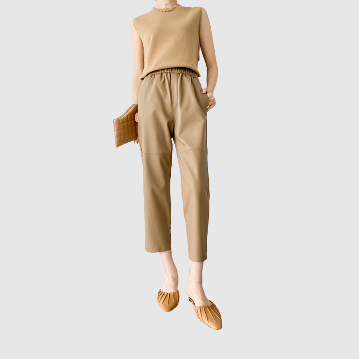 Тези панталони с кожен вид придават модерен и стилен вид. Еластичната талия осигурява комфорт, така че да можеш да ги носиш през целия ден с лекота.