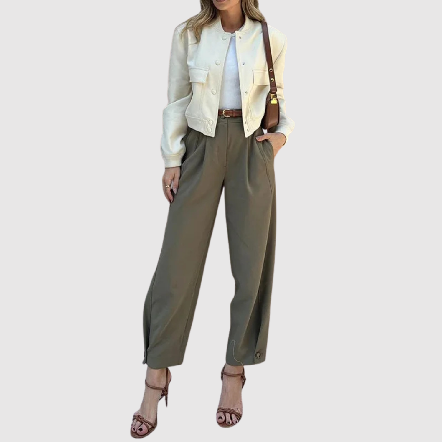 Тези панталони съчетават минималистичен вид с релаксиран силует. Те са удобни за ежедневно носене и лесни за стилизиране с различни аутфити.