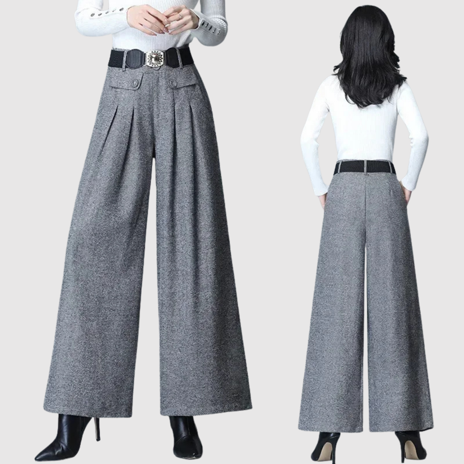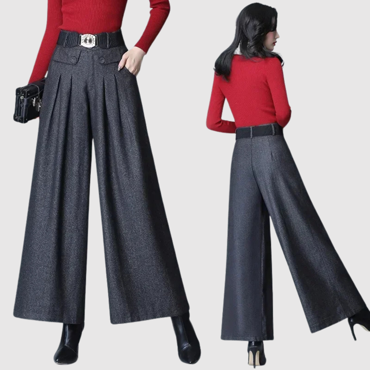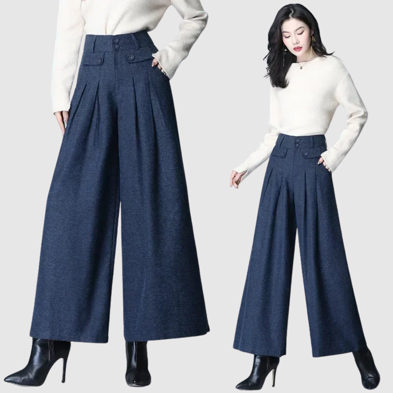 Тези широки панталони с висока талия предлагат изискан и модерен вид. Те са перфектни за работа и вечери навън, където стилът и комфортът вървят ръка за ръка.