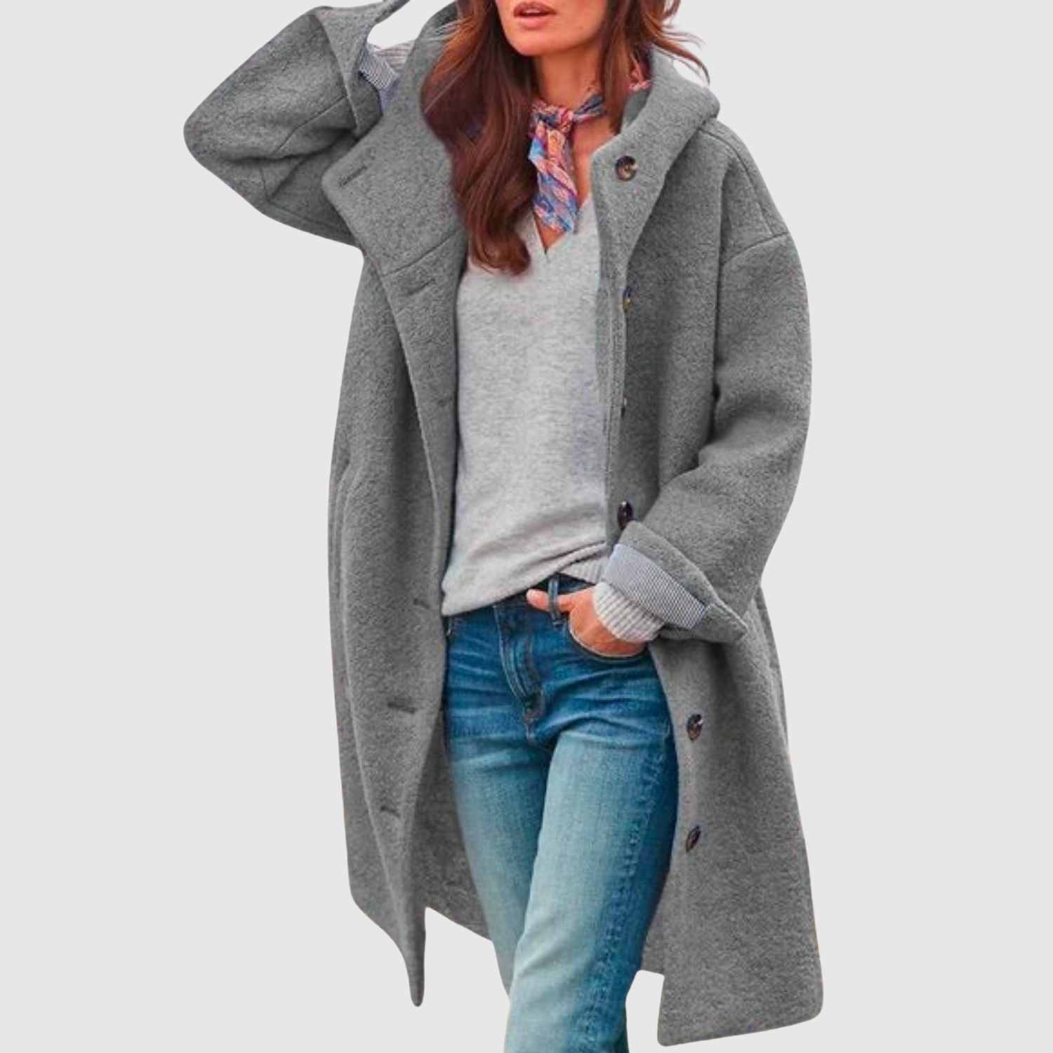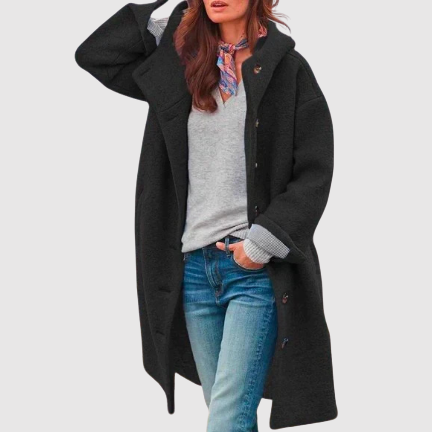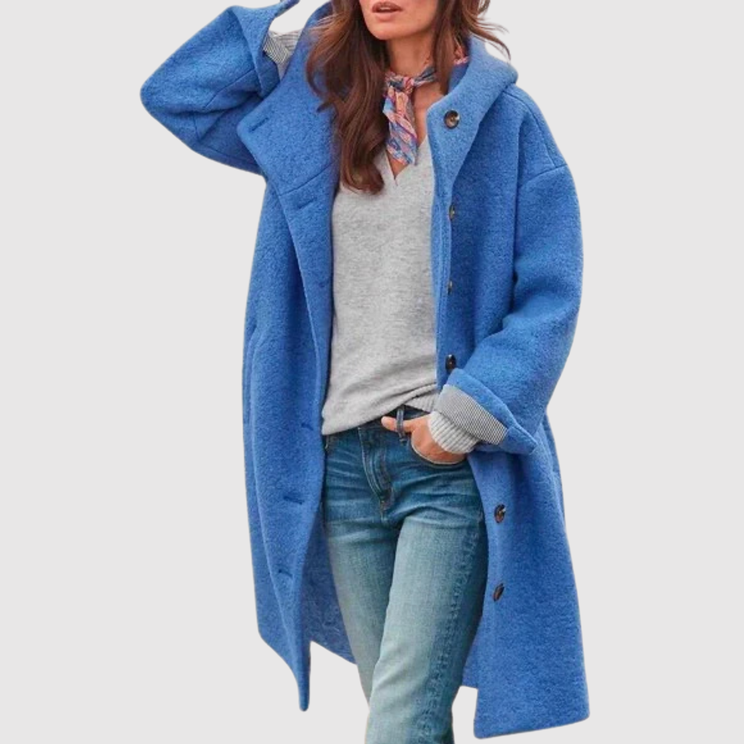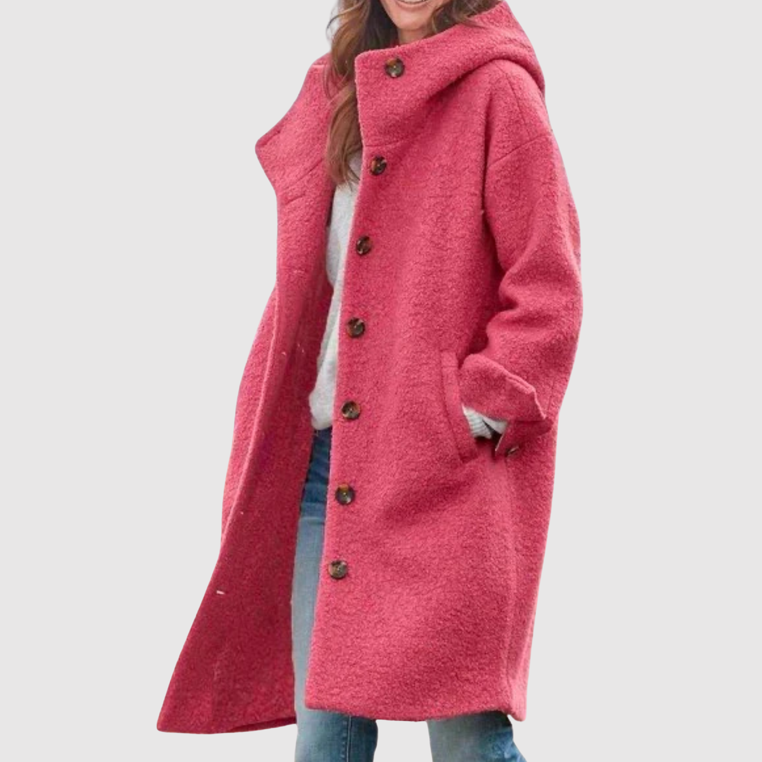 Тази букле палто за жени комбинира мек комфорт с безвременна елегантност. Просторната кройка и практичната качулка я правят идеална за студени дни, докато изразителните копчета придават женствен и изискан вид. Перфектна за ежедневна употреба и уютни вечери.