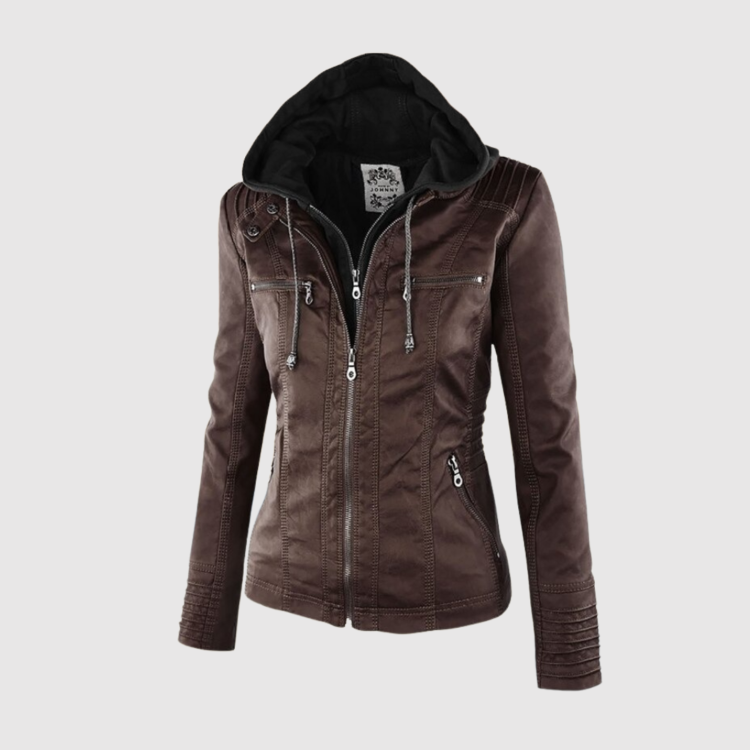 Тази дамска яке комбинира модерен кожен вид с практични детайли като качулка и джобове с цип. Фигураното кроене подчертава силуета, докато мекото материало осигурява комфорт през целия ден. Перфектно за ежедневна употреба и вечерни излизания, когато искате женствен вид с нотка на атитюд.