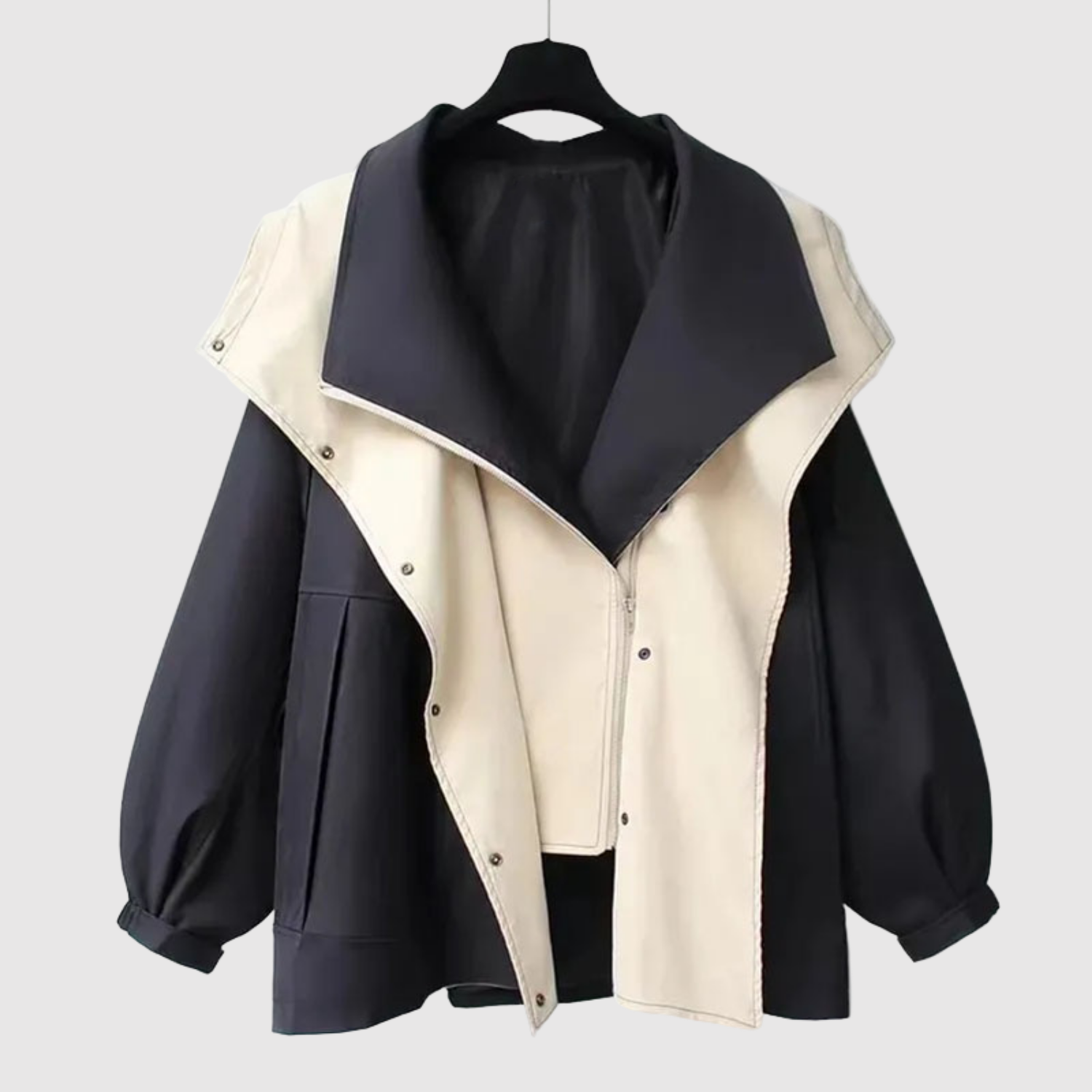 Това дълго яке се откроява с уникалния си бицветен дизайн и свободна кройка. Широката качулка придава модерен вид и допълнителен комфорт в прохладни дни. Идеално за вас, които искате модерен акцент в гардероба, без да правите компромис с функционалността.