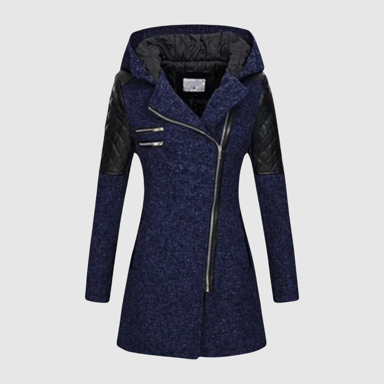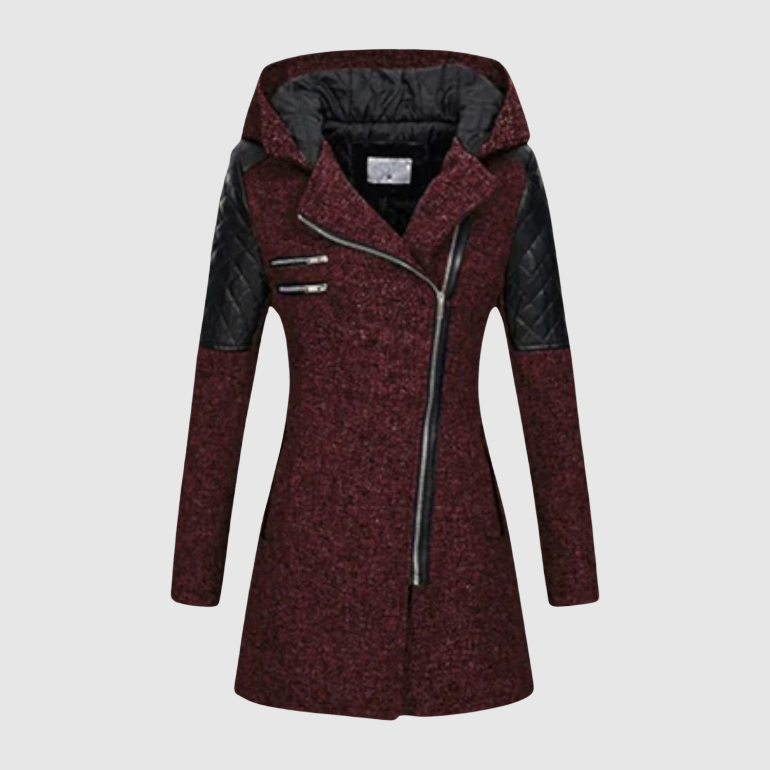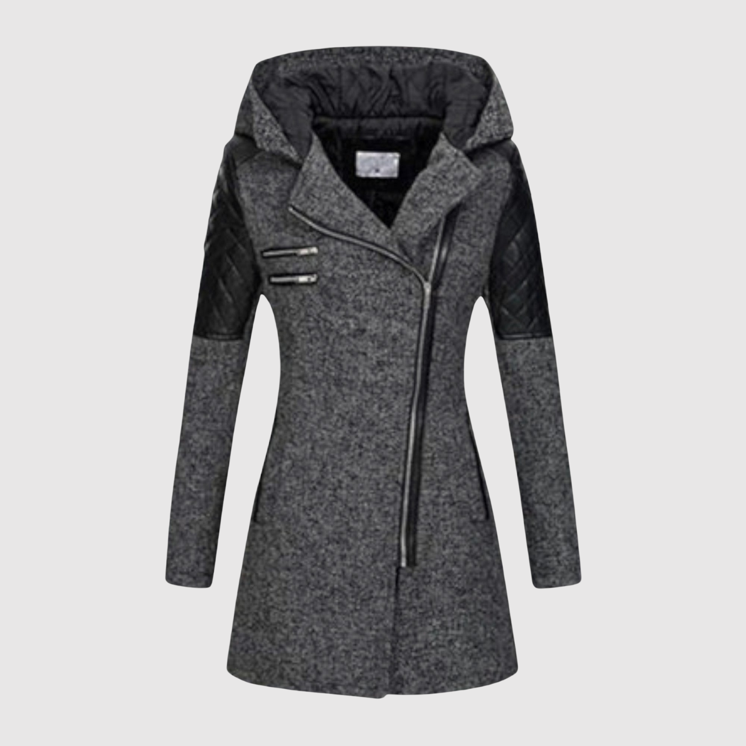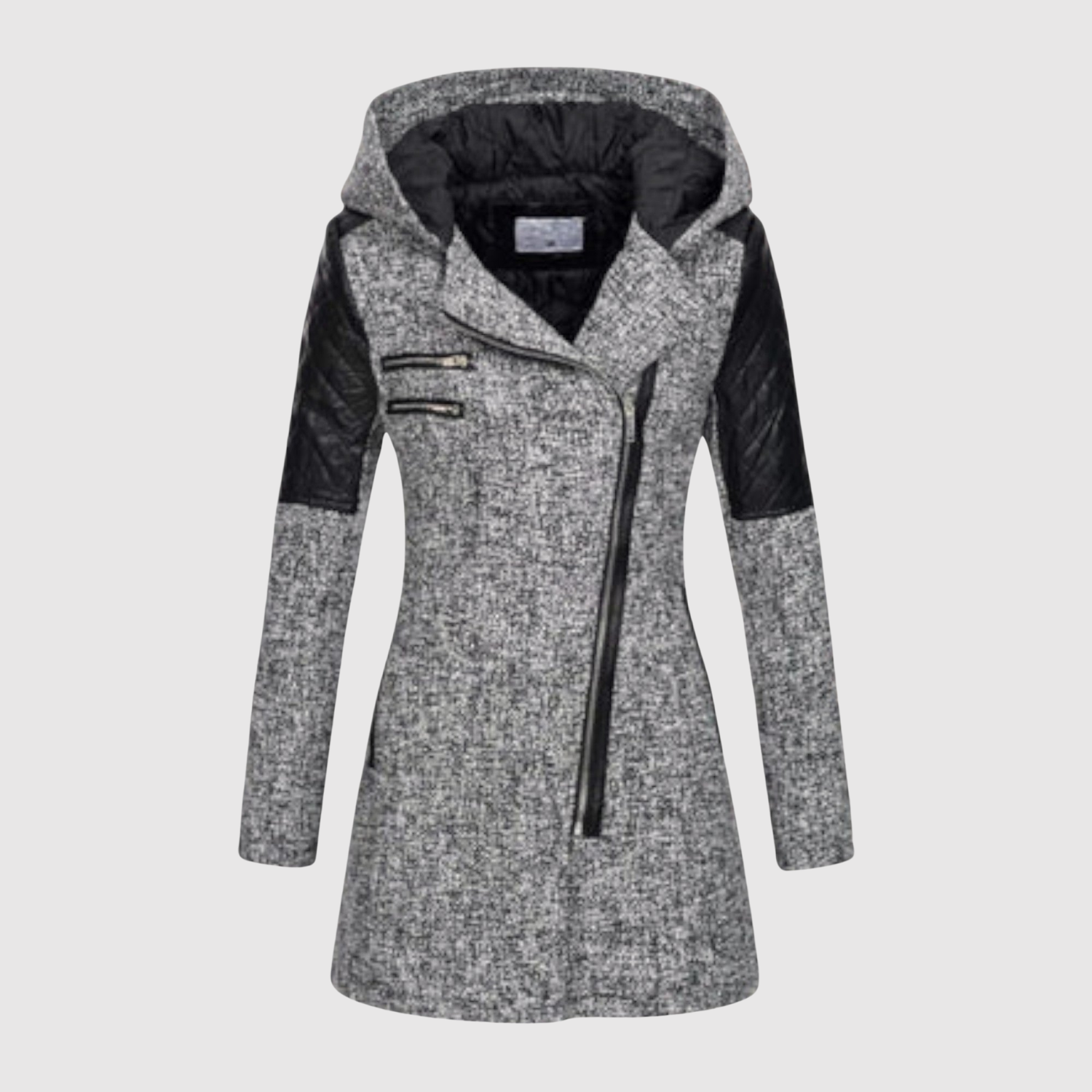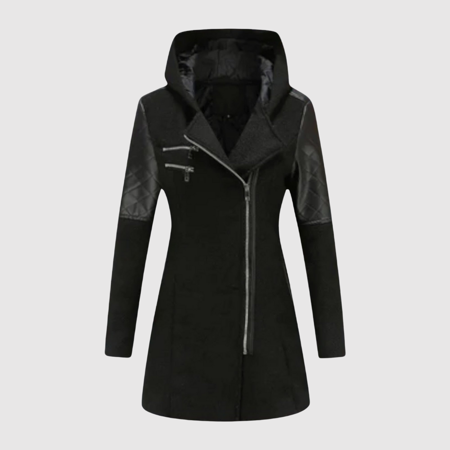 Това дълго яке комбинира модерен дизайн с практични детайли. Асиметричният цип и фигуралният силует придават модерен вид, докато подплатеният материал и качулката осигуряват топлина и комфорт в студено време.