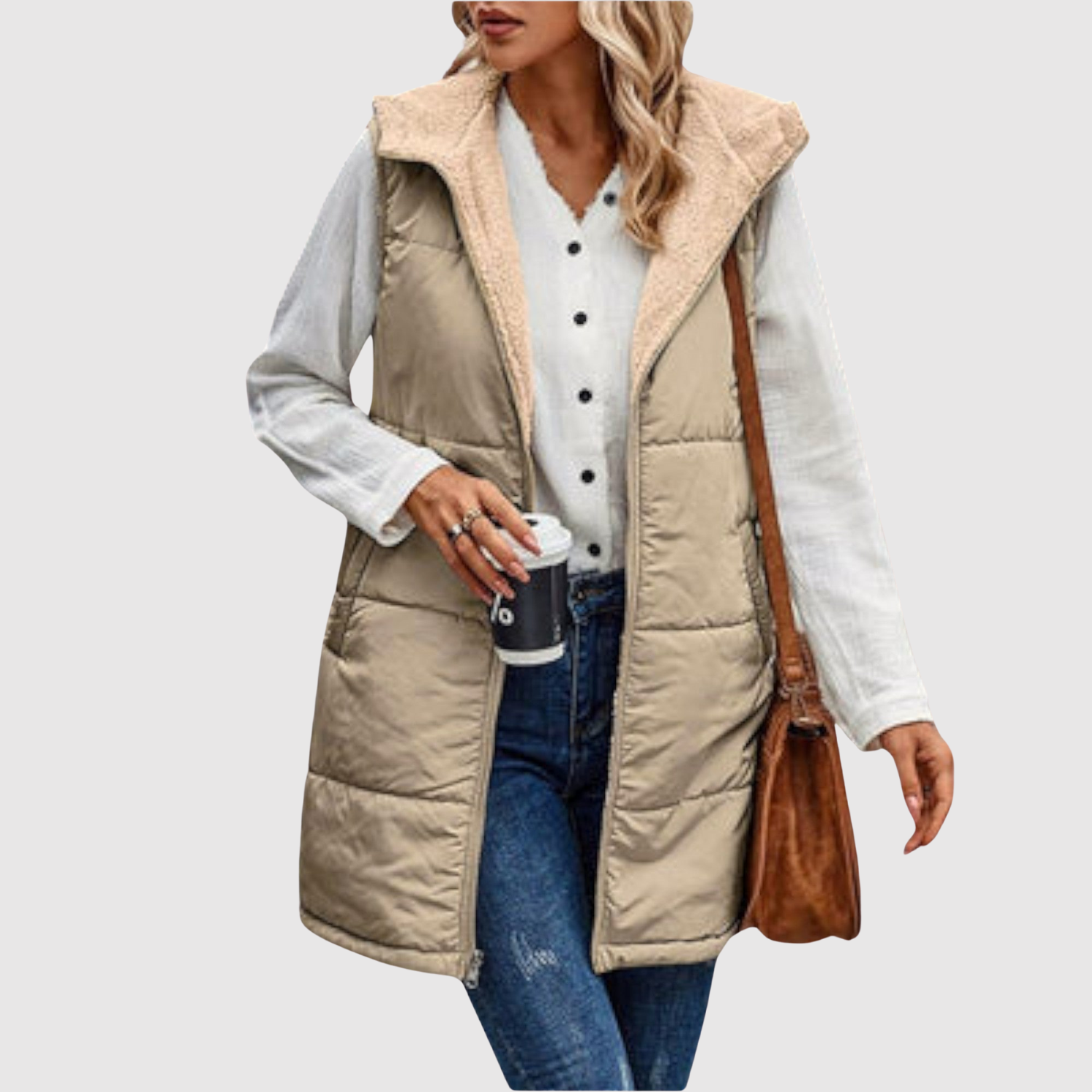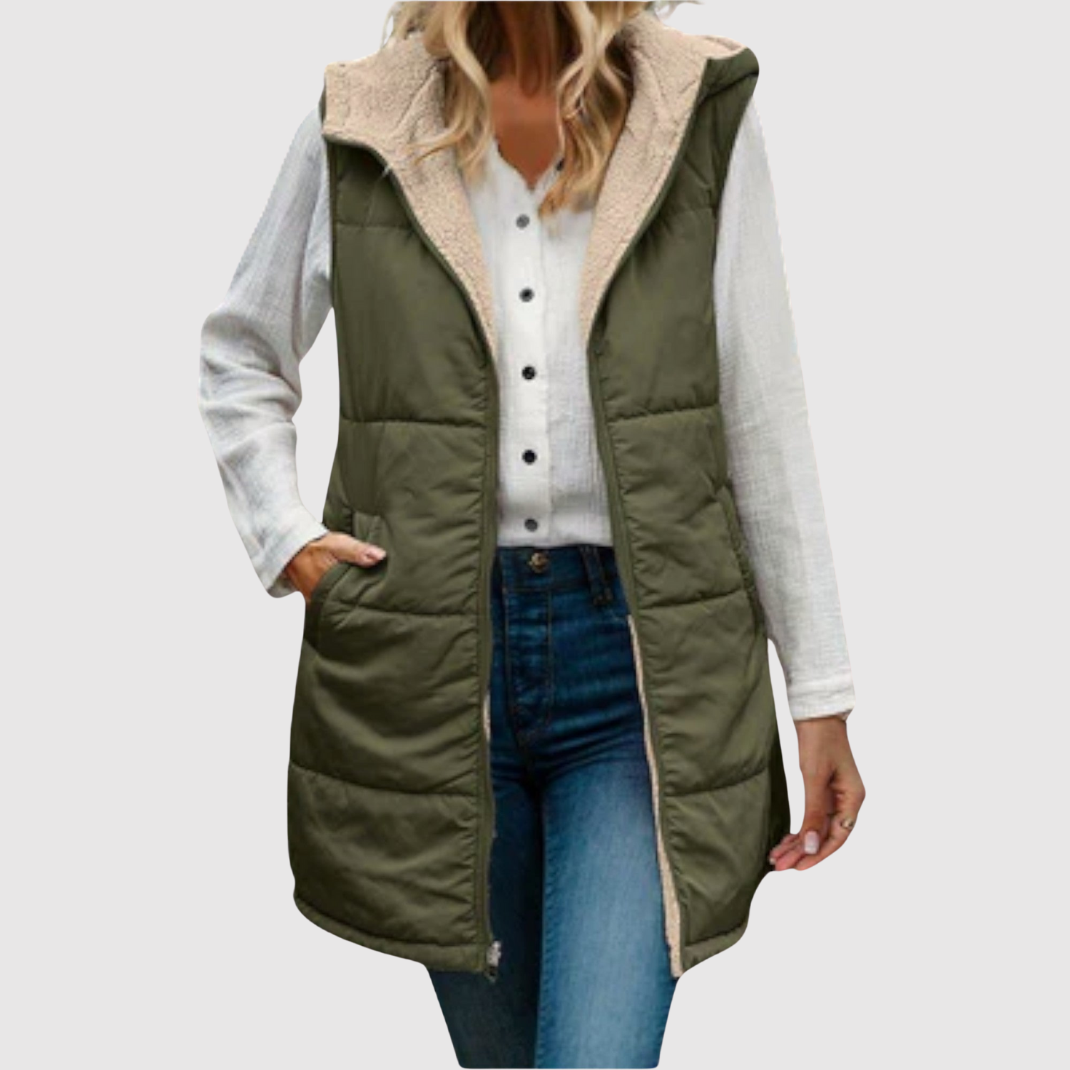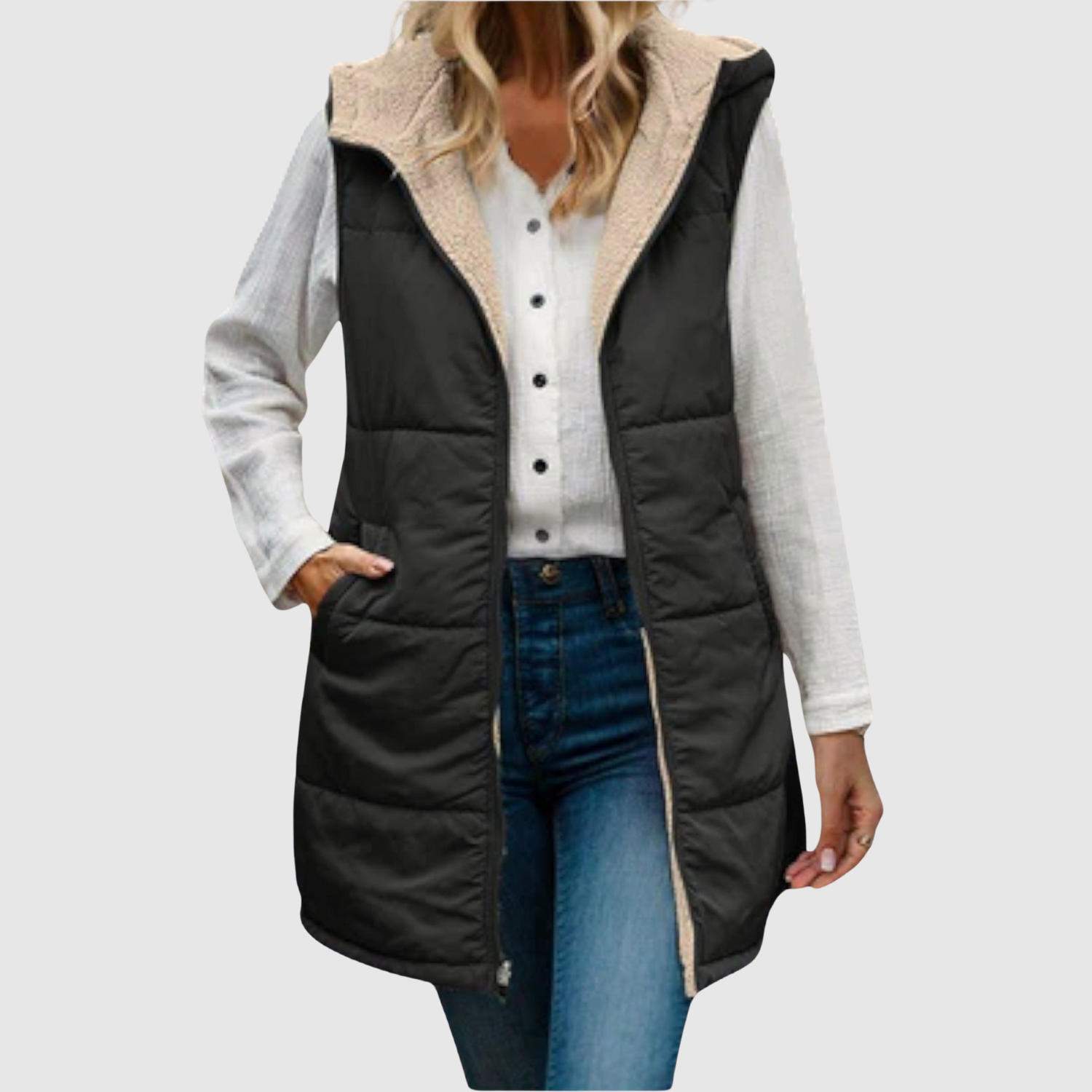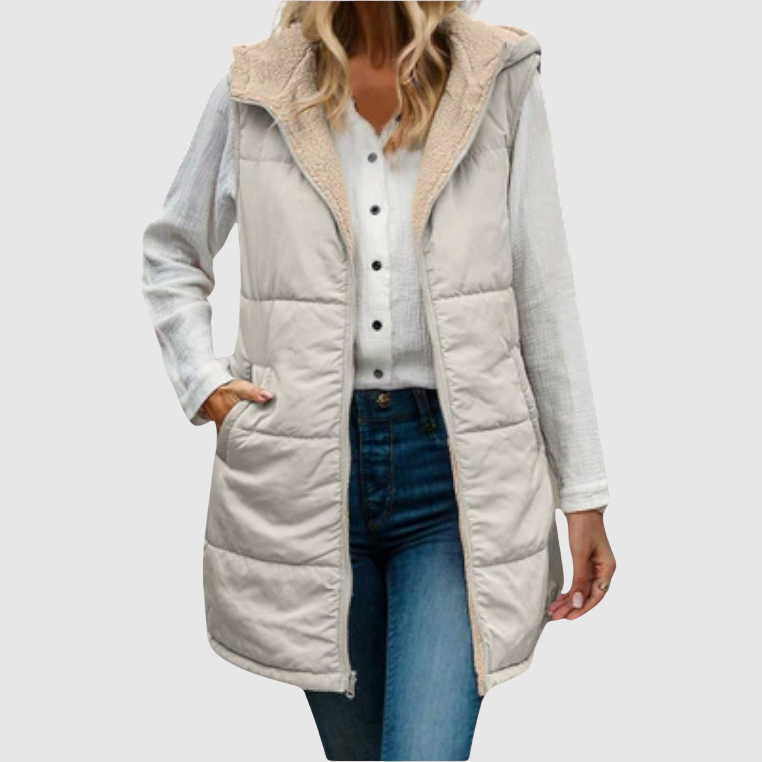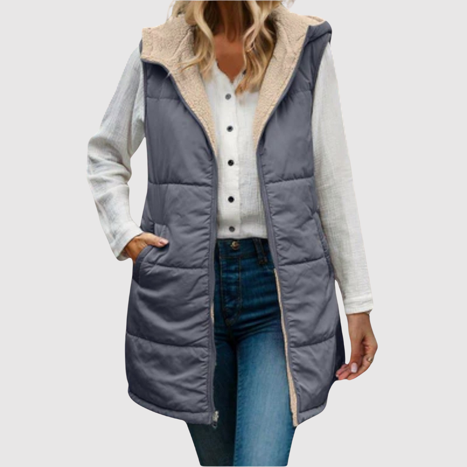 Тази дълга жилетка е перфектна за стилизиране на слоеве през есента или като допълнителна топлина под палто. Тя е леко подплатена, има практични джобове и качулка, която предпазва от времето.