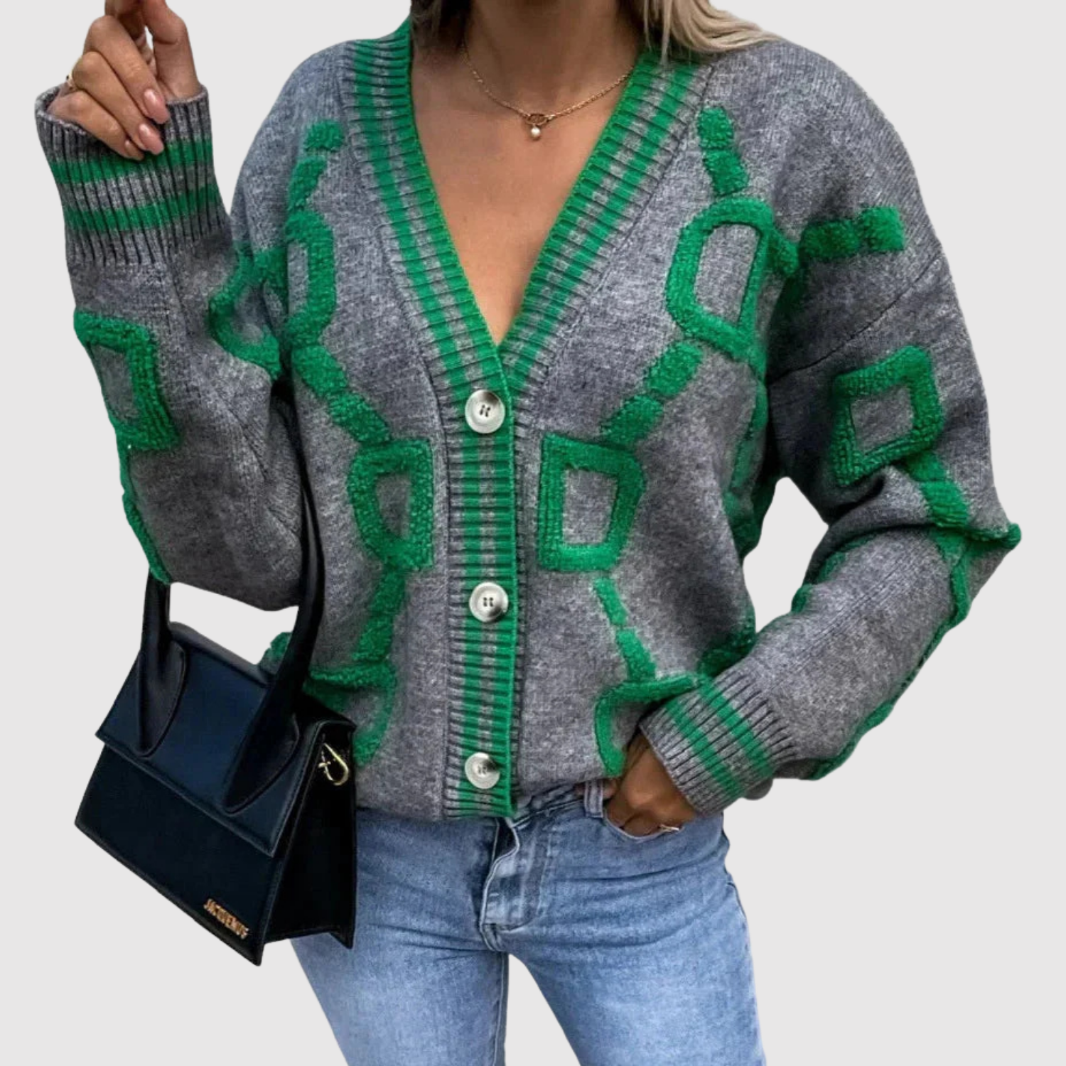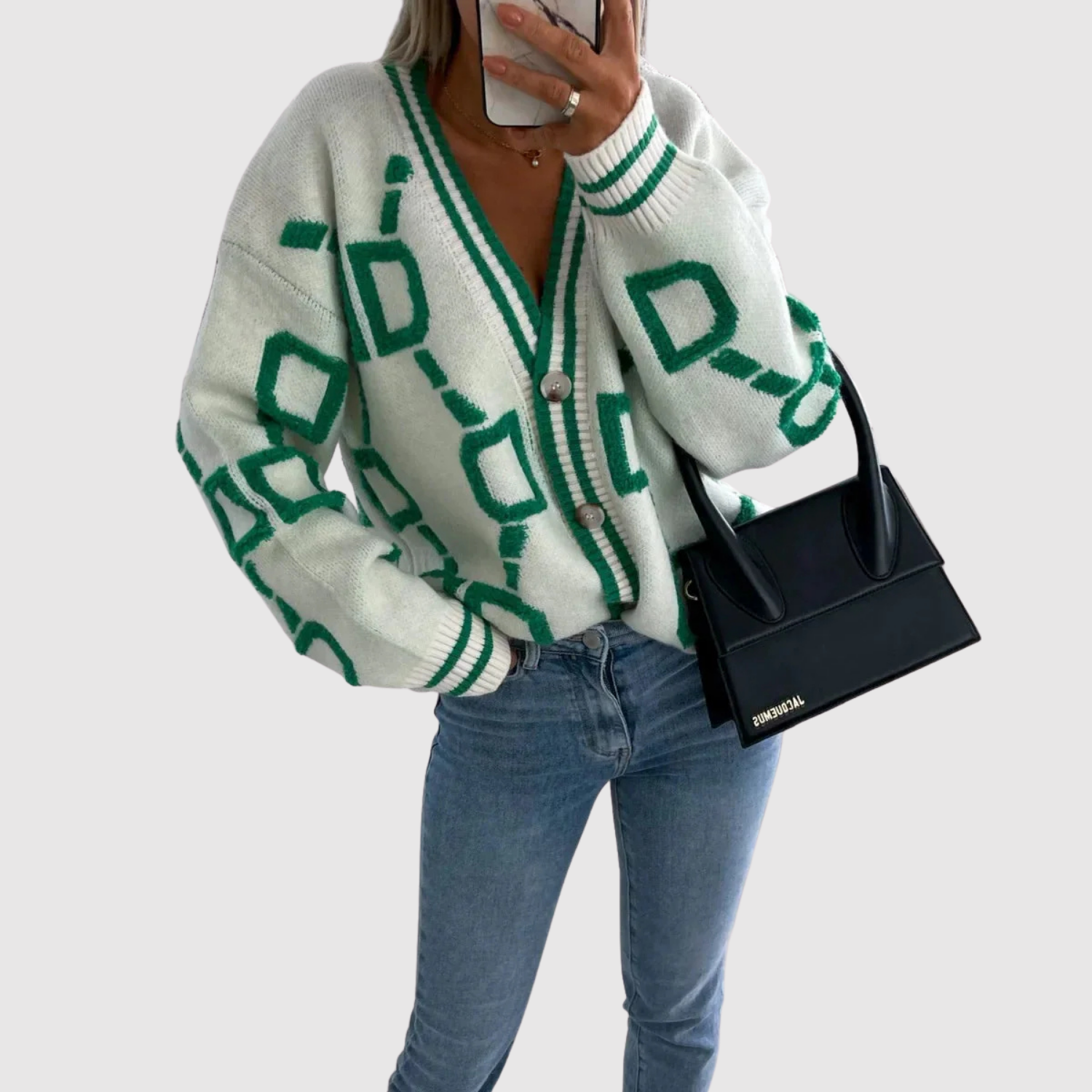 Ярък и привлекателен кардиган с уникален графичен модел. Комбинира комфортно трико с стилен дизайн, идеален както за ежедневието, така и за по-неформални поводи.