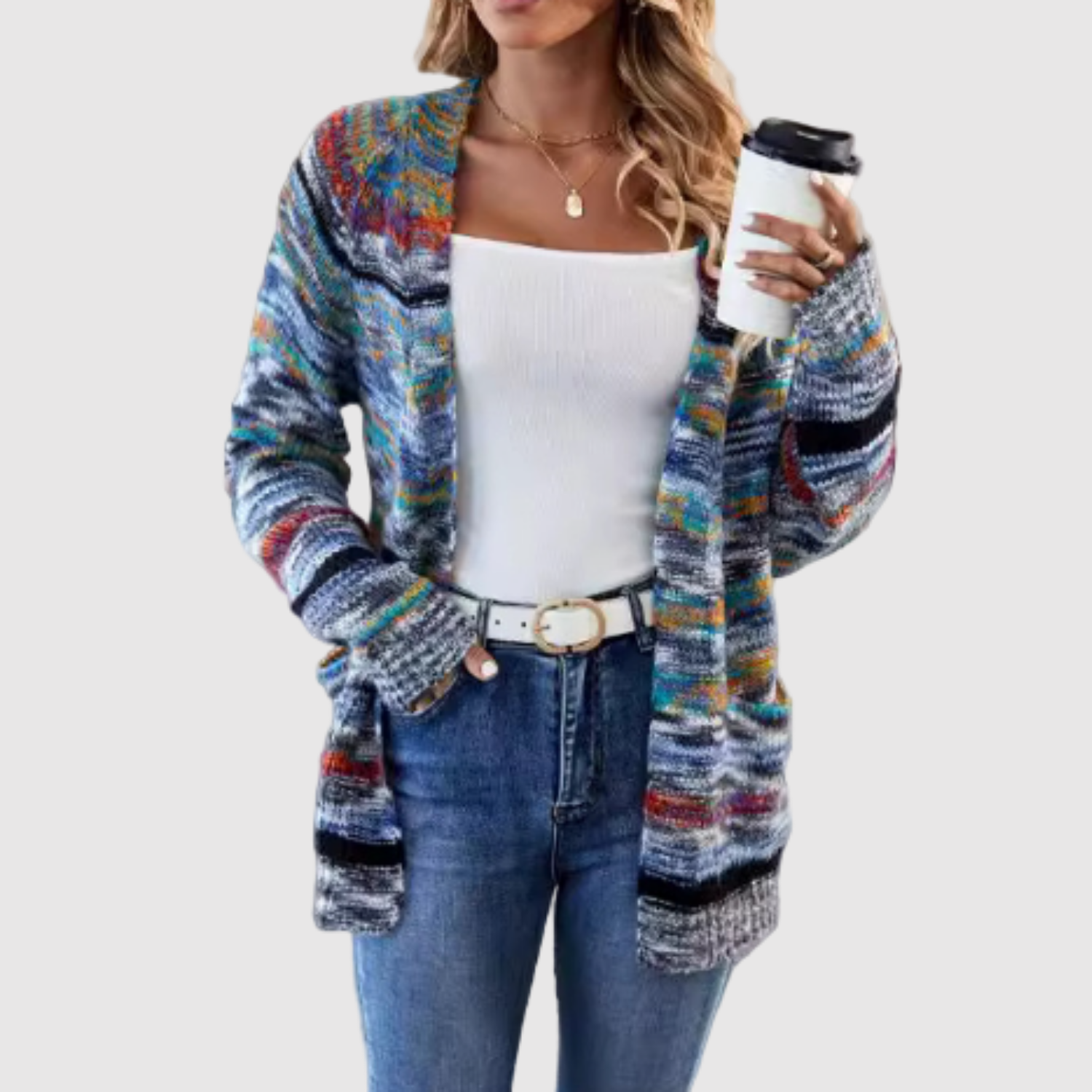 Този кардиган комбинира лекота и комфорт с ярък, многоцветен дизайн. Той е перфектен за създаване на свеж и уникален вид, независимо дали го носите всеки ден или като акцент в облеклото.