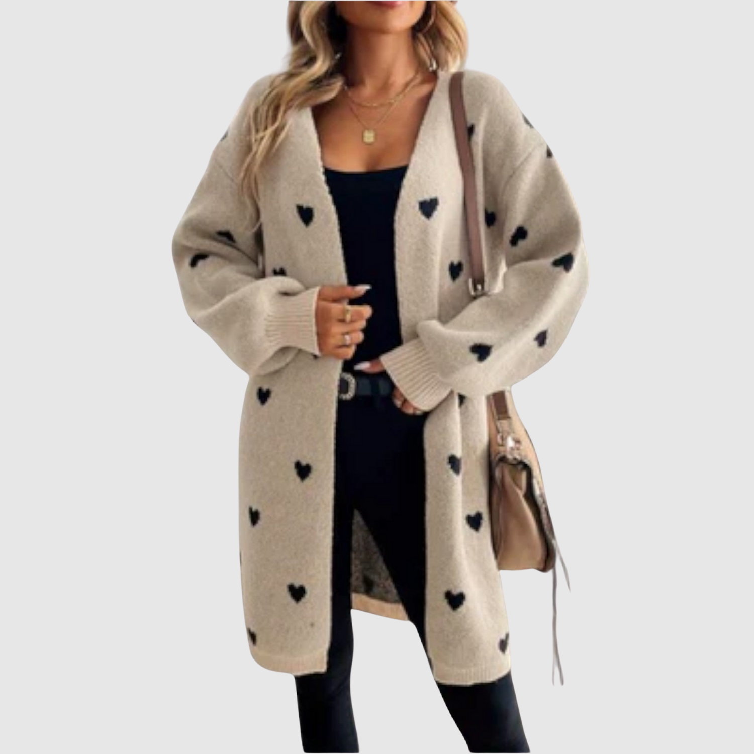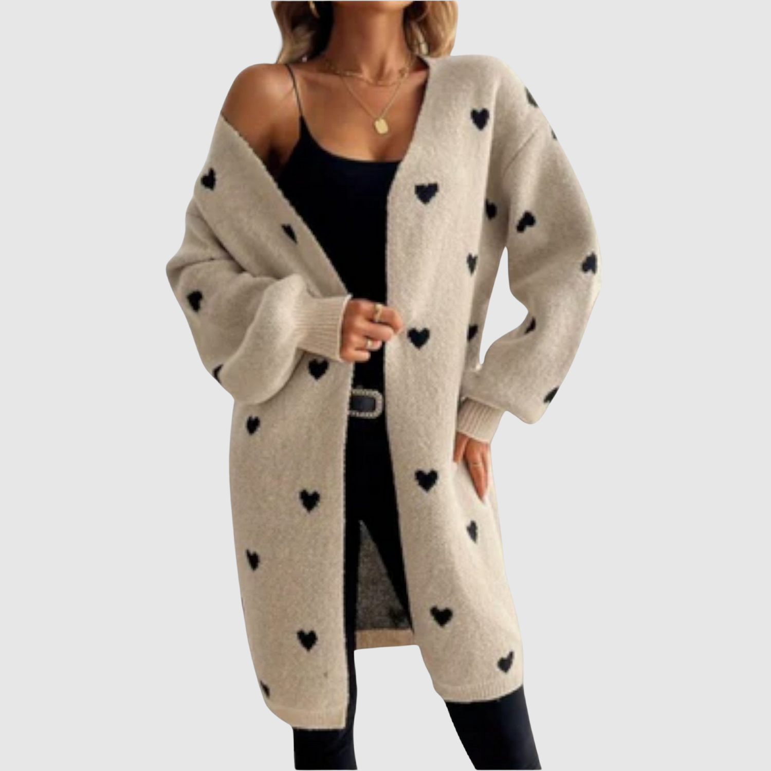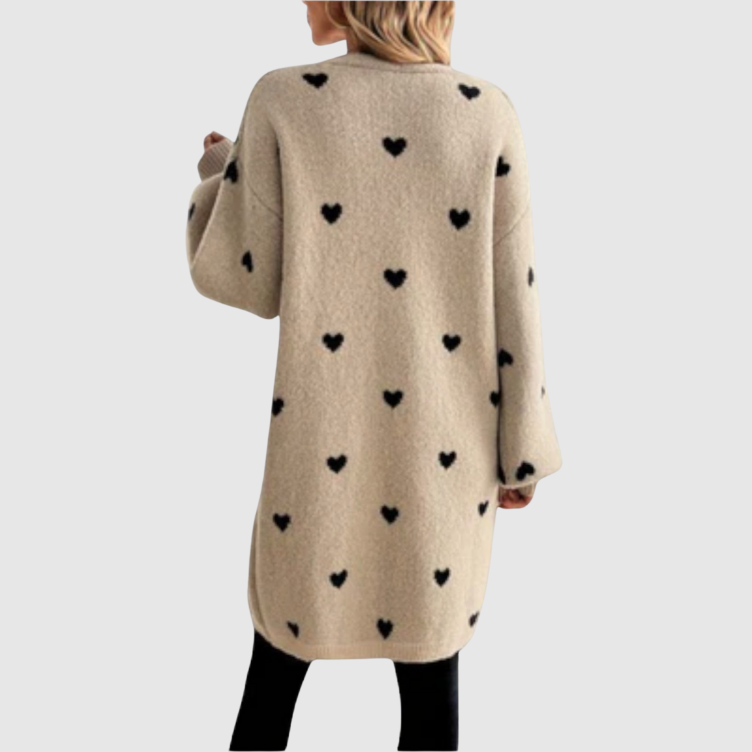 Този кардиган съчетава топлина, комфорт и игрив дизайн. Изработен е от меко плетиво с шарка от малки сърца, което придава женствен и уникален вид. Свободната кройка и дължината го правят идеален както за ежедневна употреба, така и за уютни вечери.