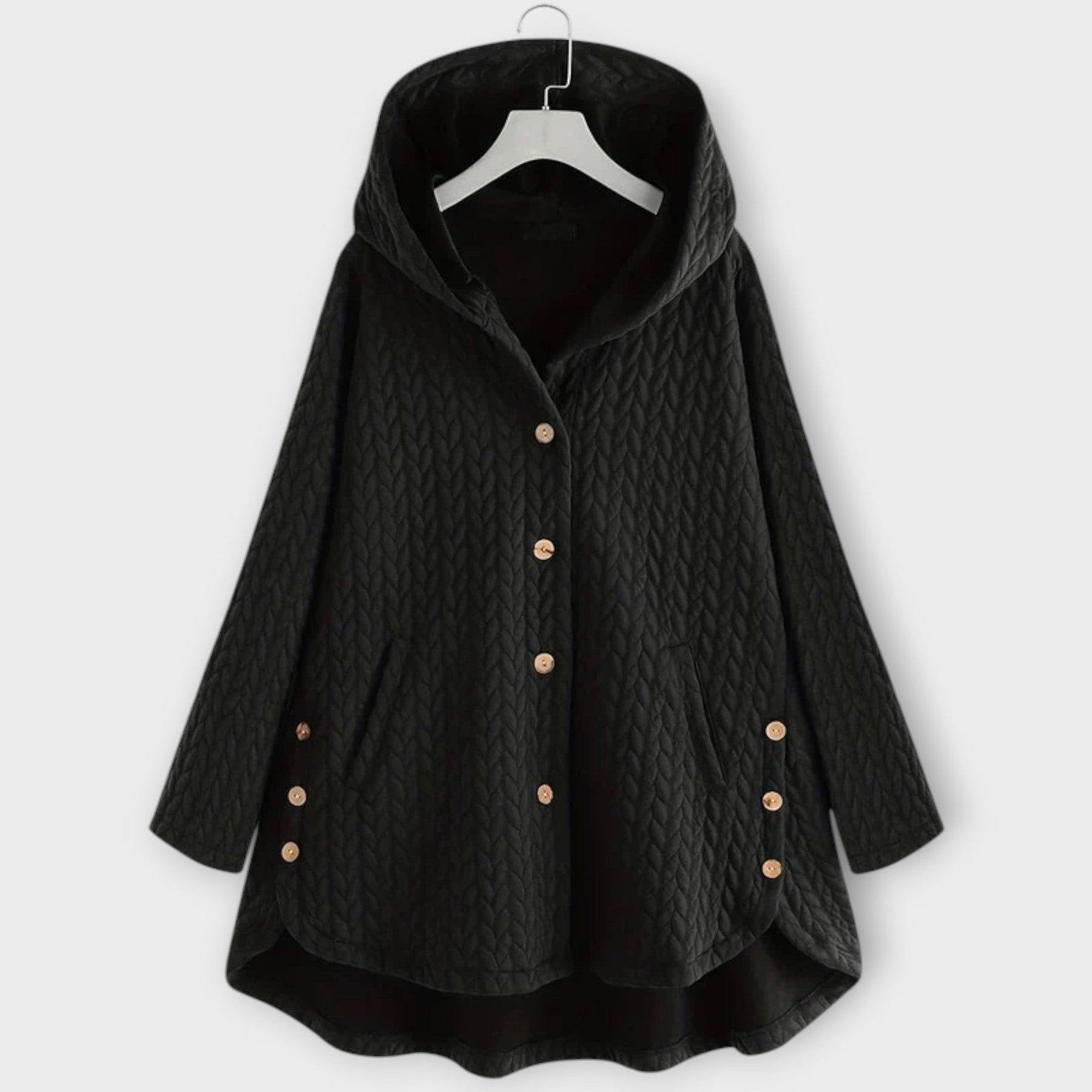 Stilīgs: Brīvs dizains ar priekšējām pogām un kapuci piešķir modernu akcentu.